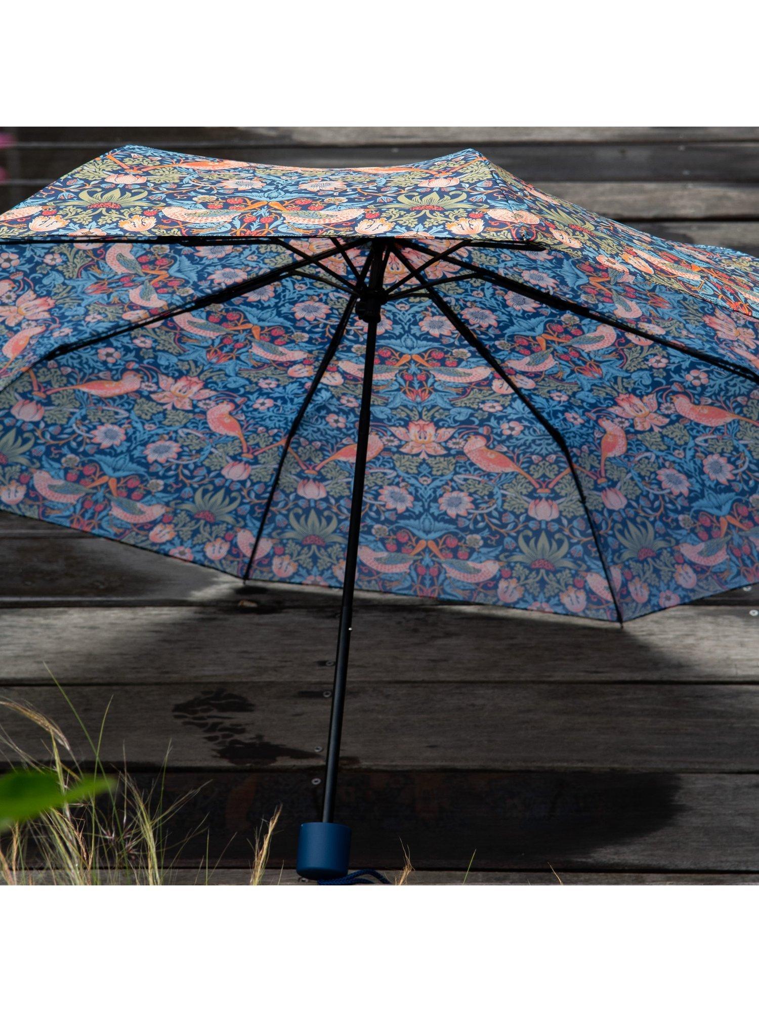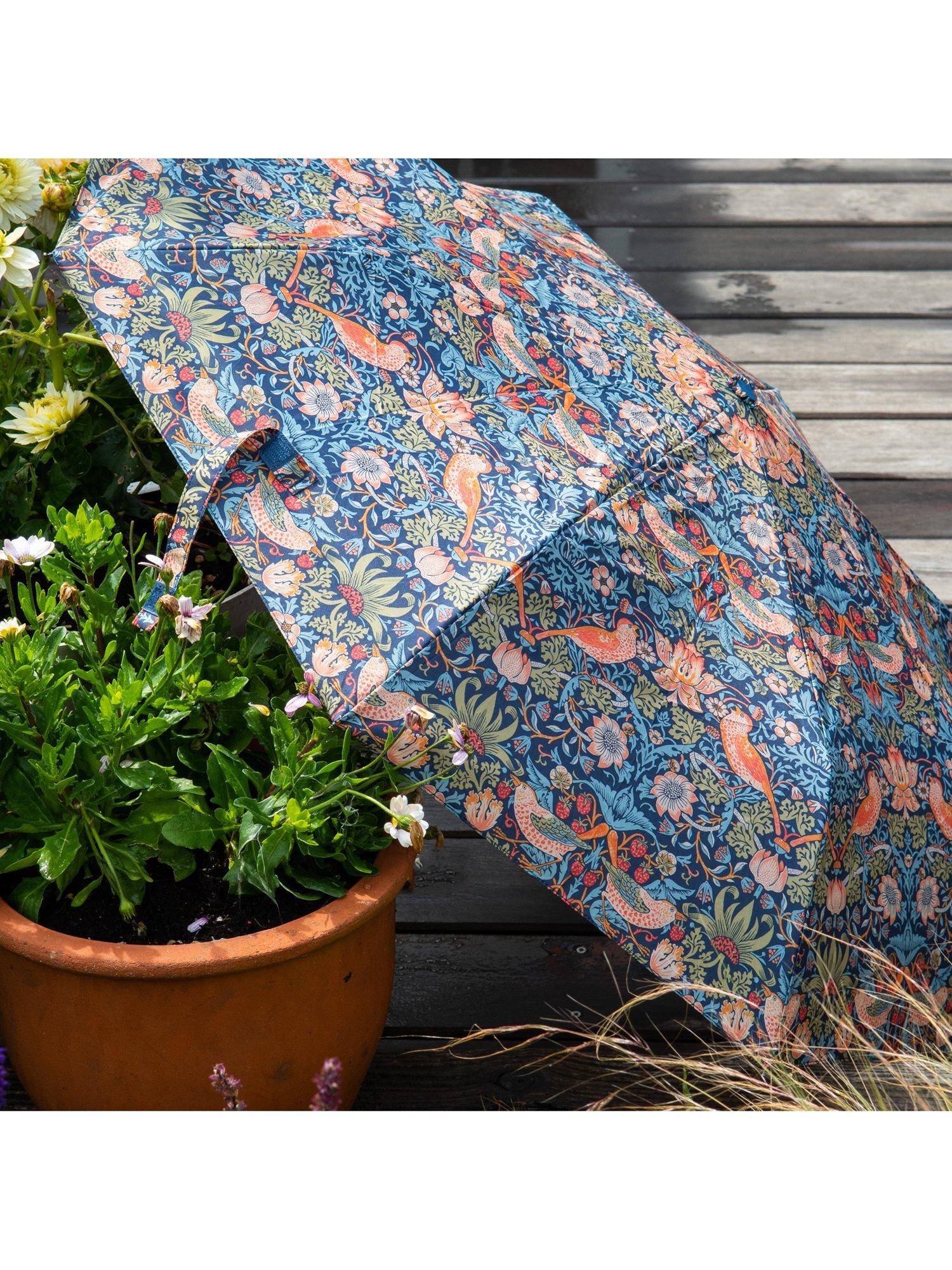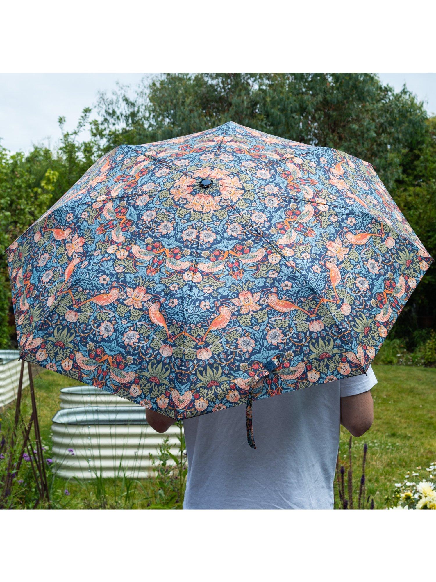 Compact, foldable umbrella, adorned with the iconic Strawberry Thief print depicting the thrushes that Morris found stealing fruit from his kitchen garden, bringing English Heritage to daily life. Comes with matching slide-on case for easy storage.