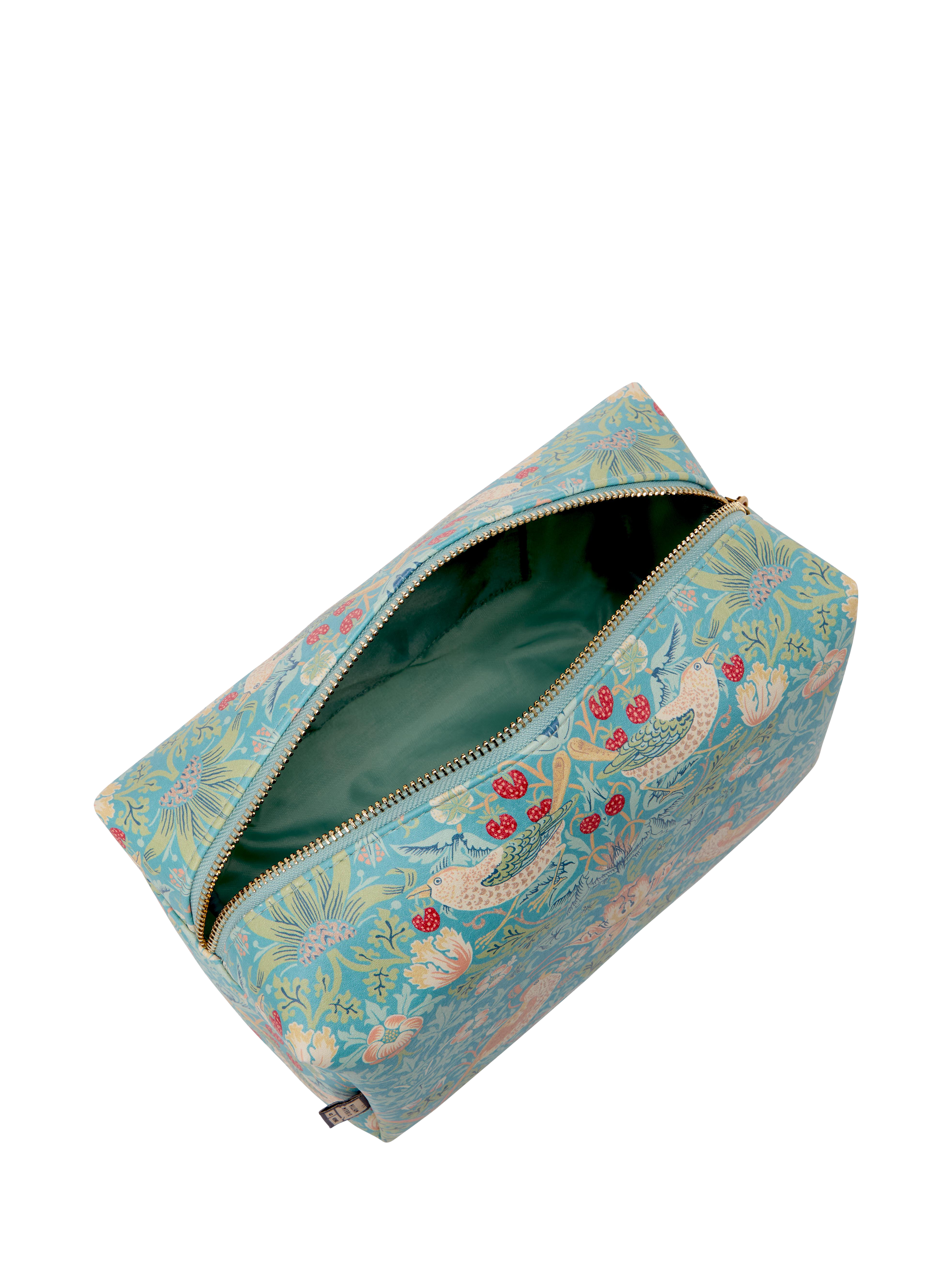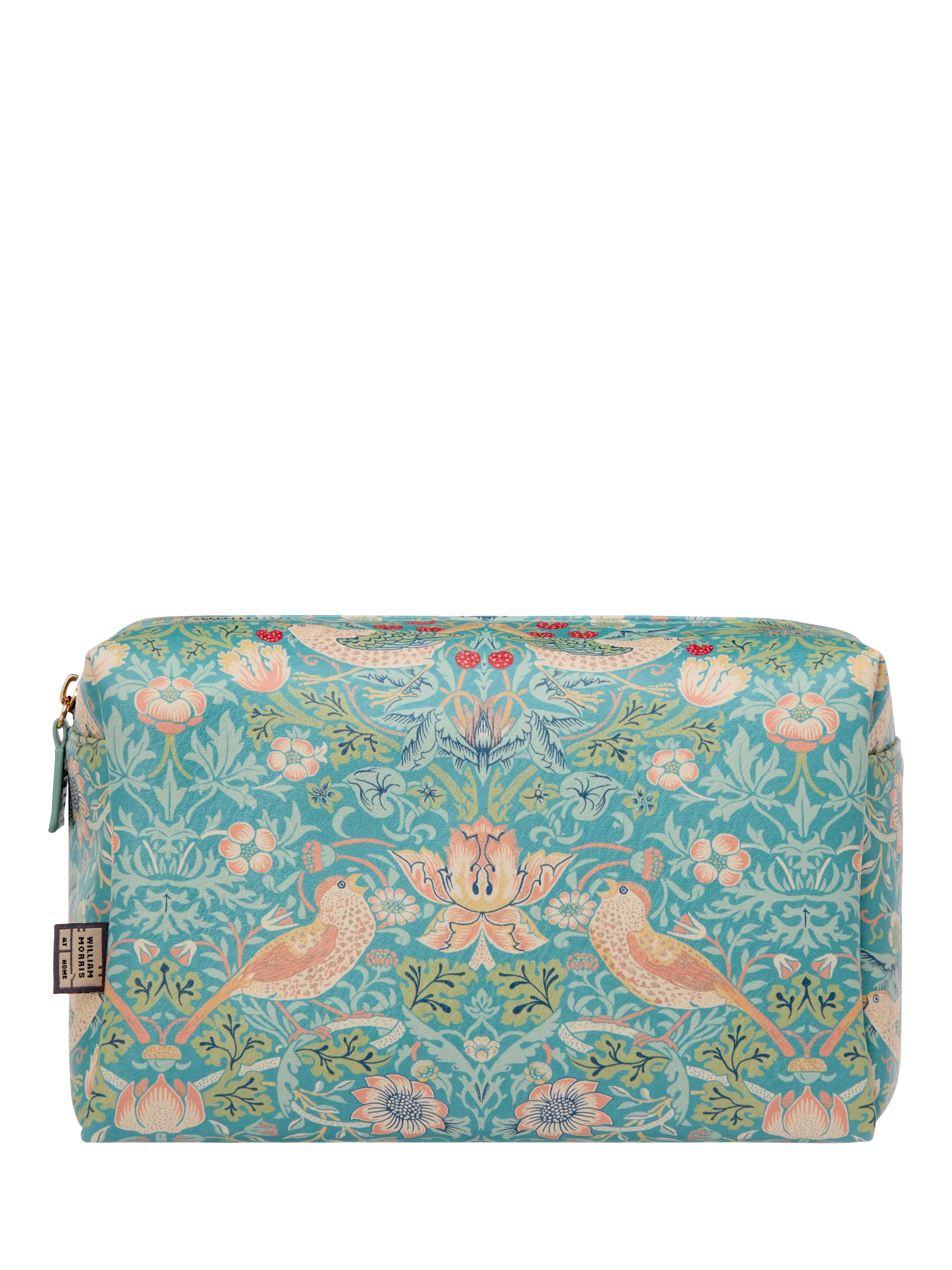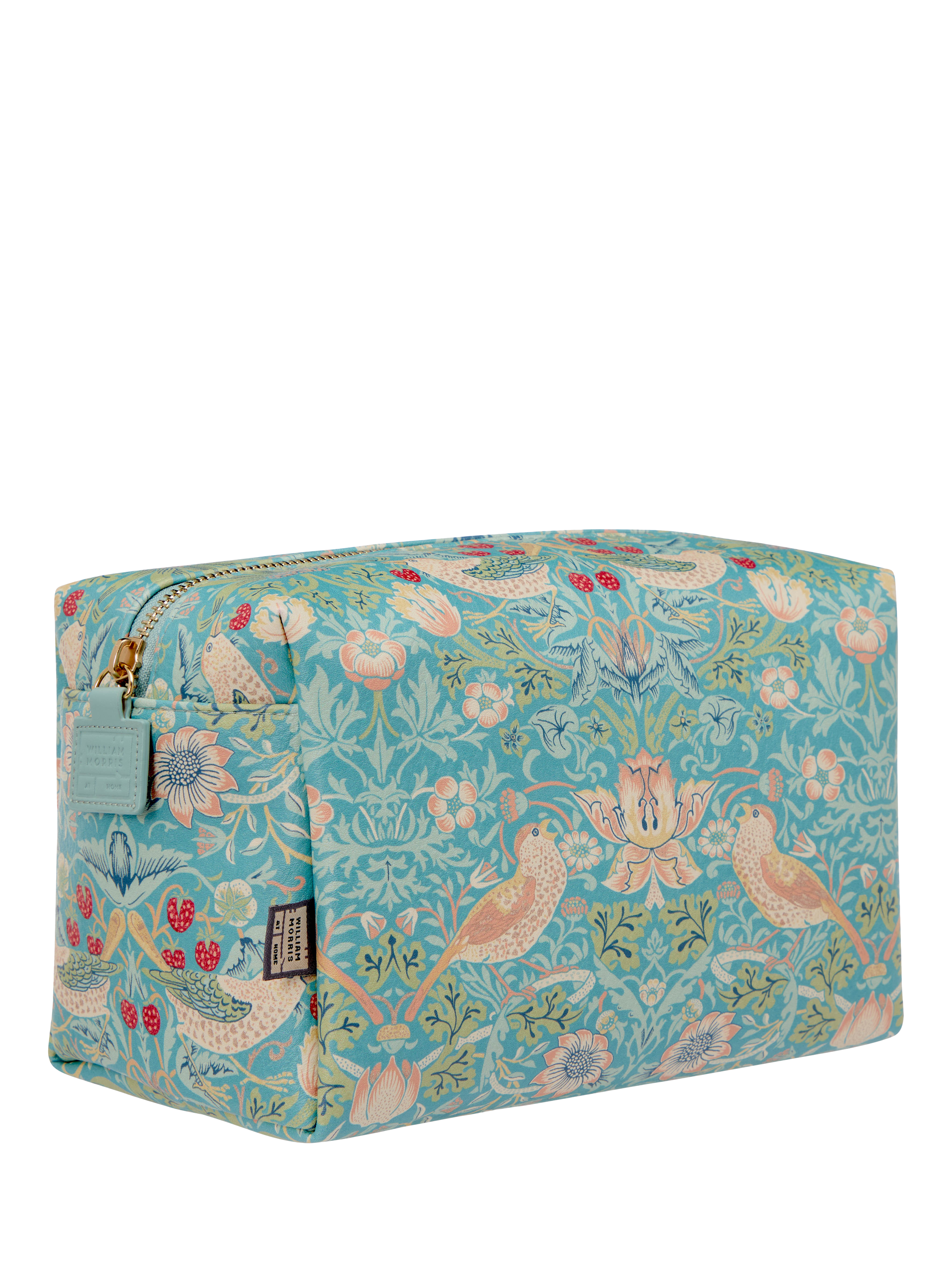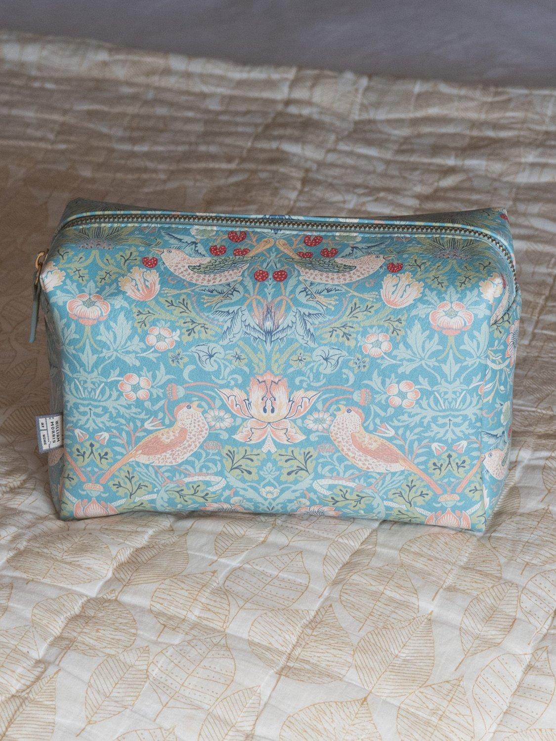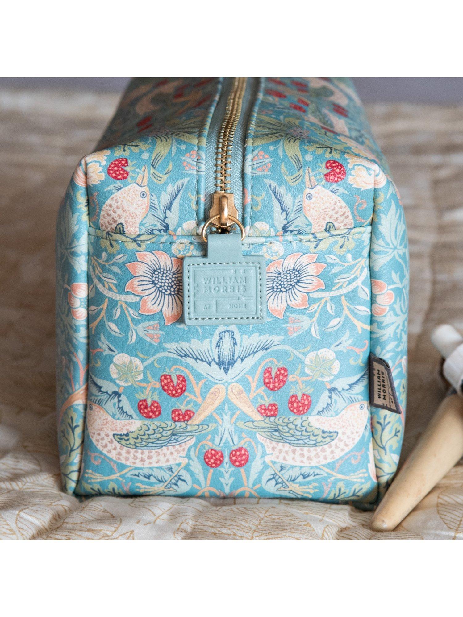 A spacious wash bag for all your beauty essentials adorned with the iconic Strawberry Thief print in duck egg blue. The famous design depicts the thrushes William Morris found stealing fruit from his kitchen garden, bringing English Heritage to daily life.