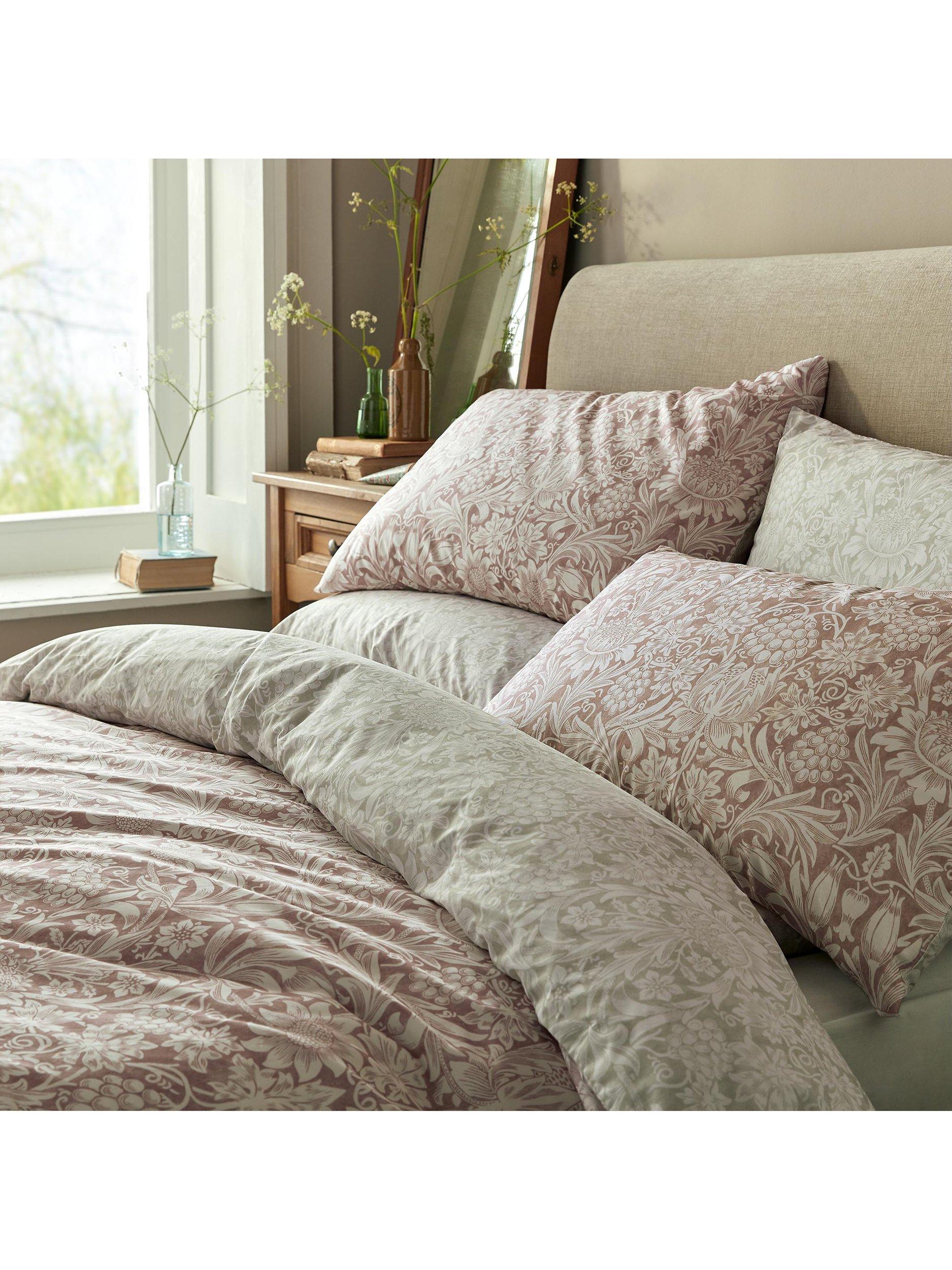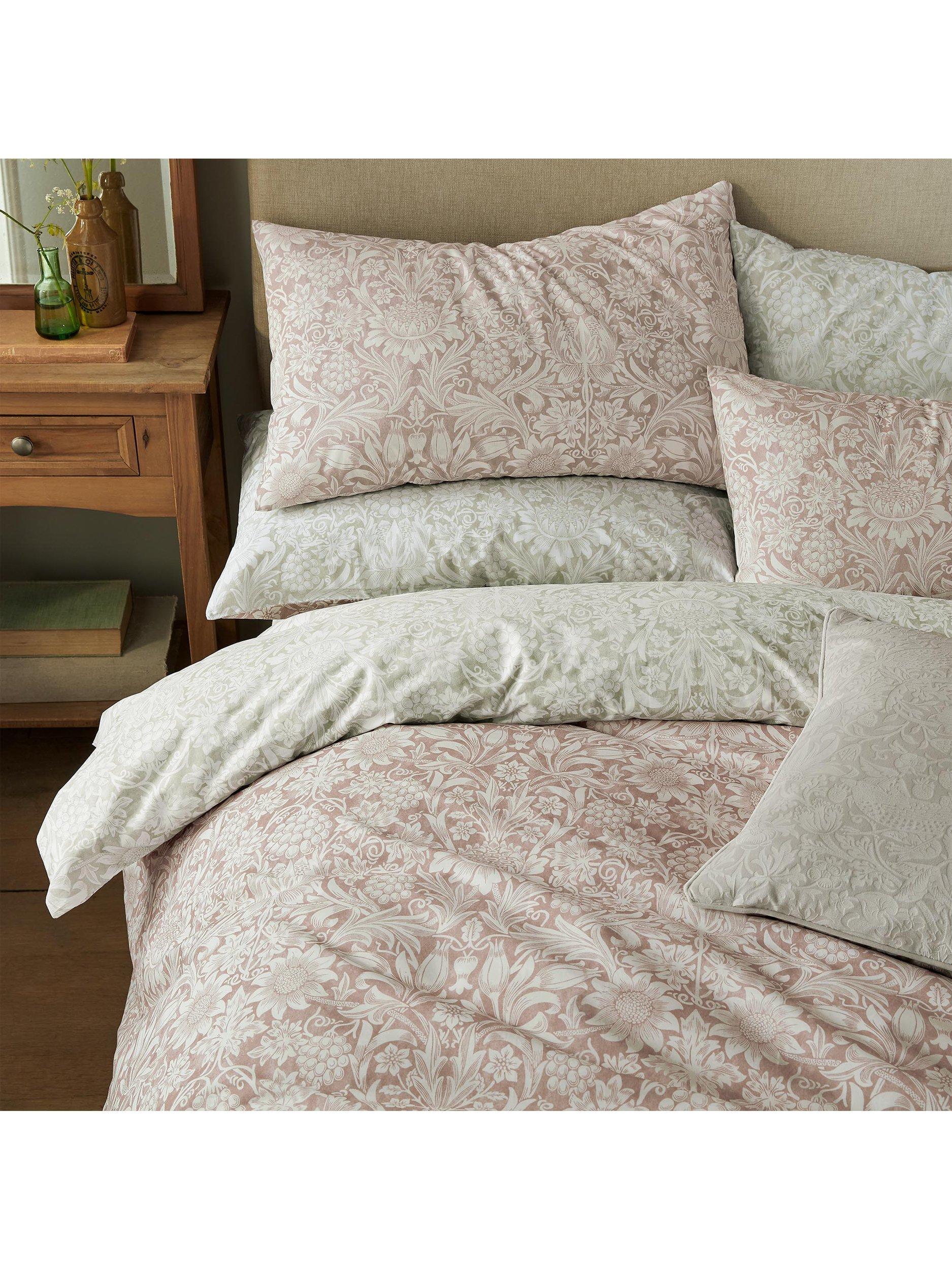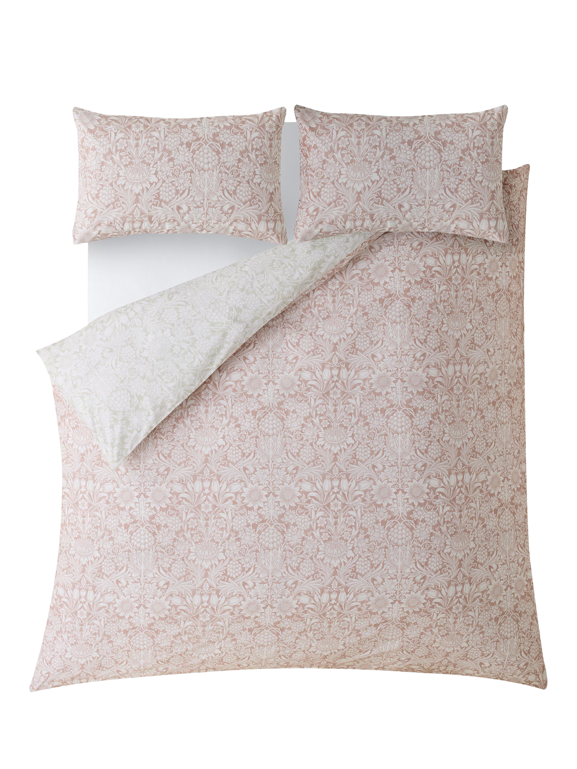 William Morris decorated his own gardens with many of the same flowers he reproduced in his wallpaper patterns. This elegant, symmetrical design features sunflowers, tulips and grapevines printed onto a 200-thread count, cotton base. Coloured in a sophisticated clay pink shade and a soft leaf green colour, this reversible bedlinen brings a contemporary interpretation to this historic William Morris pattern.
