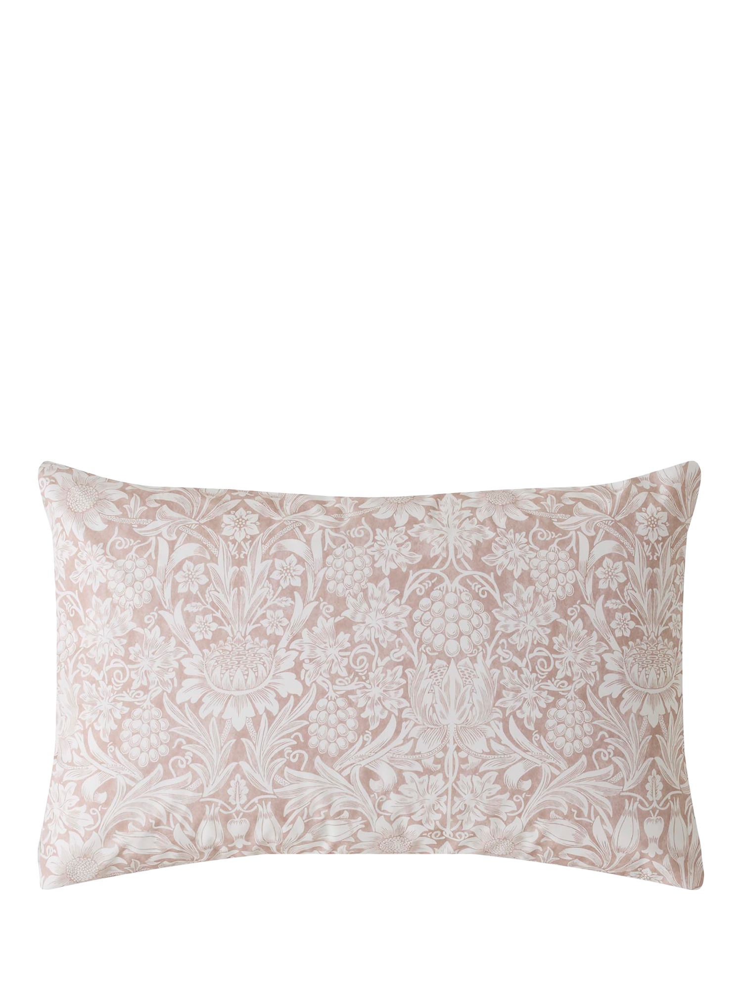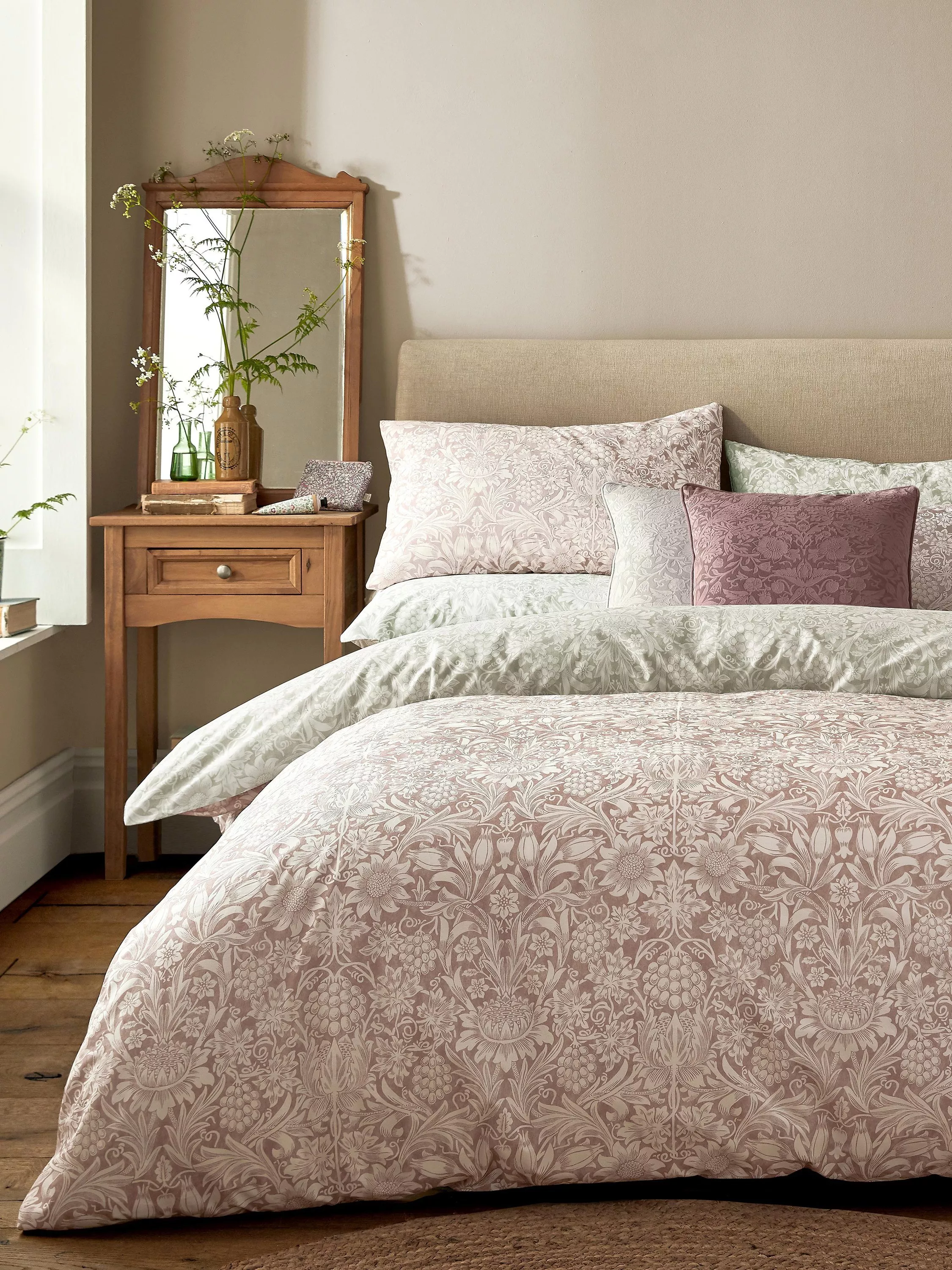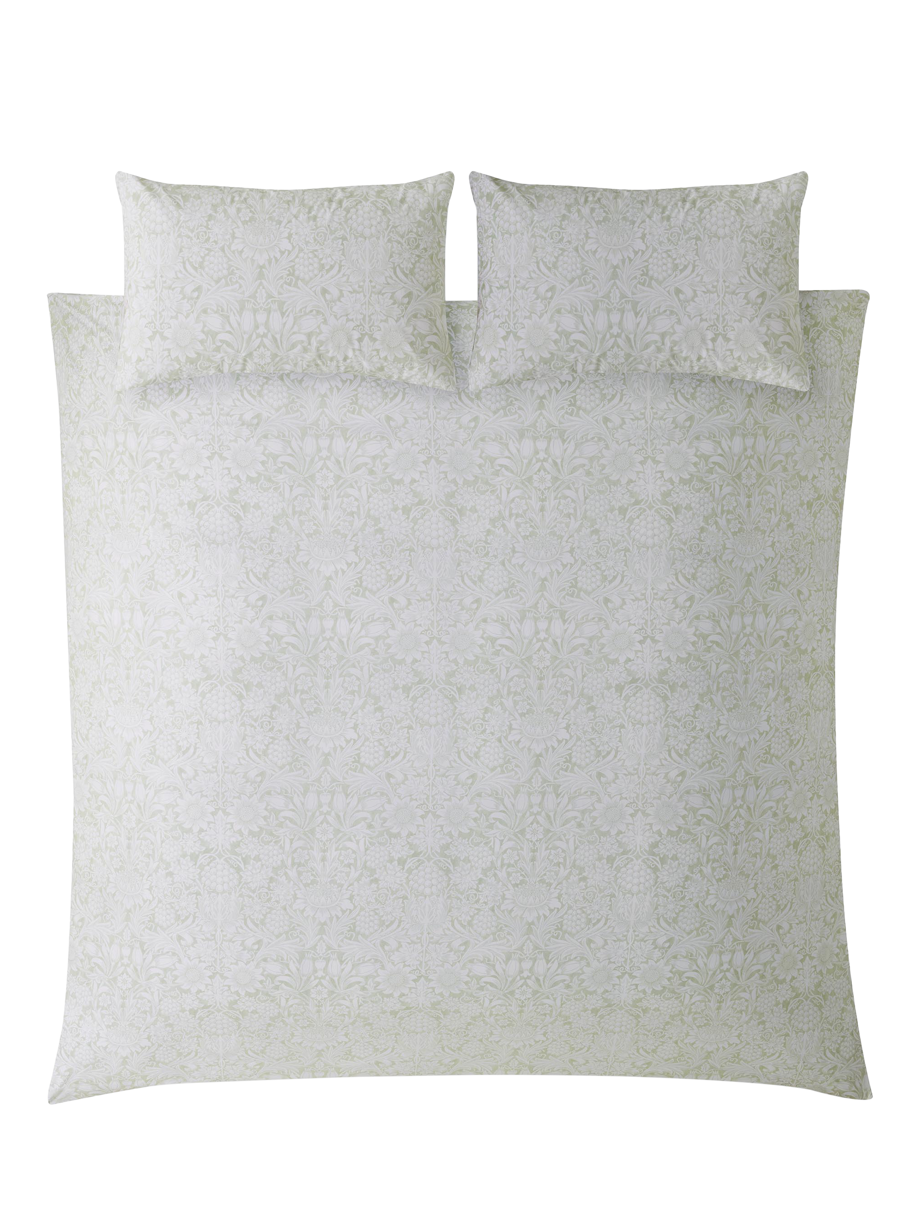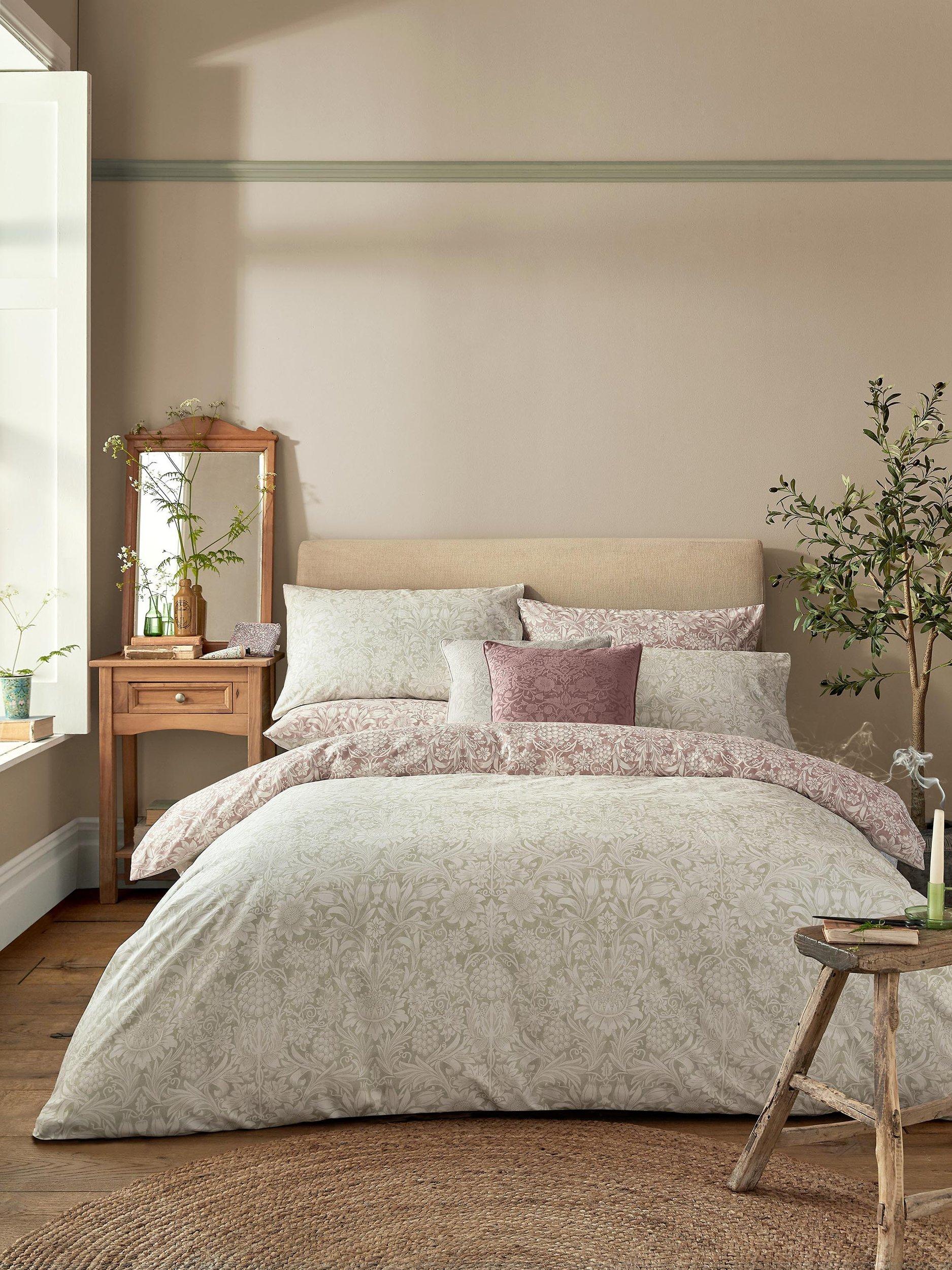 William Morris decorated his own gardens with many of the same flowers he reproduced in his wallpaper patterns. This elegant, symmetrical design features sunflowers, tulips and grapevines printed onto a 200-thread count, cotton base. Coloured in a sophisticated clay pink shade and a soft leaf green colour, this reversible bedlinen brings a contemporary interpretation to this historic William Morris pattern.