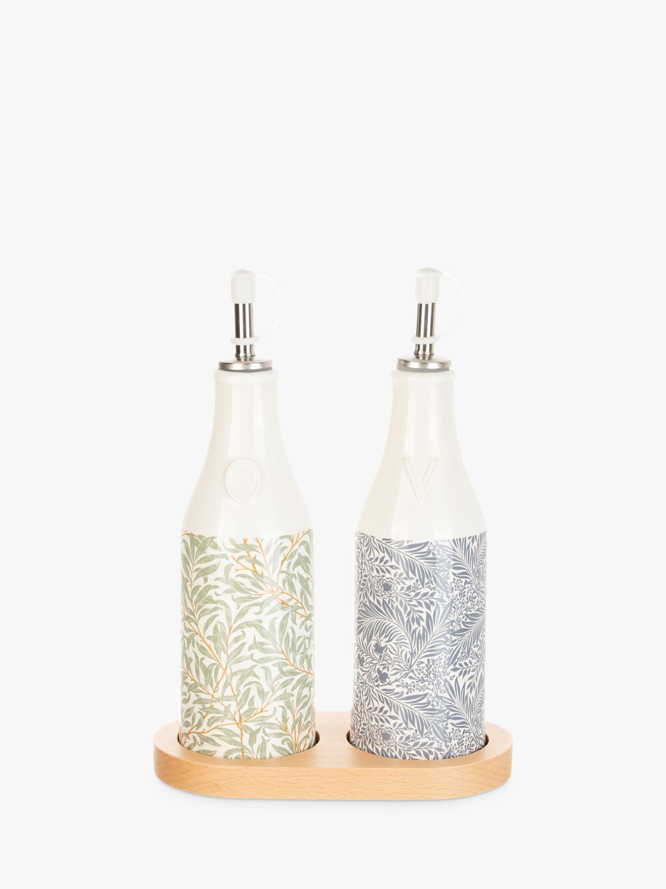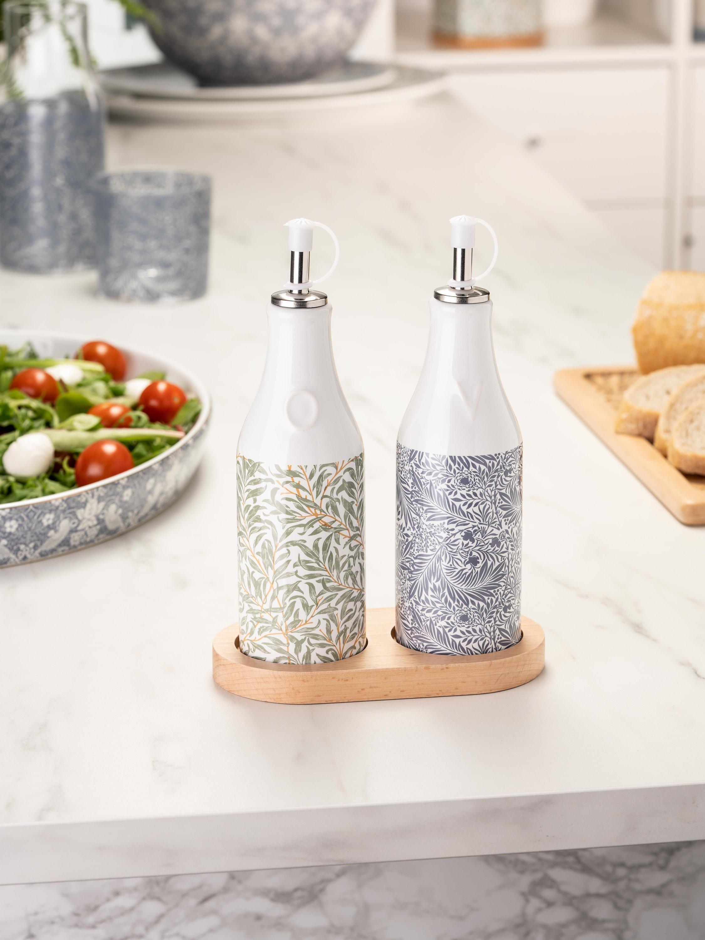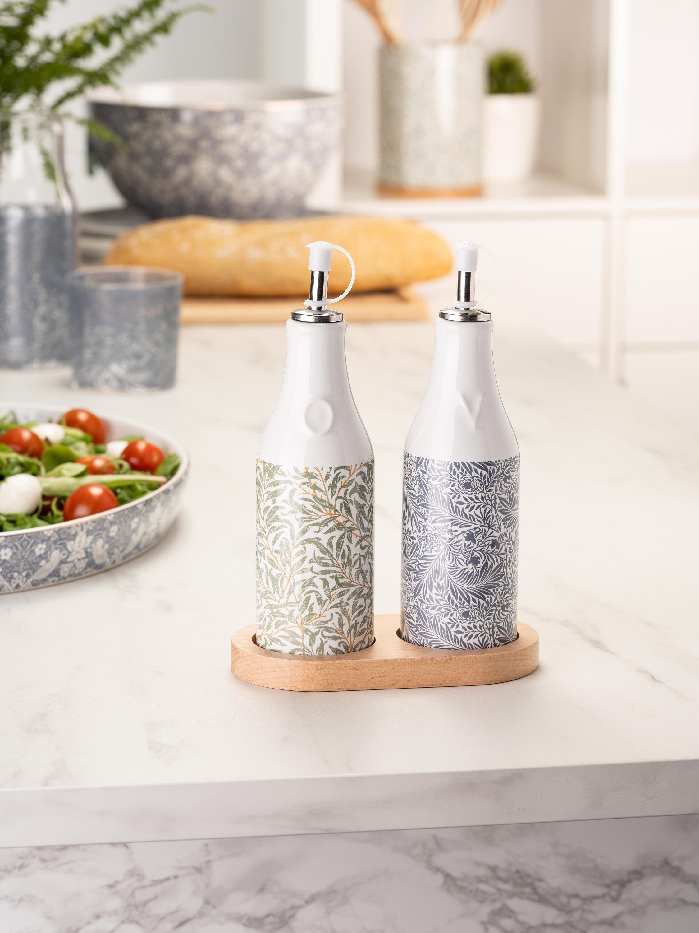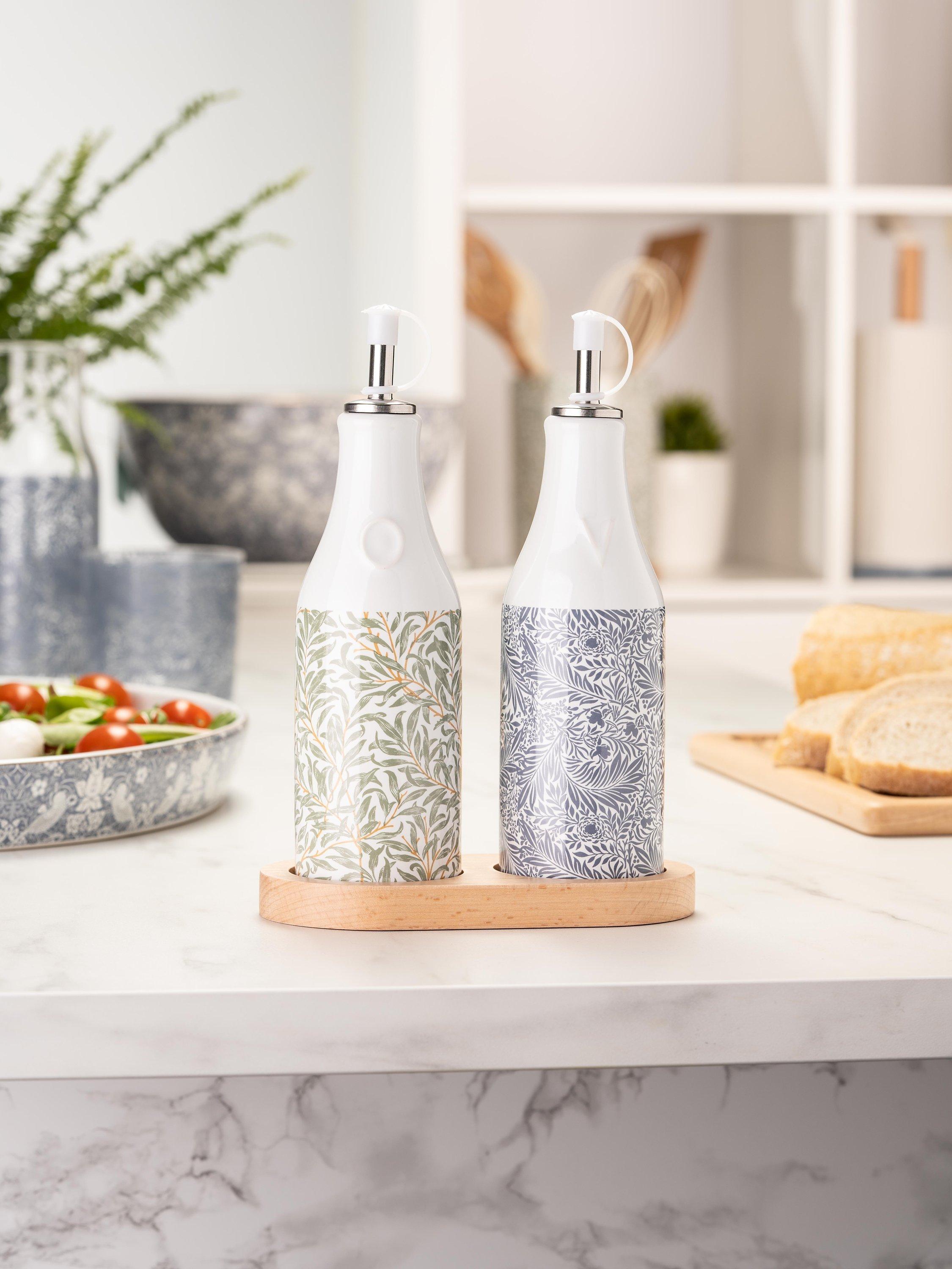 Using both the Larkspur & Willow Bough print created by William Morris, this oil and vinegar set with wooden base will look elegant on any worktop. With added silicone stopper that will keep condiments fresh and a pourer for easy use.