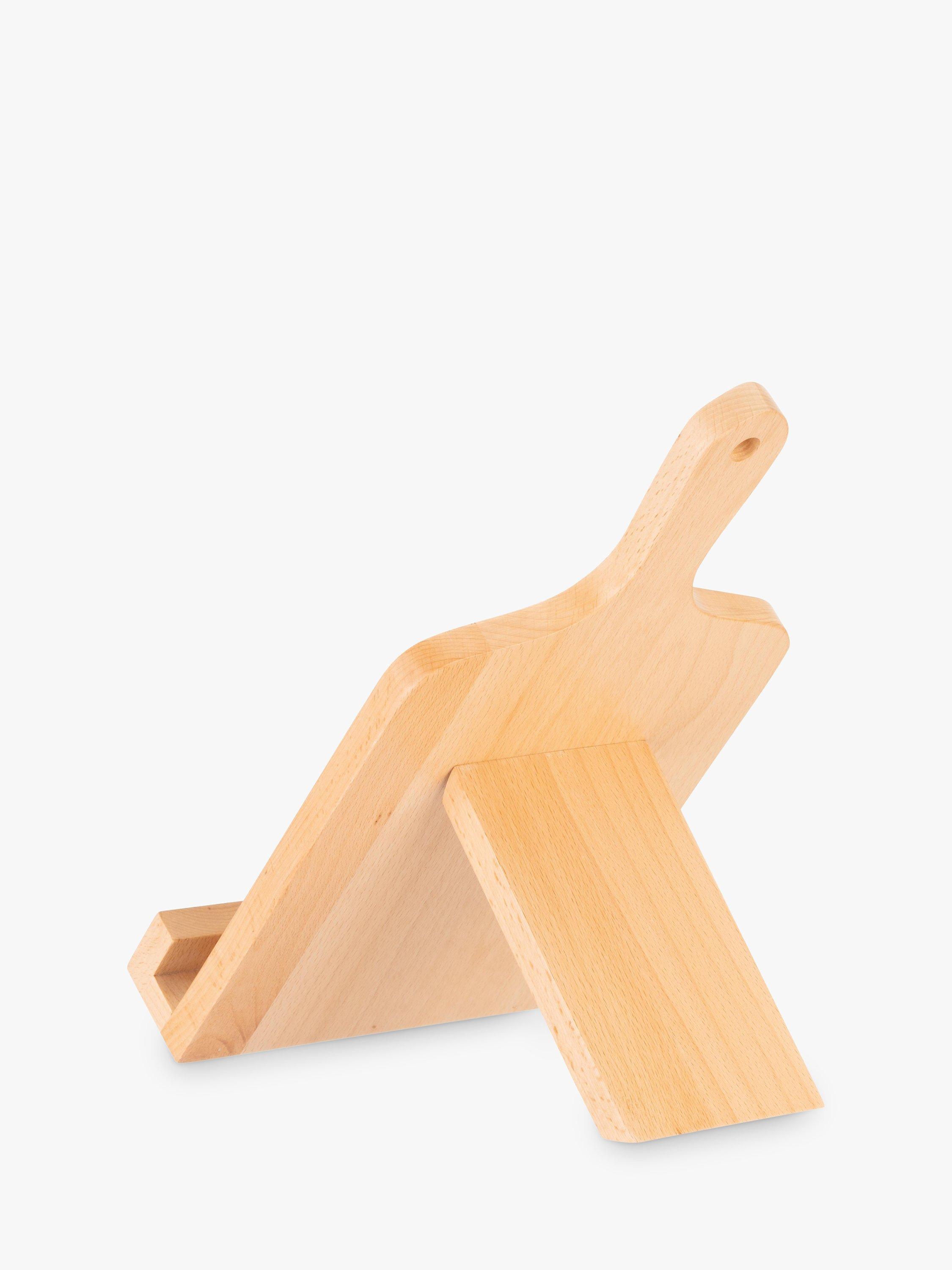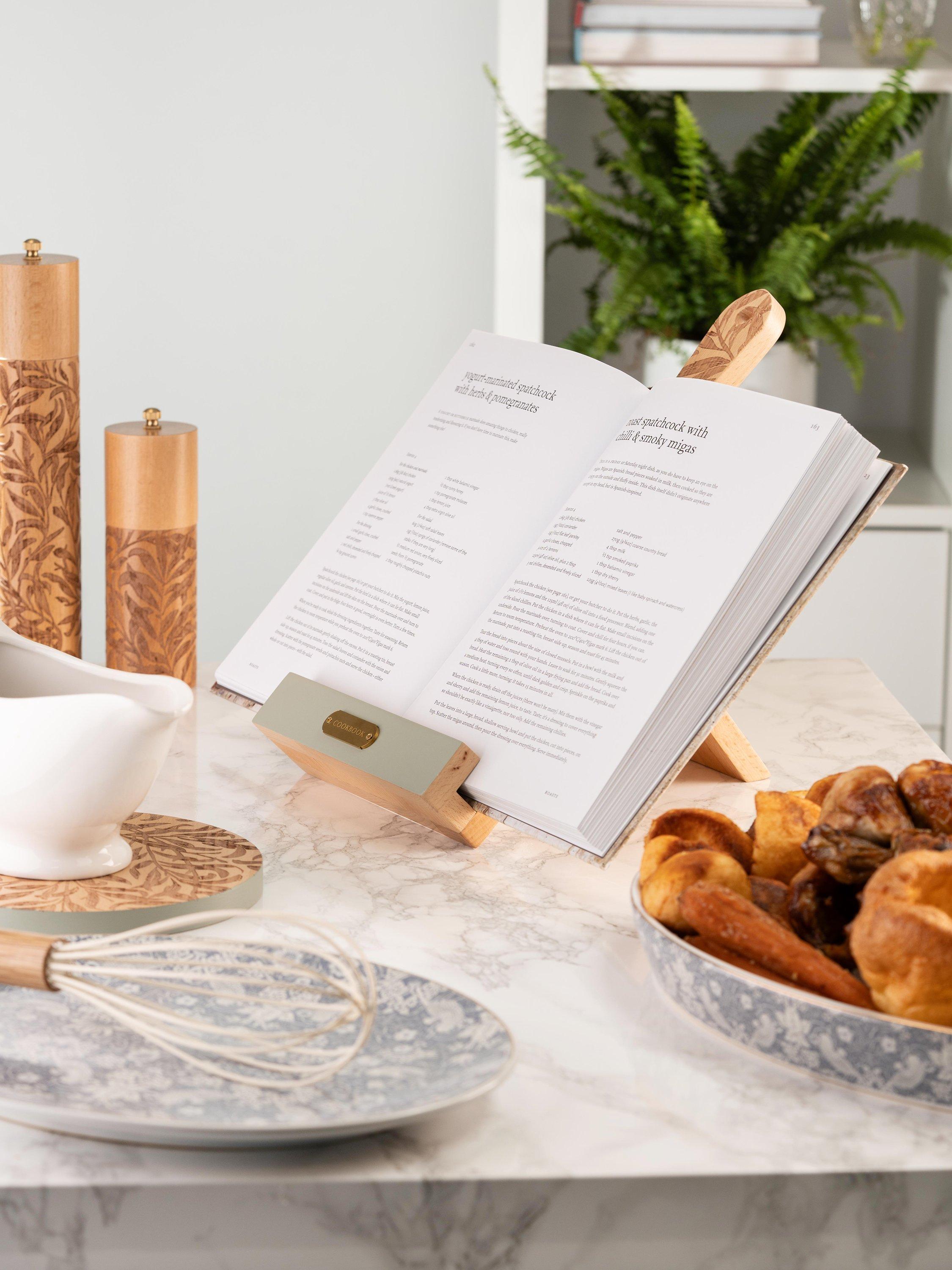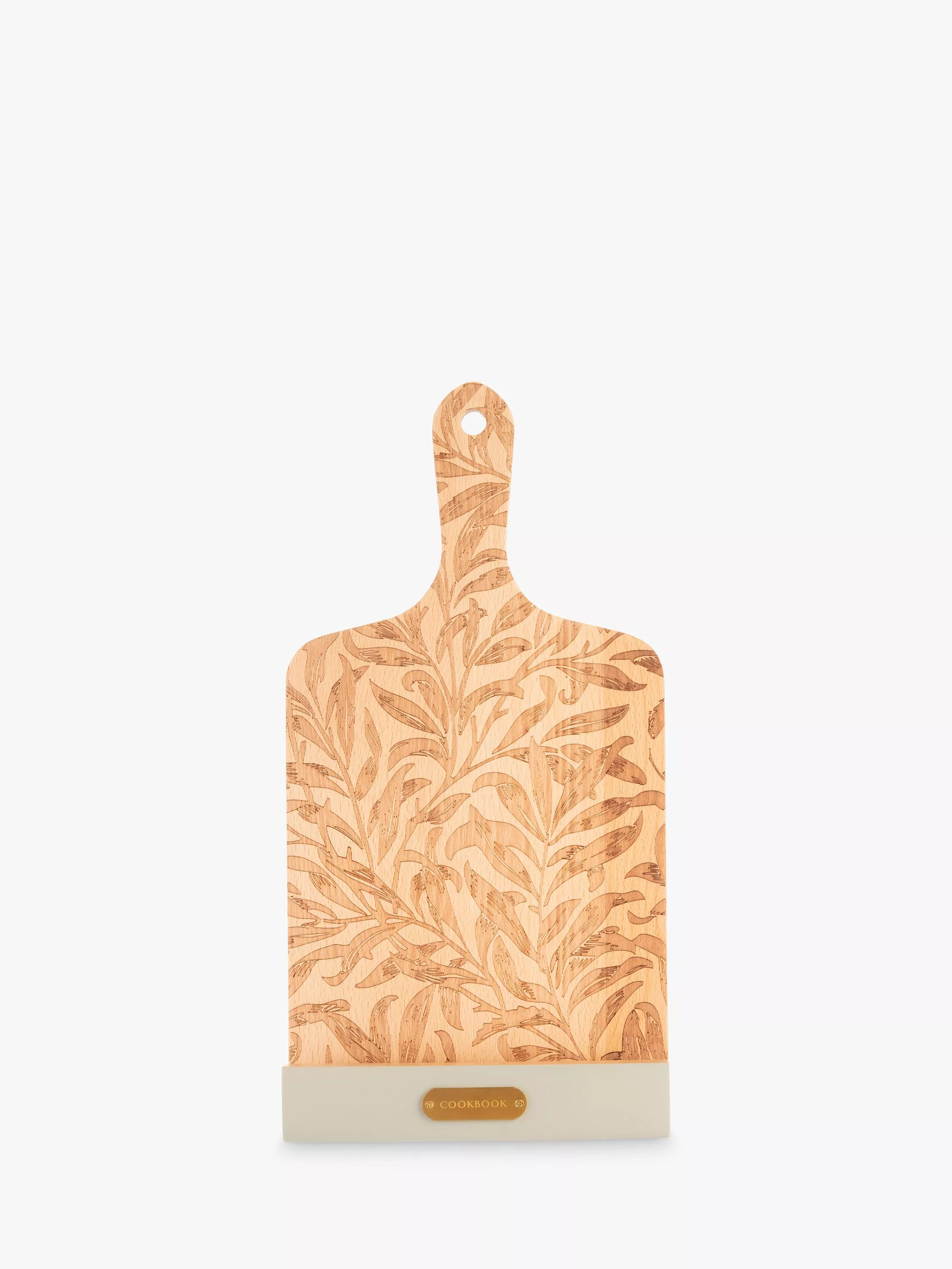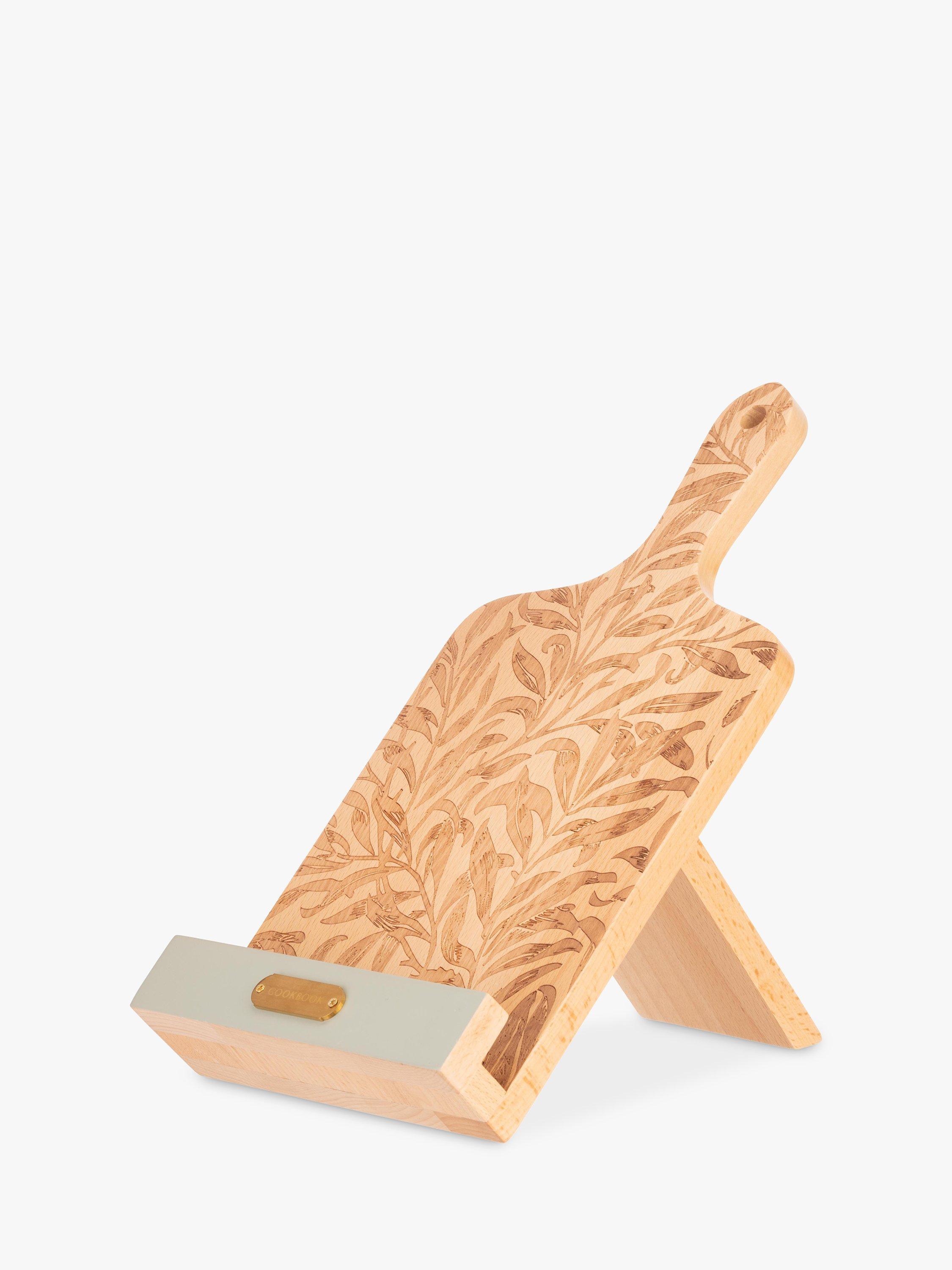 Beautiful paddle board-shaped cookbook stand, etched with the Willow Boughs print by William Morris. Collapses down for compact, space-saving storage. Finished with a stainless steel plate and hanging up hole.
