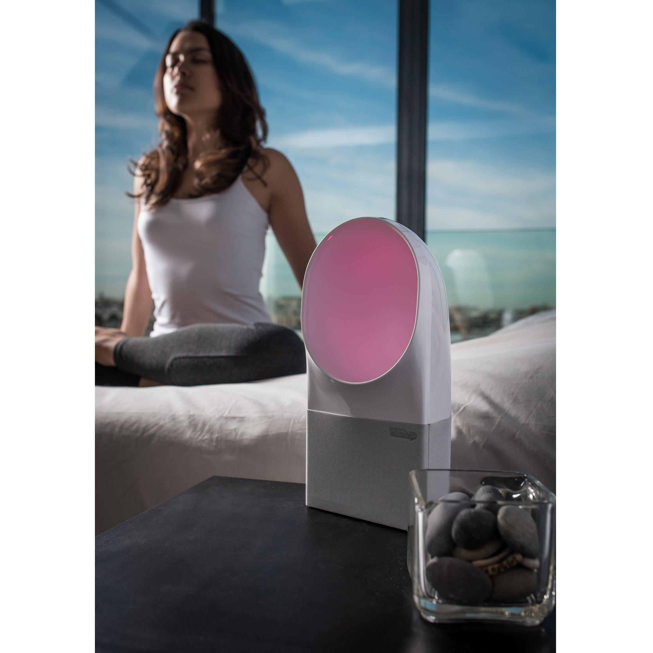 The bedside device uses light and sound to send you off into a peaceful sleep, and to gently wake you up at the best time in your sleep cycle. Using scientifically-validated lighting technology, the device emits sunset-effect lighting, using red light to send you to sleep and blue light to wake you up. Melatonin is the hormone that controls the sleep-wake cycle, and blue lighting contains melatonin-inhibiting wavelengths which help to increase your alertness. Red lighting is not melatonin-inhibiting, so helps to promote the onset of sleep.