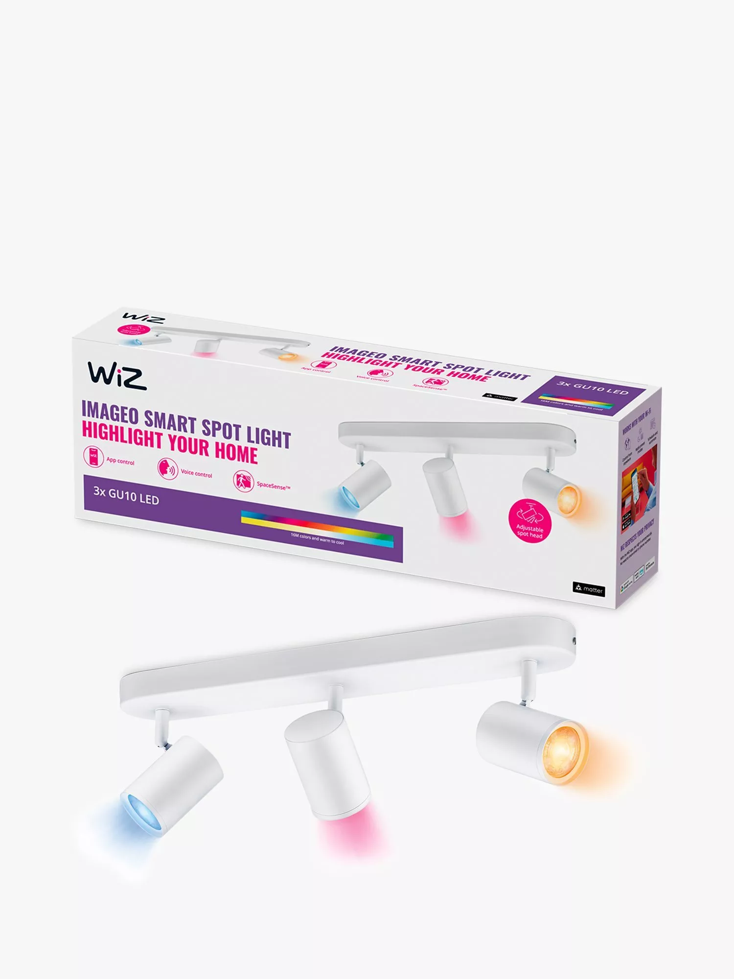 Highlight your home's decor using these three, adjustable and colour changing, spotlights from WiZ. Use the WiZ Imageo Smart 3 Spotlight with your existing Wi-Fi to control with the WiZ app or your voice.