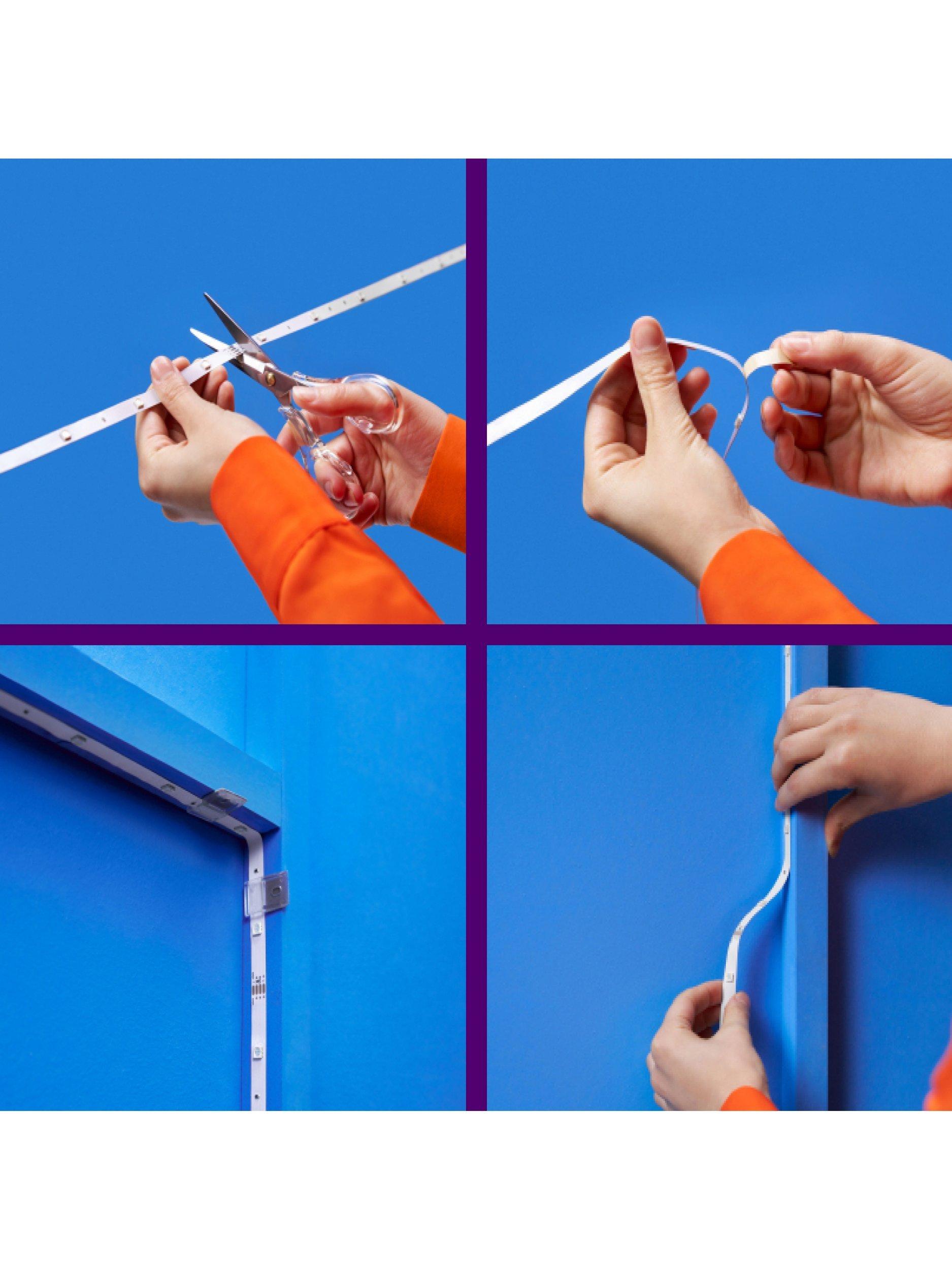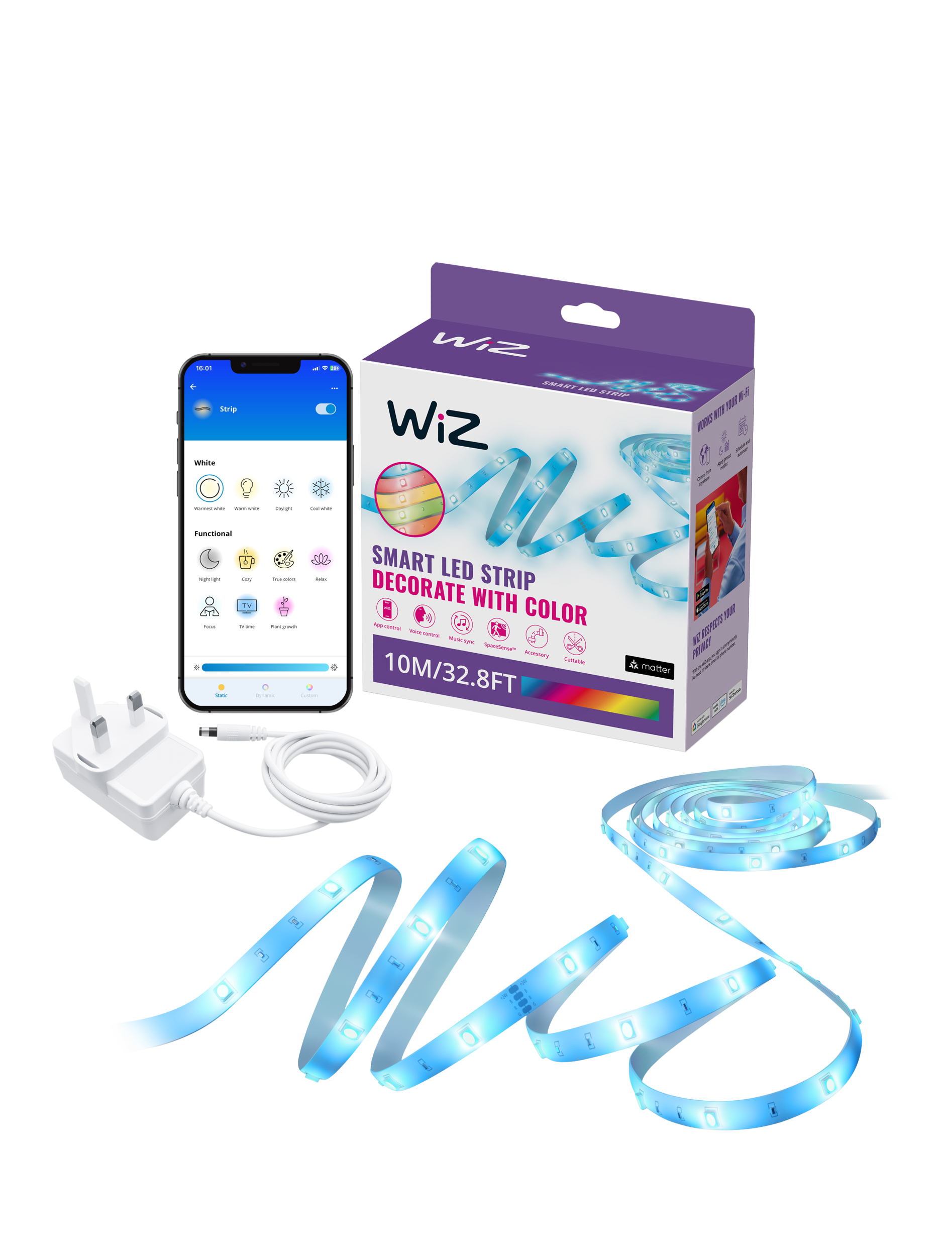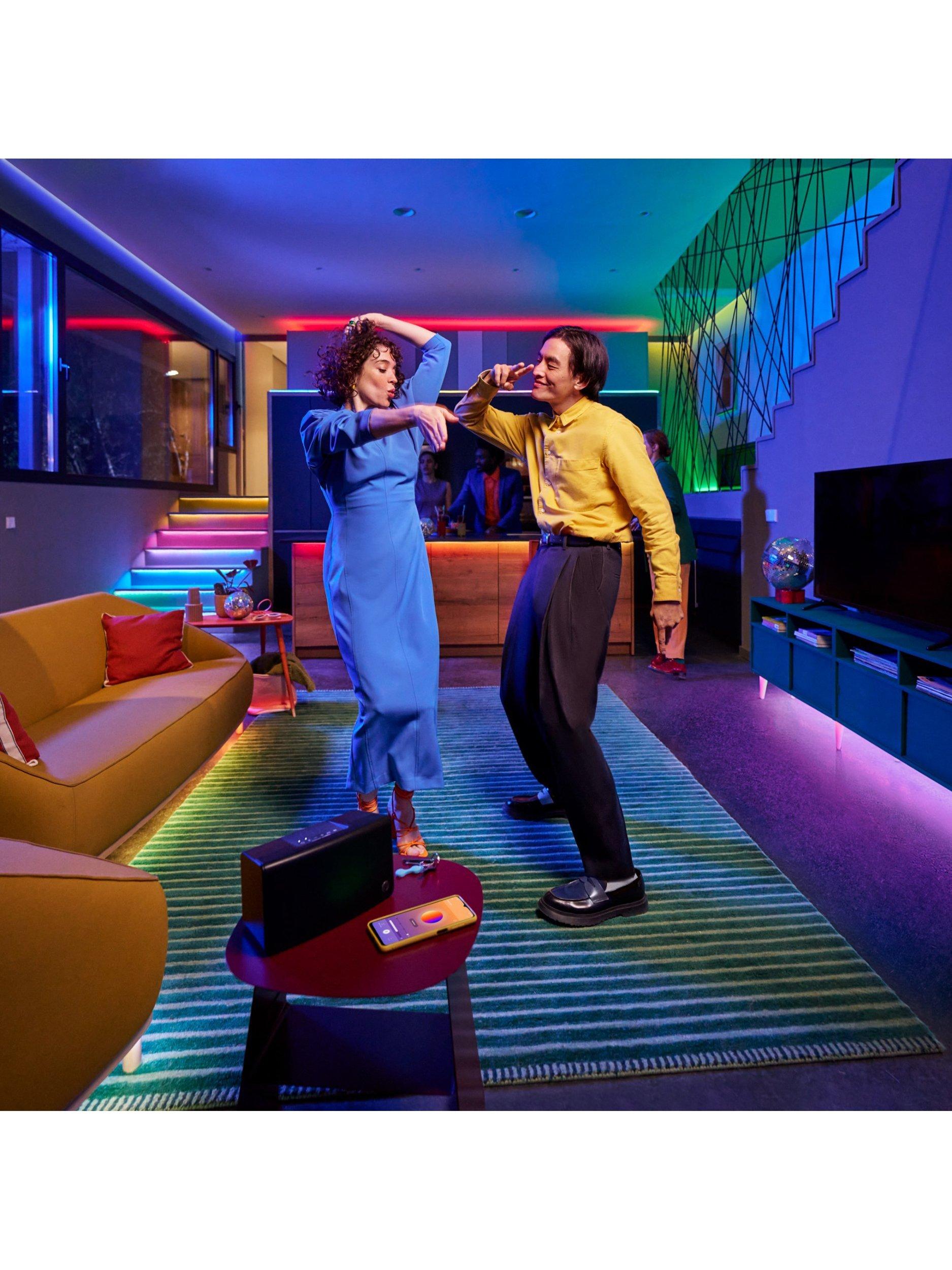 A 10-metre RGB light strip, designed to fit and beautify large spaces with over 16 million solid colours, static and dynamic modes and smart features. Just cut the strip as you wish, place on any surface thanks to the non-damaging adhesive and use the intuitive WiZ app to control the lights through your existing Wi-Fi.