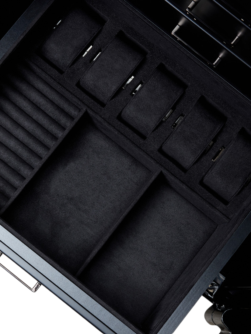 Additional storage: 3 black finished exterior, grey Lusterloc™ lined, pull-out drawers house 5 additional watches, jewellery and accessory storage. 2 drawers divided: 1 drawer open for larger items.