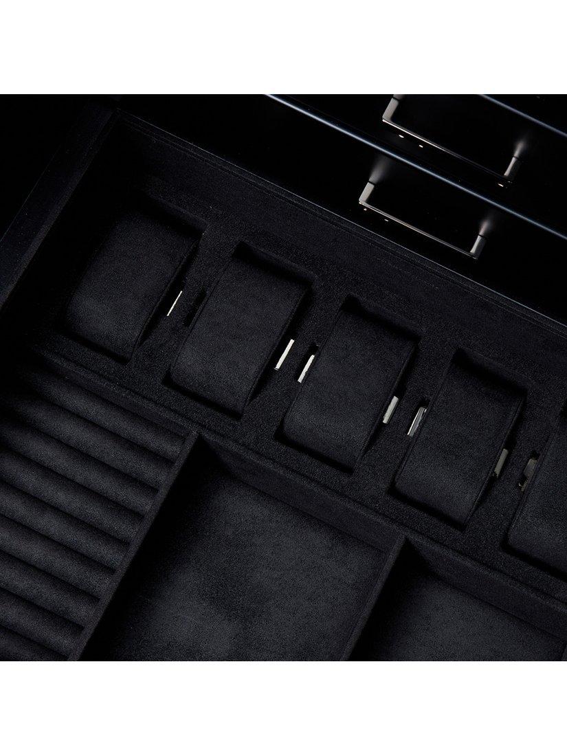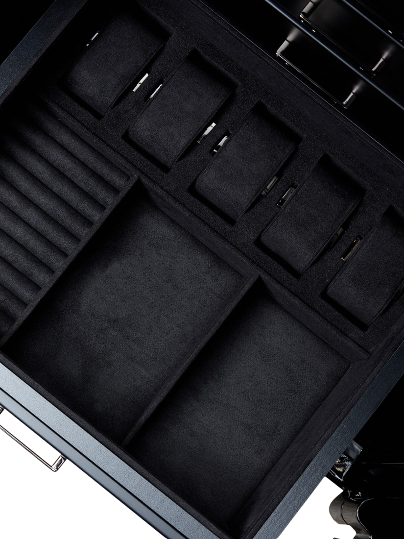 Additional storage: 2 black finished exterior, grey Lusterloc™ lined, pull-out drawers house additional watches, jewellery and accessory storage. 1 drawer divided: 1 drawer open for larger items.