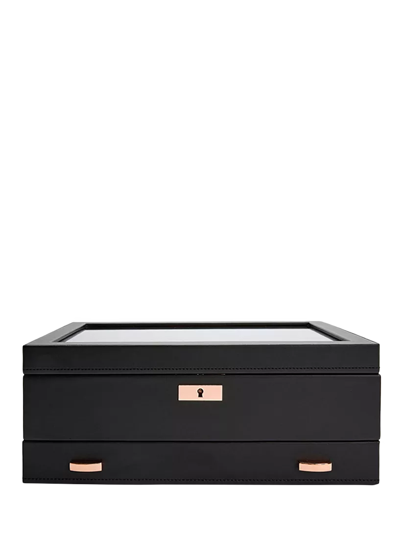 Keep your timepieces safe and secure in style with the WOLF Axis 10 piece watch box with storage. Made from vegan leather, this watch box can beautifully display up to 10 timepieces. Featuring lock and key security, suspended watch cushions and a smart watch USB port.