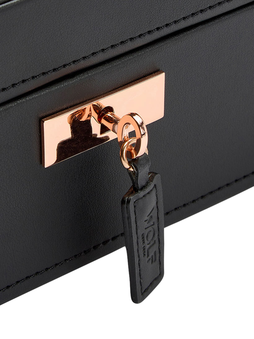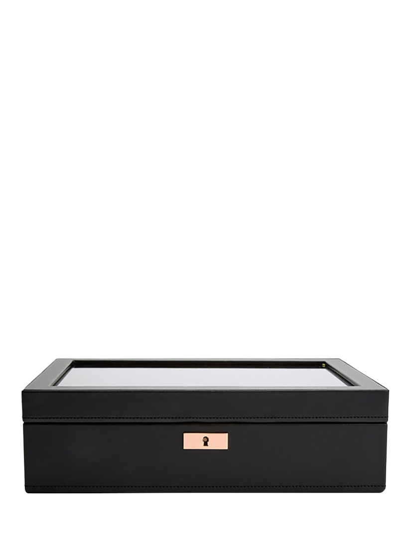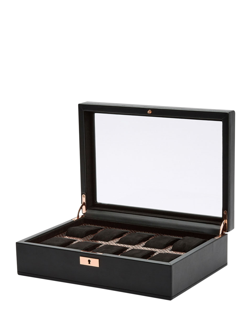 Keep your timepieces safe and secure in style with the WOLF Axis 10 piece watch box. Made from vegan leather, this watch box can beautifully display up to 10 timepieces. Featuring lock and key security, suspended watch cushions and a smart watch USB port.