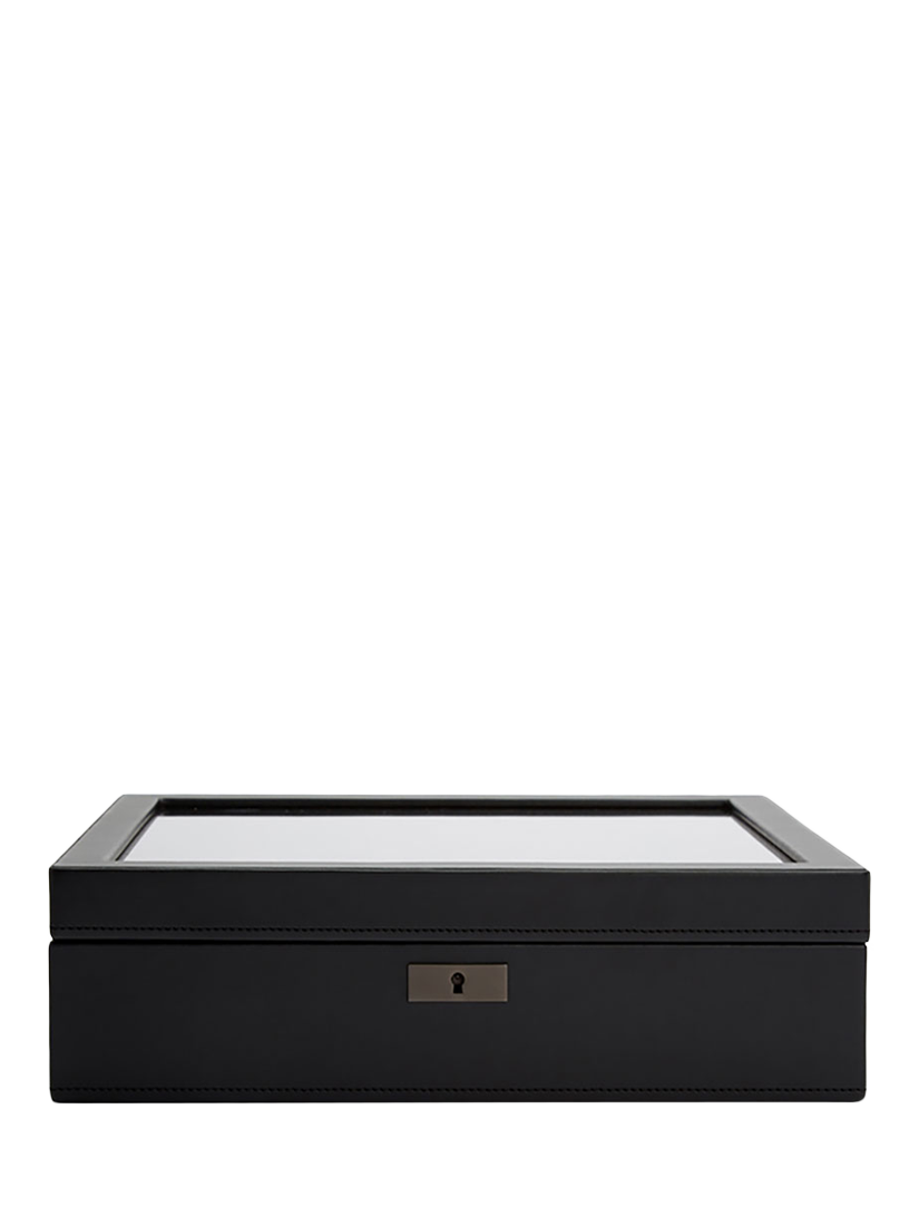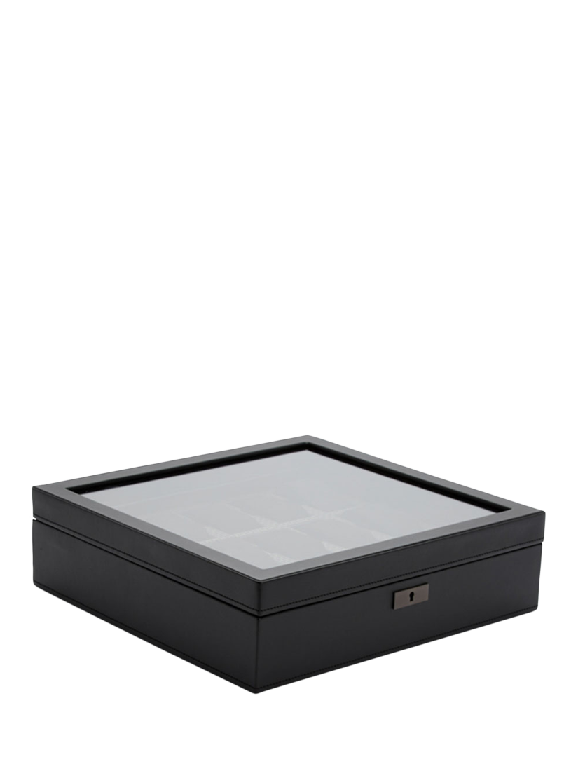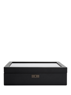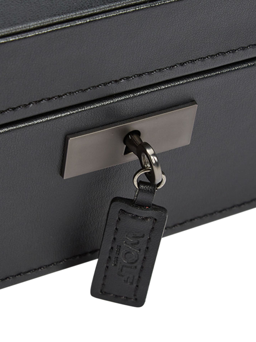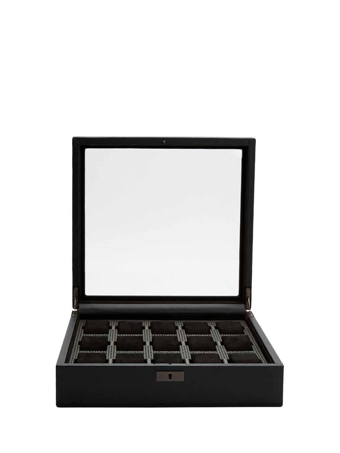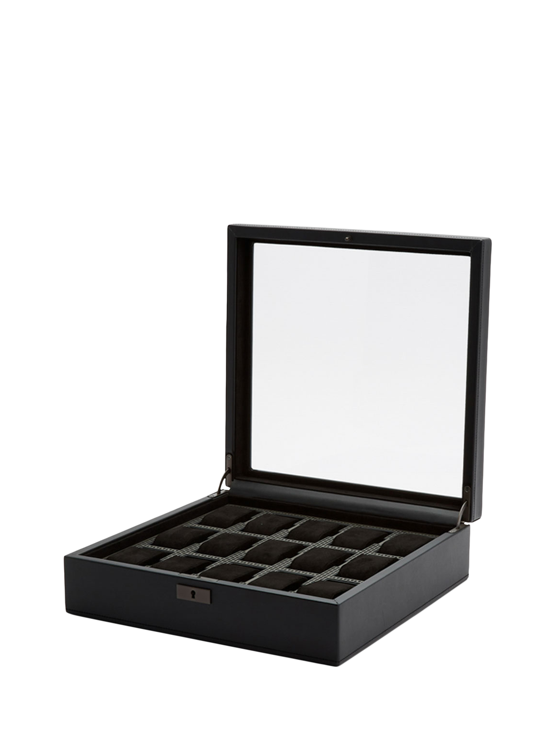 Keep your timepieces safe and secure in style with the WOLF Axis 15 piece watch box. Made from vegan leather, this watch box can beautifully display up to 15 timepieces. Featuring lock and key security, suspended watch cushions and a smart watch USB port.