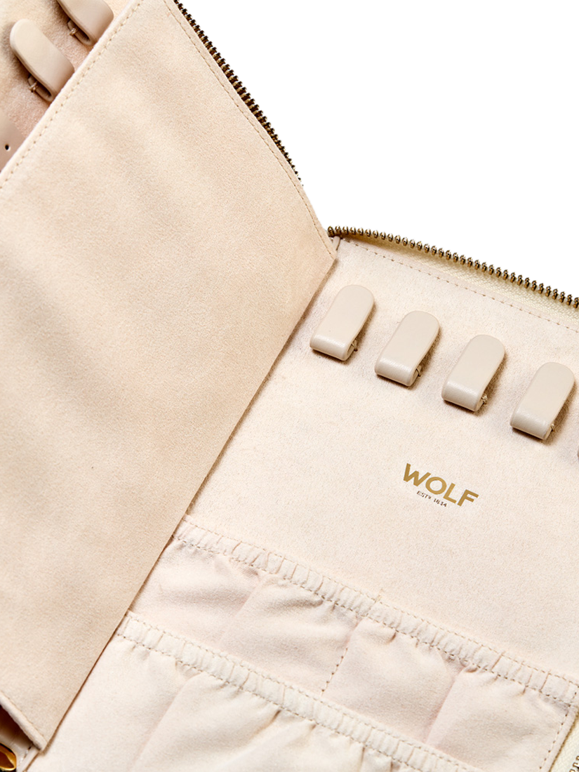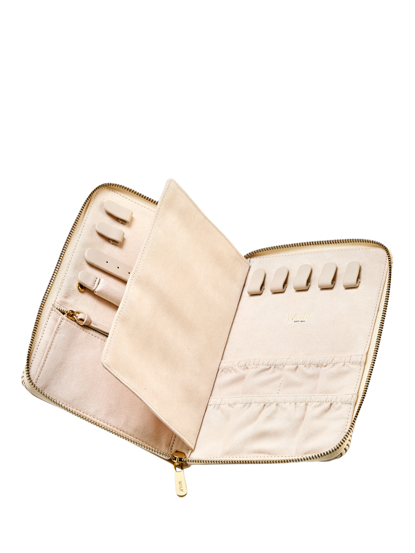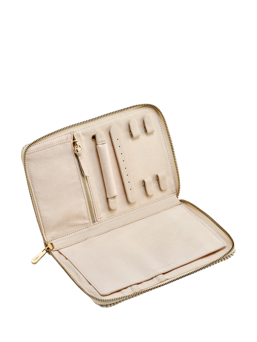 The Bella Jewellery Portfolio brings opulence and sophistication with perfectly pleated exterior and gold finish hardware. Inside find LusterLoc™ lined storage for rings and earrings, a zip compartment, five necklace and four bracelet snap closure hooks with elasticated pouches to prevent tangling. Simply beautiful.