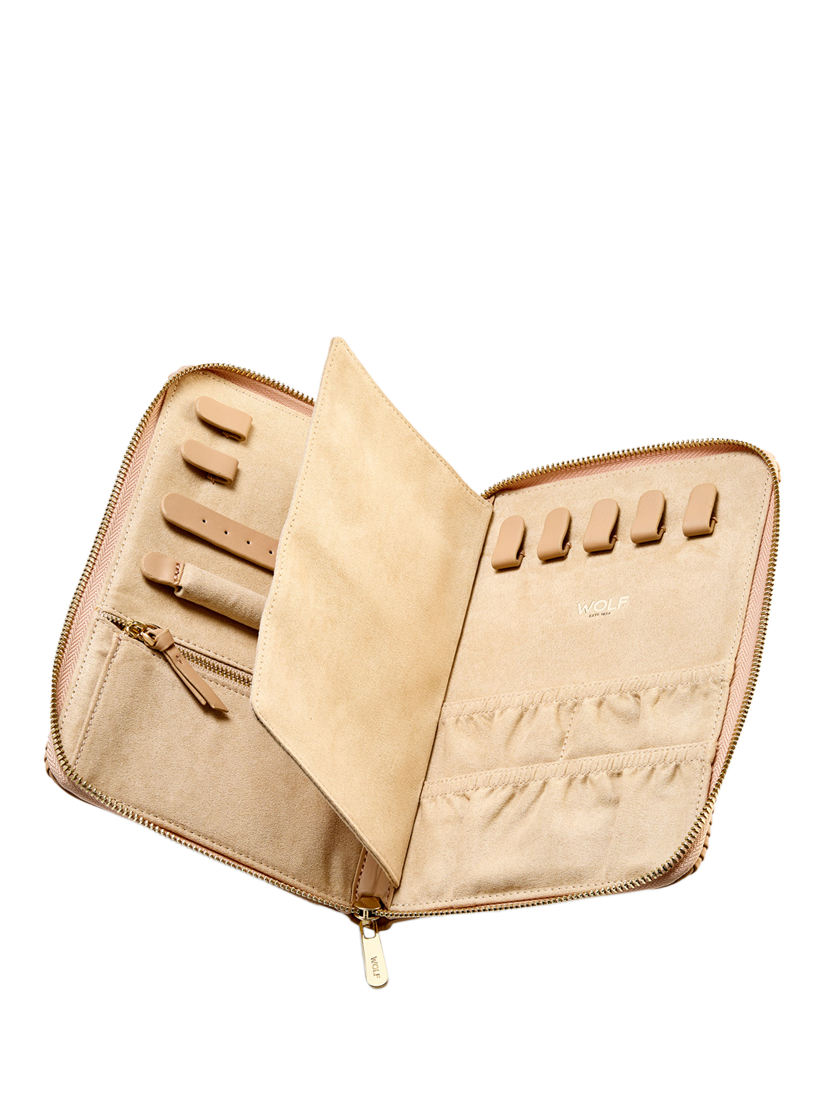 The Bella Jewellery Portfolio brings opulence and sophistication with perfectly pleated exterior and gold finish hardware. Inside find LusterLoc™ lined storage for rings and earrings, a zip compartment, five necklace and four bracelet snap closure hooks with elasticated pouches to prevent tangling. Simply beautiful.