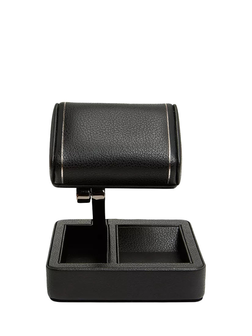 Hand crafted from vegan leather, the WOLF British Racing travel watch stand boasts a functional, compact, and lightweight design. The soft padded top cushion can store heavy watches and will keep your timepiece secure and scratch free. The lightweight, secure base provides storage, and our patented folding mechanism allows you to fold the watch stand flat to fit into the matching travel pouch.