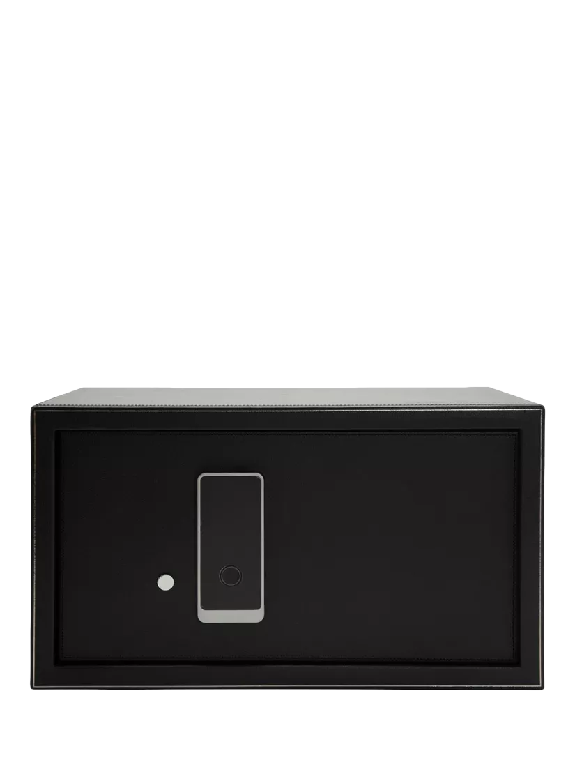 The WOLF Den safe has a vegan leather covered exterior and features four patented WOLF watch winders with storage space above, including a vault tray with removable 3-piece watch tray. The door of The Den opens and locks with a biometric identifier or keycode.
