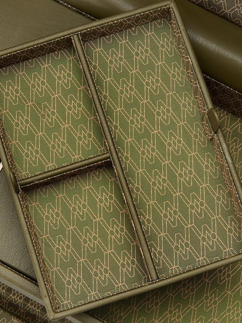 - apple vegan leather exterior with a recycled jacquard satin interior, featuring WOLF's signature pattern