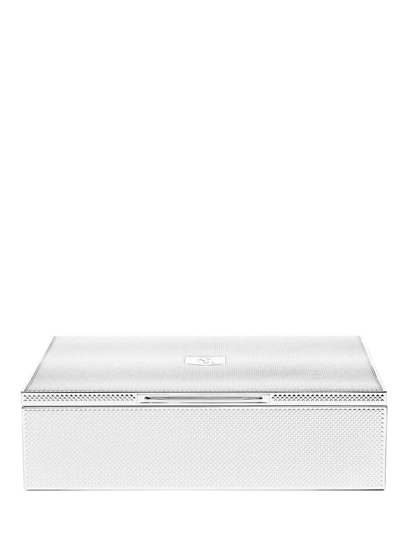 Silver-plated with an engine-turned exterior pattern, it boasts a hidden piano-hinged lid and deep blue ultrasuede lining treated with LusterLoc™. Featuring WOLF's 190th anniversary crest logo, this box offers versatility with removable trays, watch cuffs, ring slots and compartments. An exquisite statement piece celebrating craftsmanship and elegance.