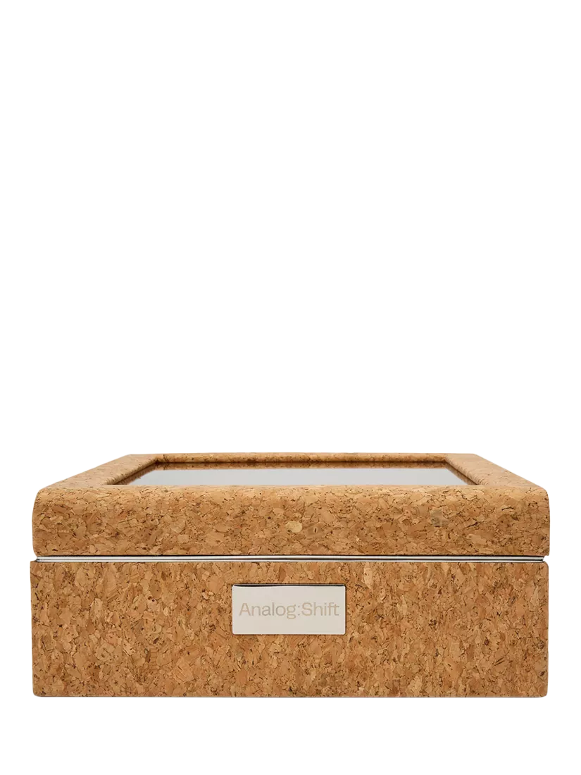 The WOLF x Analog Shift 1976 collection is a homage to the traditional cork packaging from the 1970s. This 8 piece watch box features cork, steel trimming and a display window.