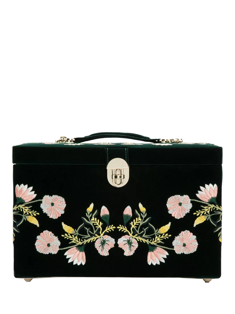 The WOLF Zoe jewellery box's velvet exterior is highly embroidered with classic floral designs as beautiful as its accessories inside. Features LusterLoc™ interior, pale gold hardware, and removable mini travel piece.