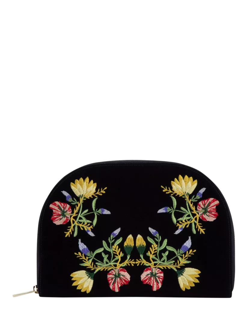 Storage: 2 earring holders, 2 ring rolls, 1 medium zip pocket, 1 large zip pocket, 4 necklace holders, 1 removable round mirror.