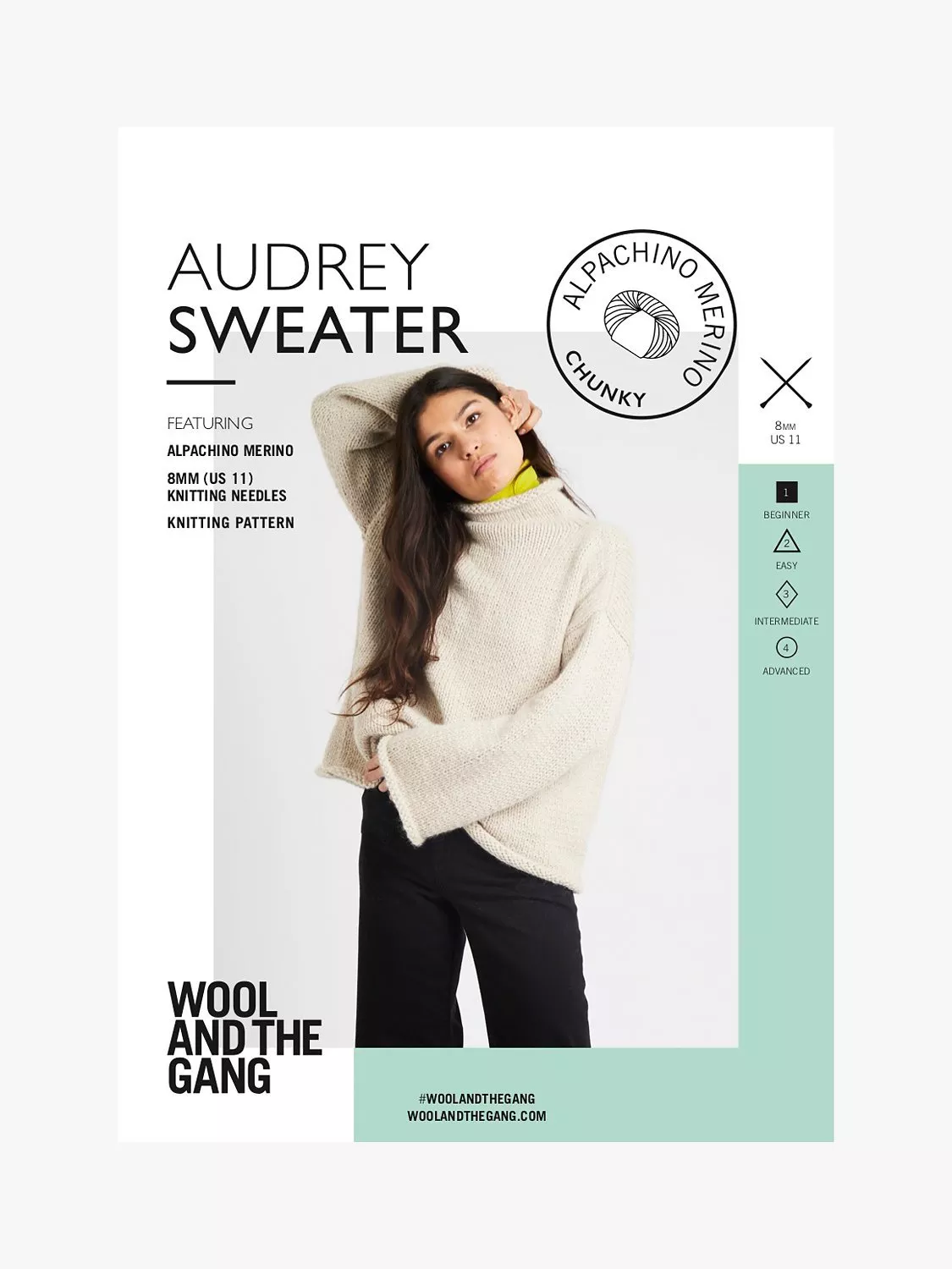 Audrey is a simple knit ideal for beginners and features a roll neck plus spacious sleeves. You will need 8-10 balls of Alpachino Merino (depending on size) and one pair of 8mm knitting needles.