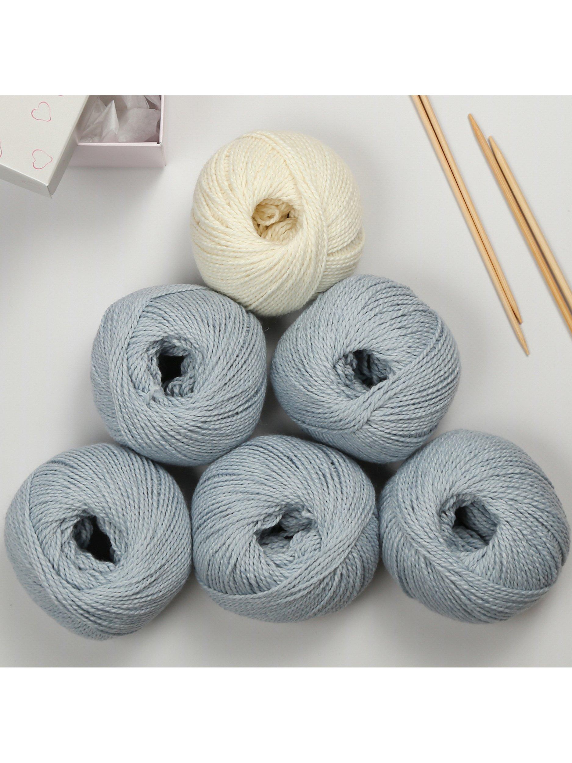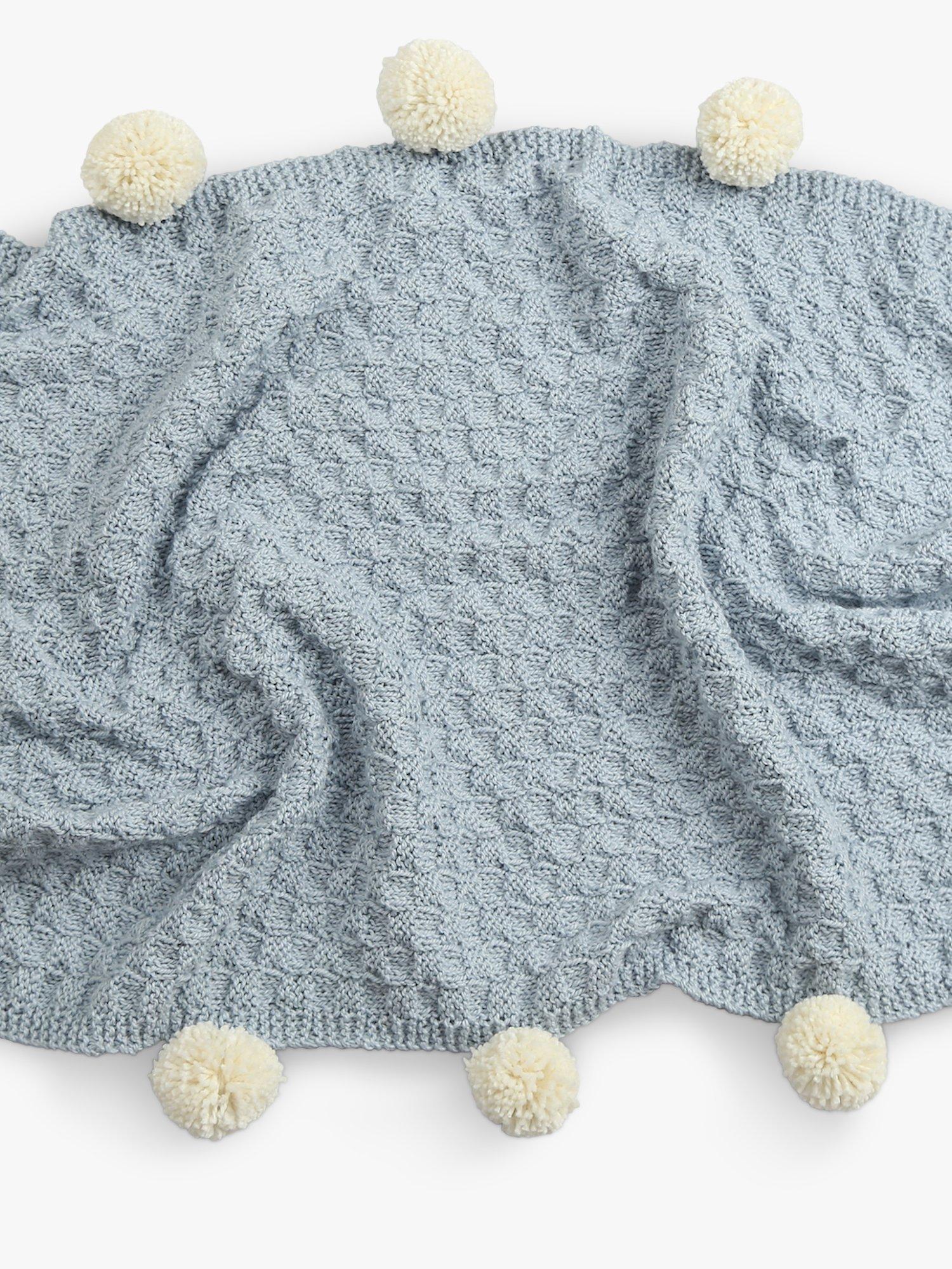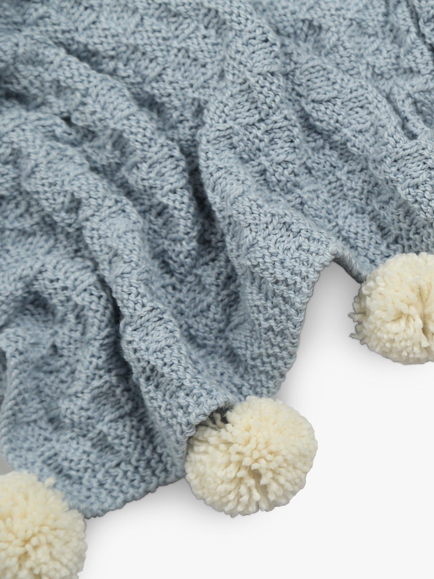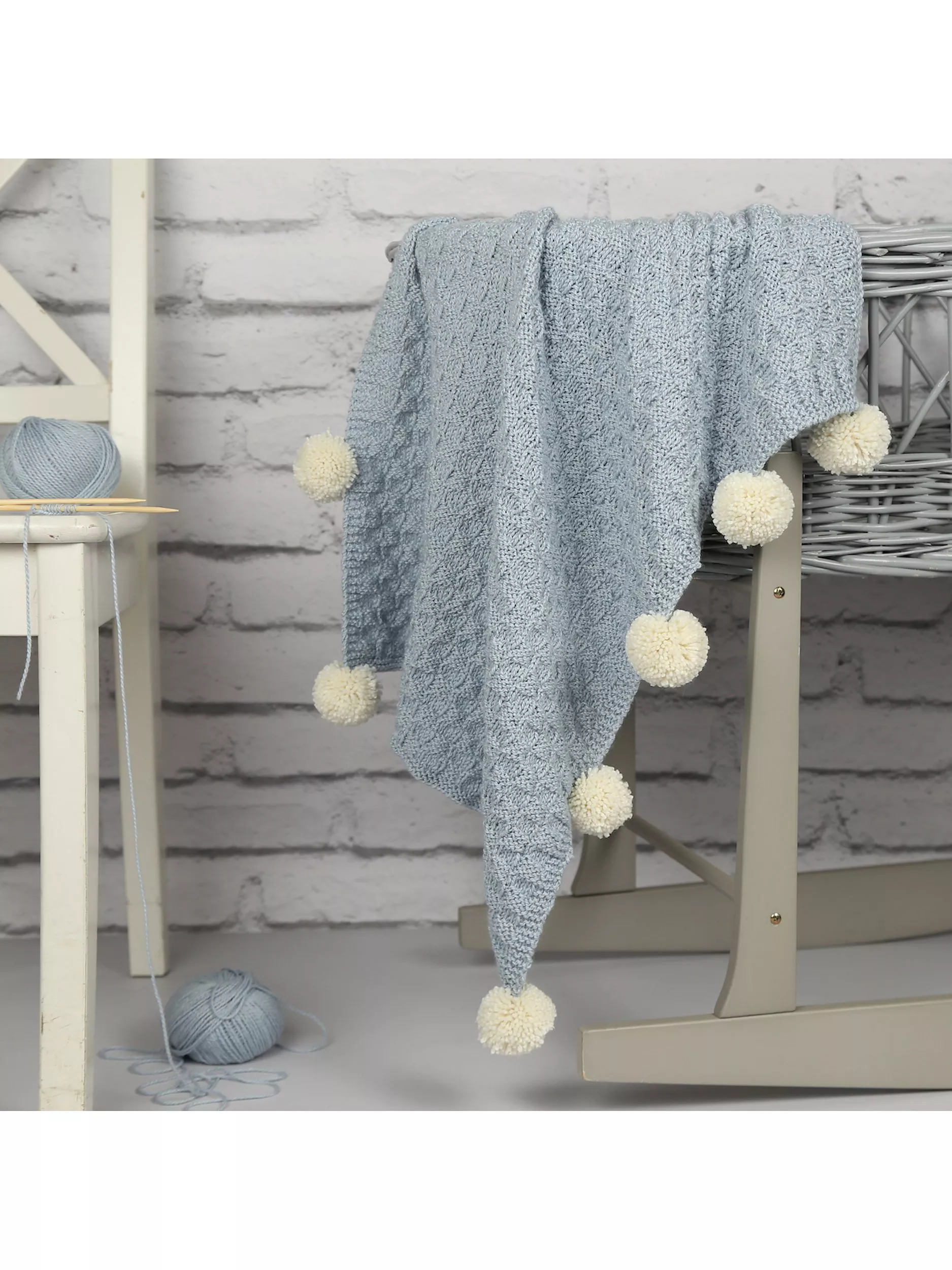 This knitting kit contains everything you need to create a pompom-trimmed baby blanket and is perfect for someone who is new to knitting.