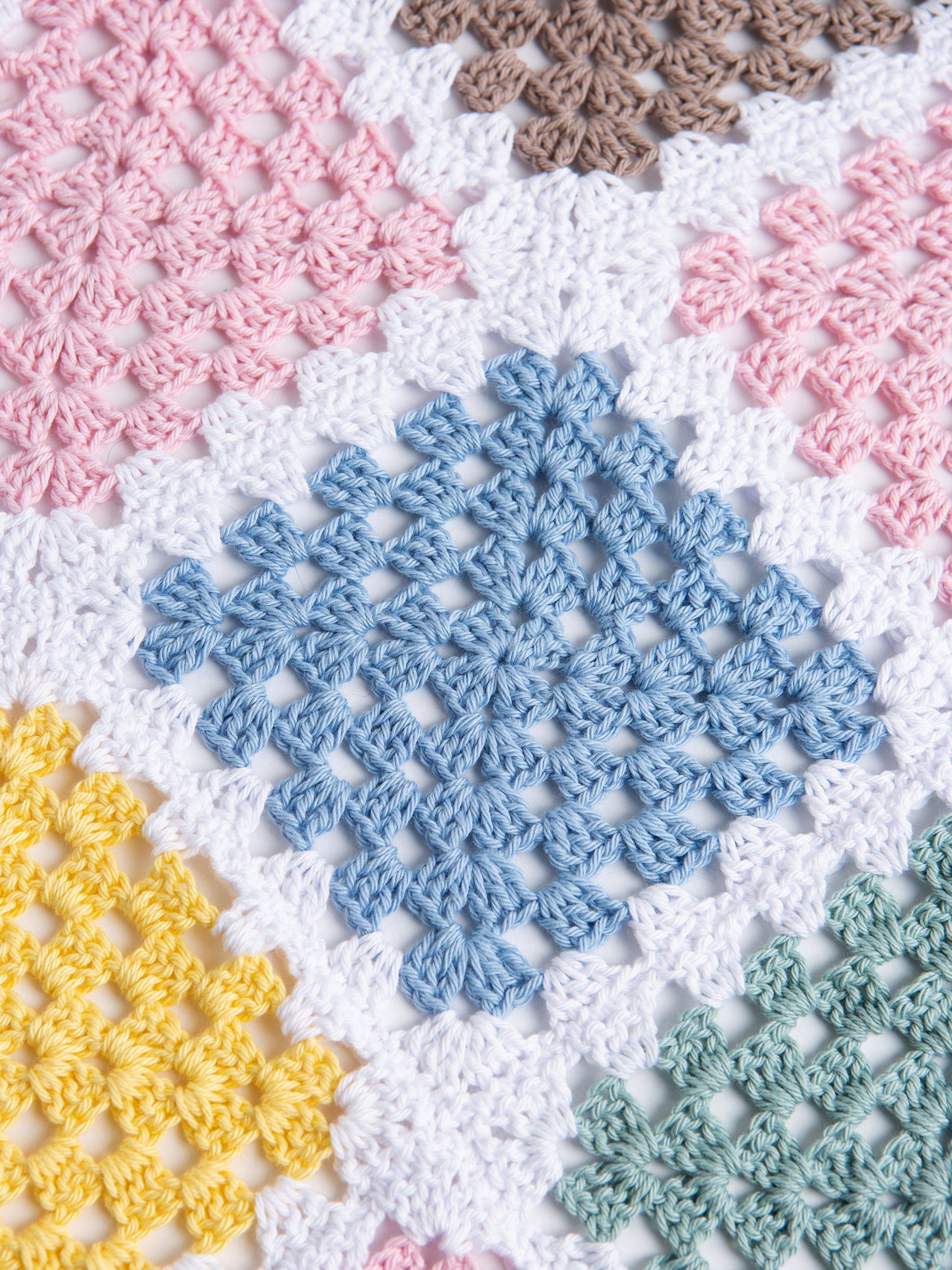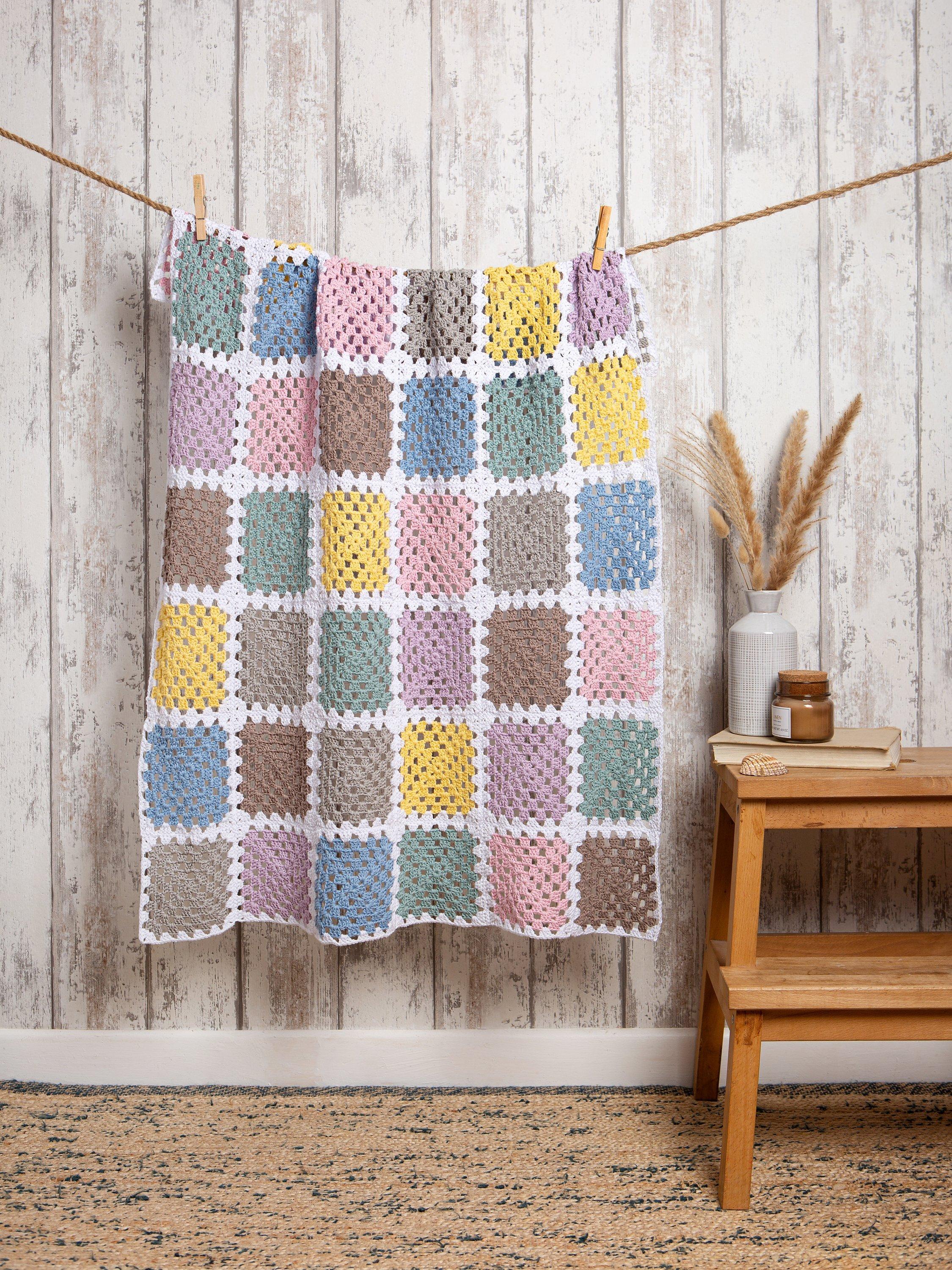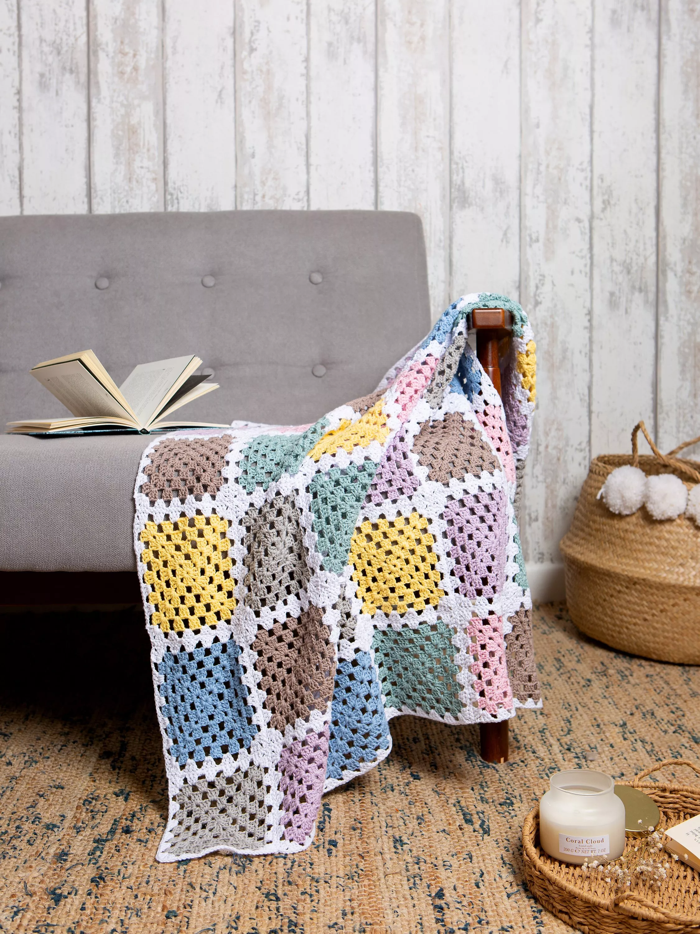 This granny square blanket has been designed to be crocheted in Wool Couture's light and soft Cotton Candy yarn, making it an ideal summer runner for your bed. It's made up of individual squares which are then crocheted together.