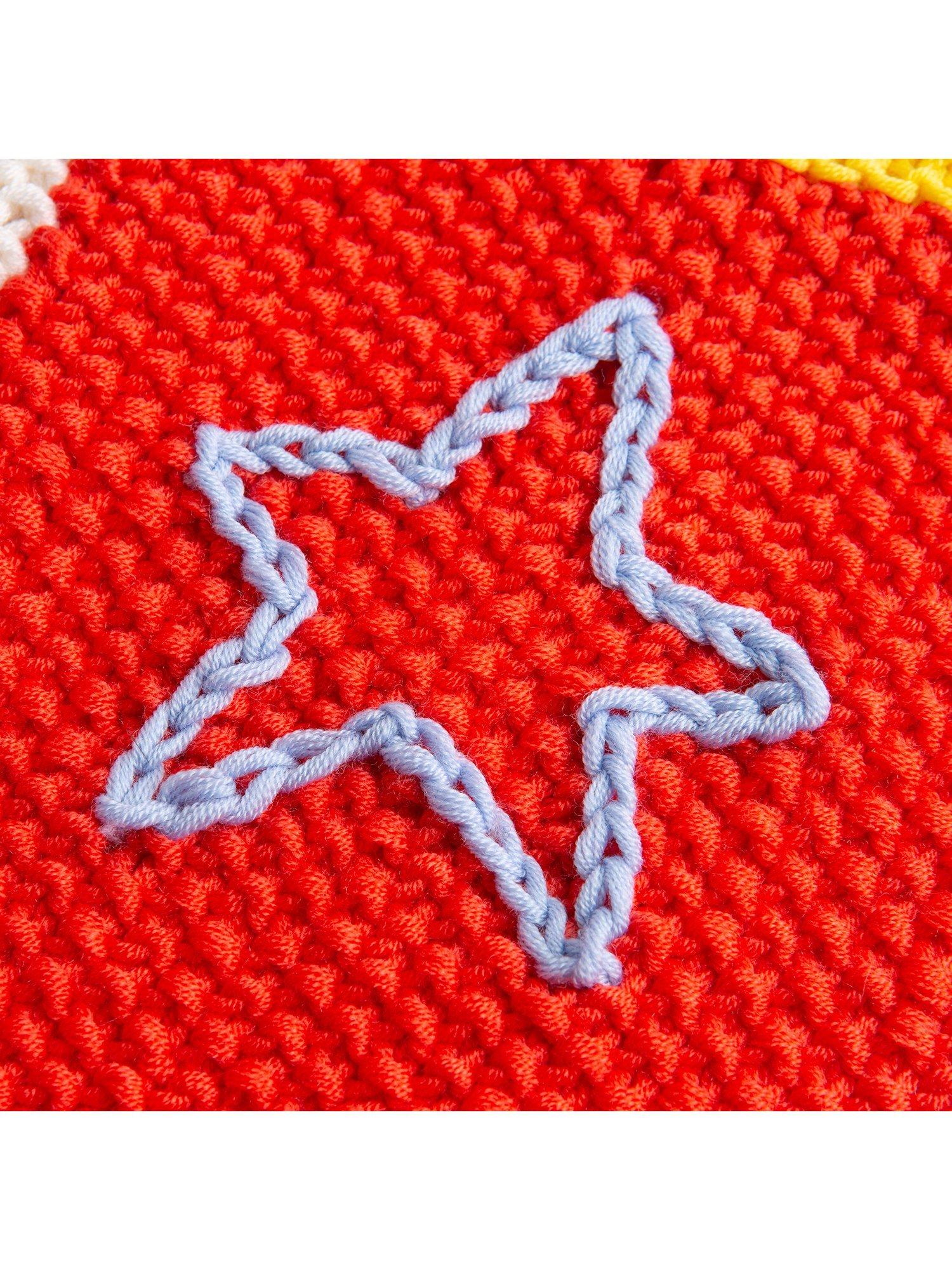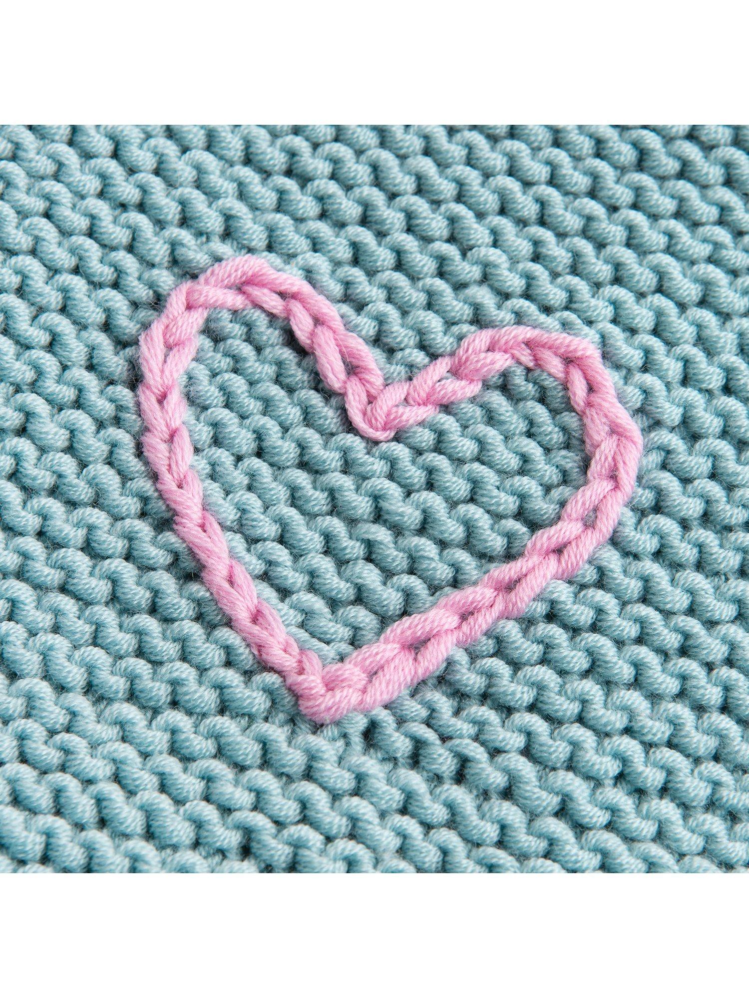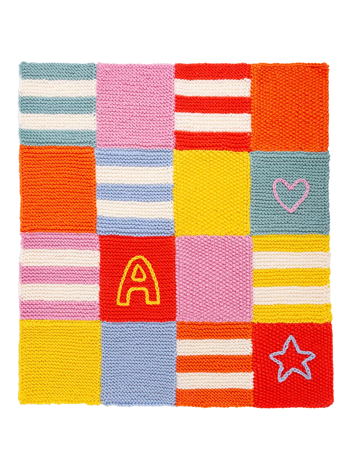With this easy-level blanket pattern, you will create bold and striped garter stitch and moss stitch squares. Plus you will get to make this blanket as unique as your little one, with chain stitching embroidery of your chosen initial, heart or star.