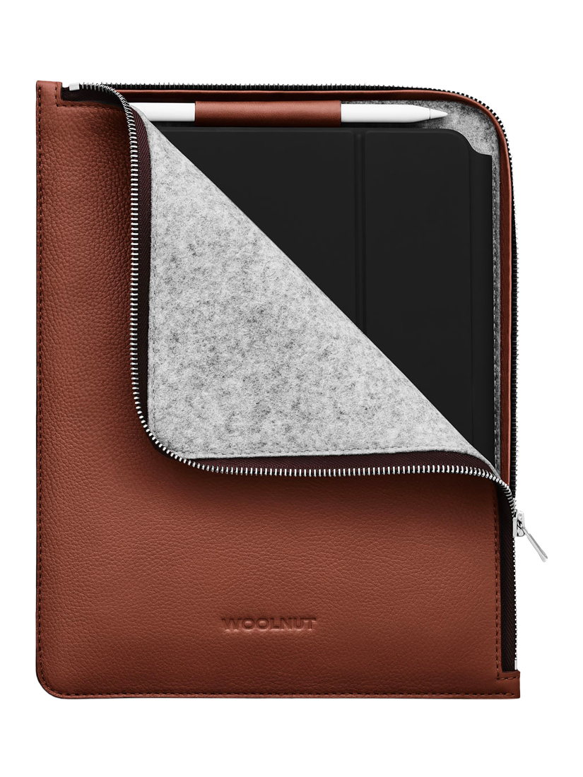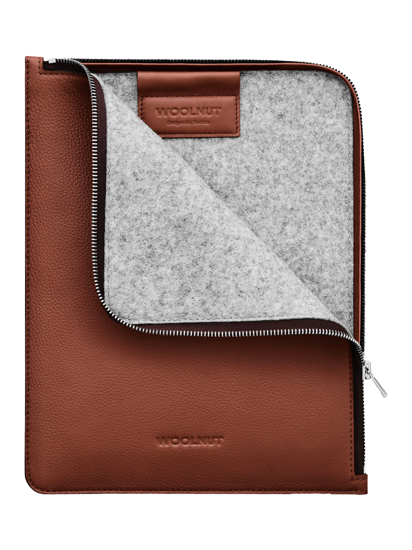 The folio exterior is made with WOOLNUT's signature full-grain leather of Scandinavian origin and the interior is lined with 100% natural wool felt. The zipper used for this folio is YKK's EXCELLA made in Japan, one of the world's most exclusive metal zippers.
