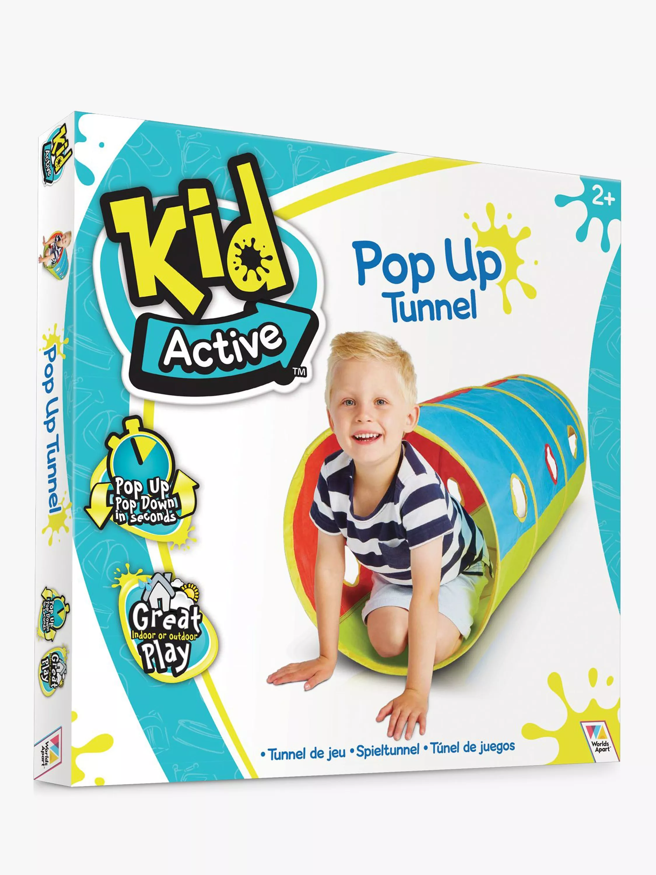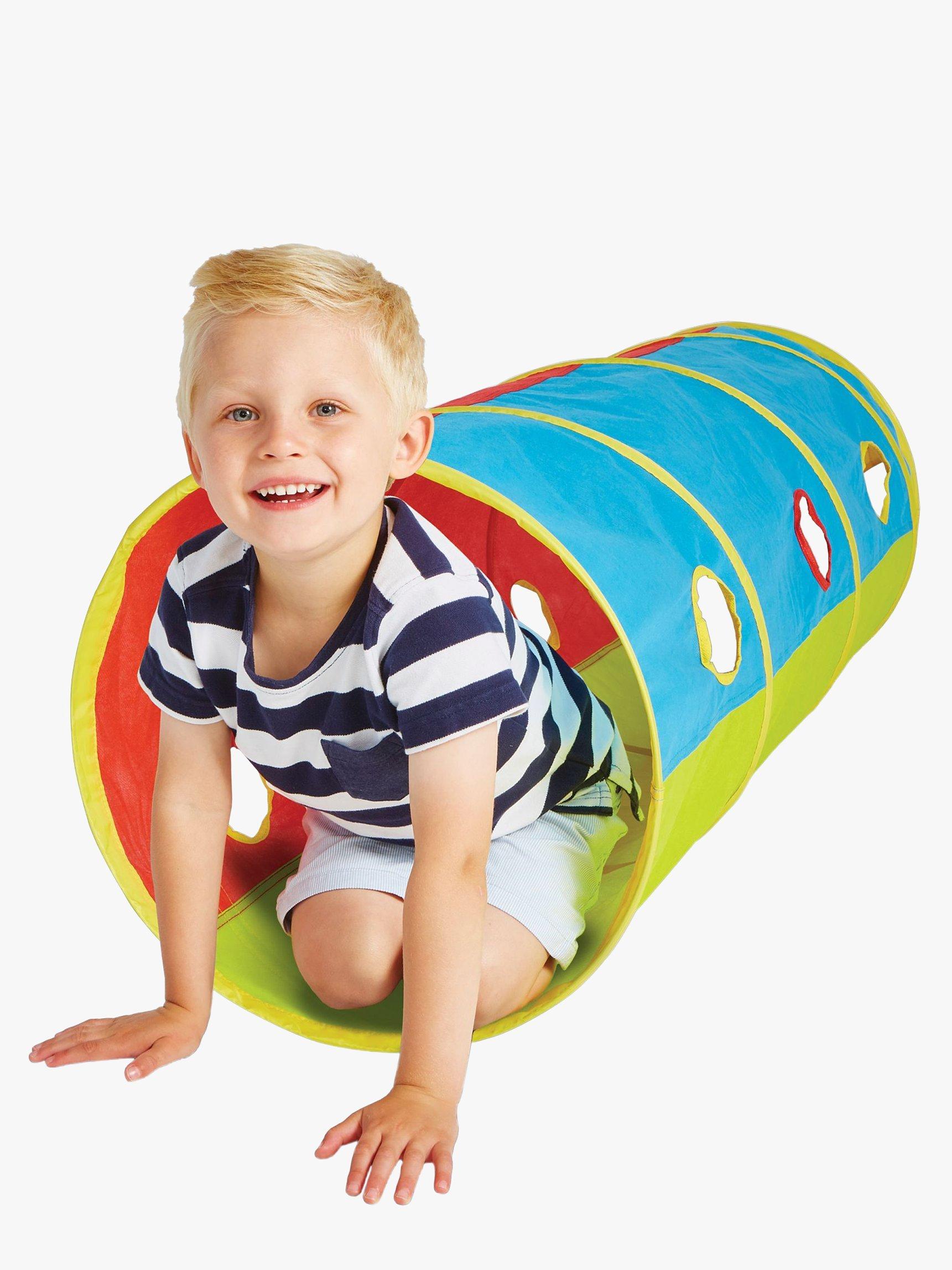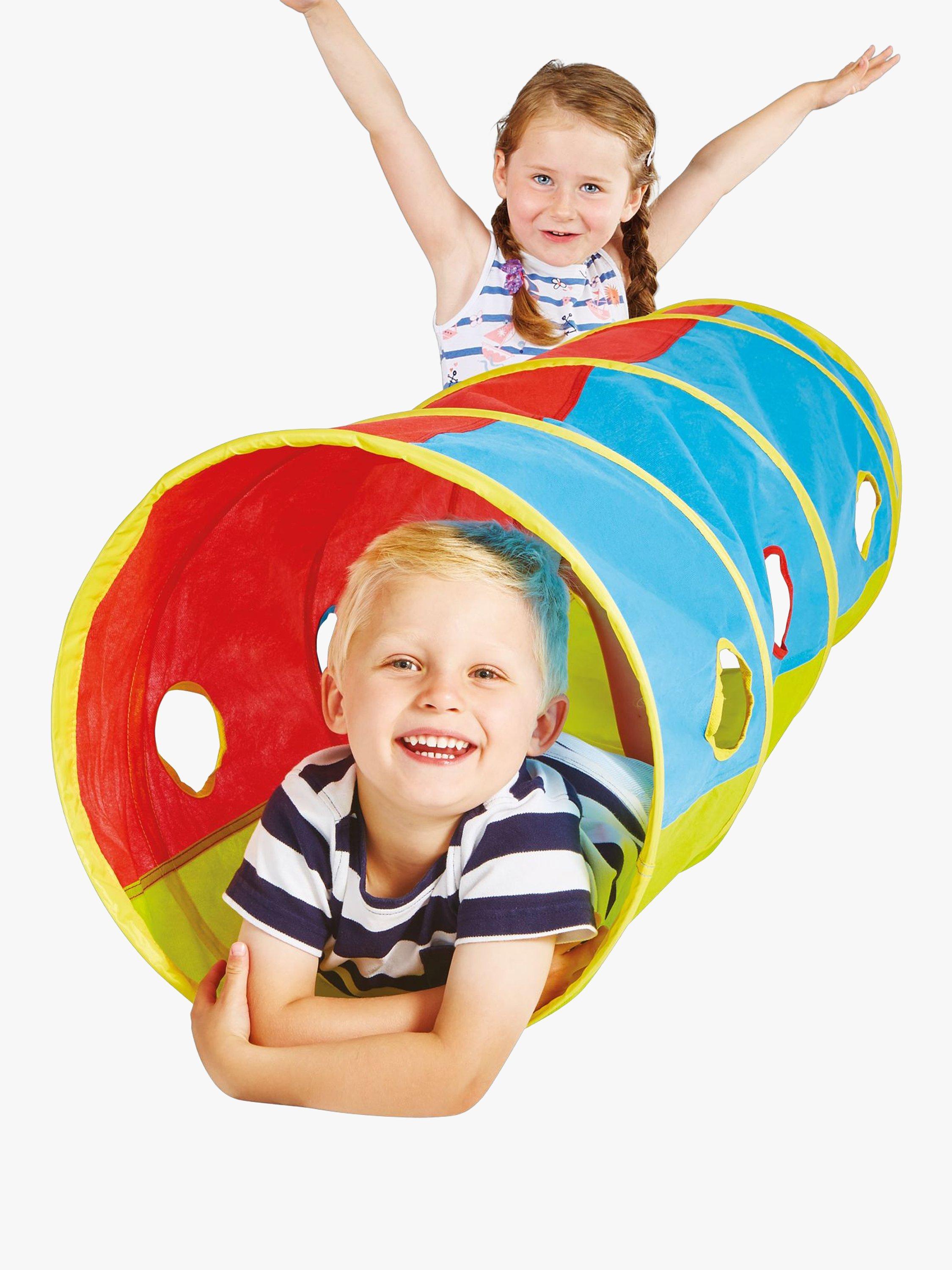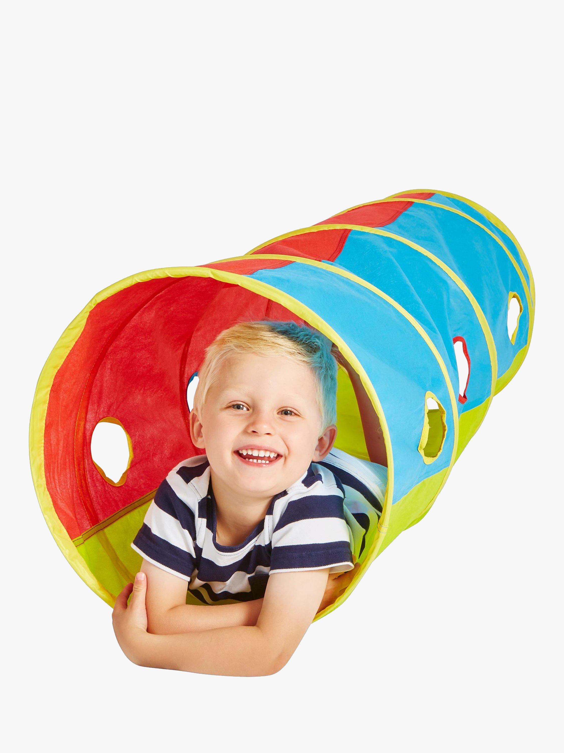 This Kid Active Pop Up Play Tunnel has you ready for playtime in no-time. Ideal for adventures inside or outdoors, this brightly coloured play tunnel is perfect for peeping out and crawling through with friends or siblings.