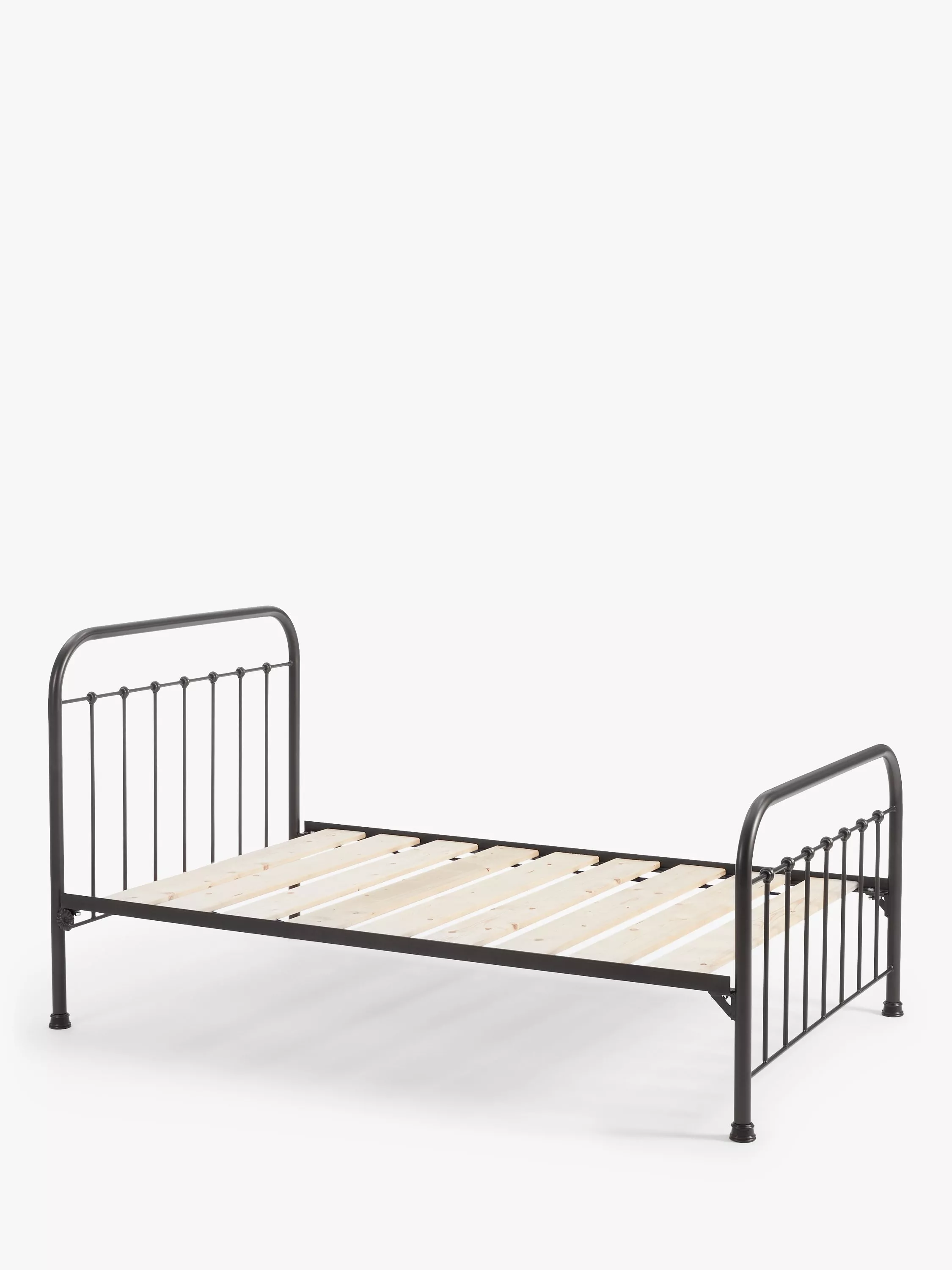 A modern classic, the Edward bed frame from Wrought Iron And Brass Bed Co. brings a more up-to-date feel to a traditional Victorian design. Showcasing slender bed posts, cast iron feet and finials, finished with a coordinating lower tailboard. Made in the UK from robust wrought iron. Solid slats made from Scandinavian pinewood provide a firmer base for your mattress and the powder-coated finish acts as a protective, high-quality layer.