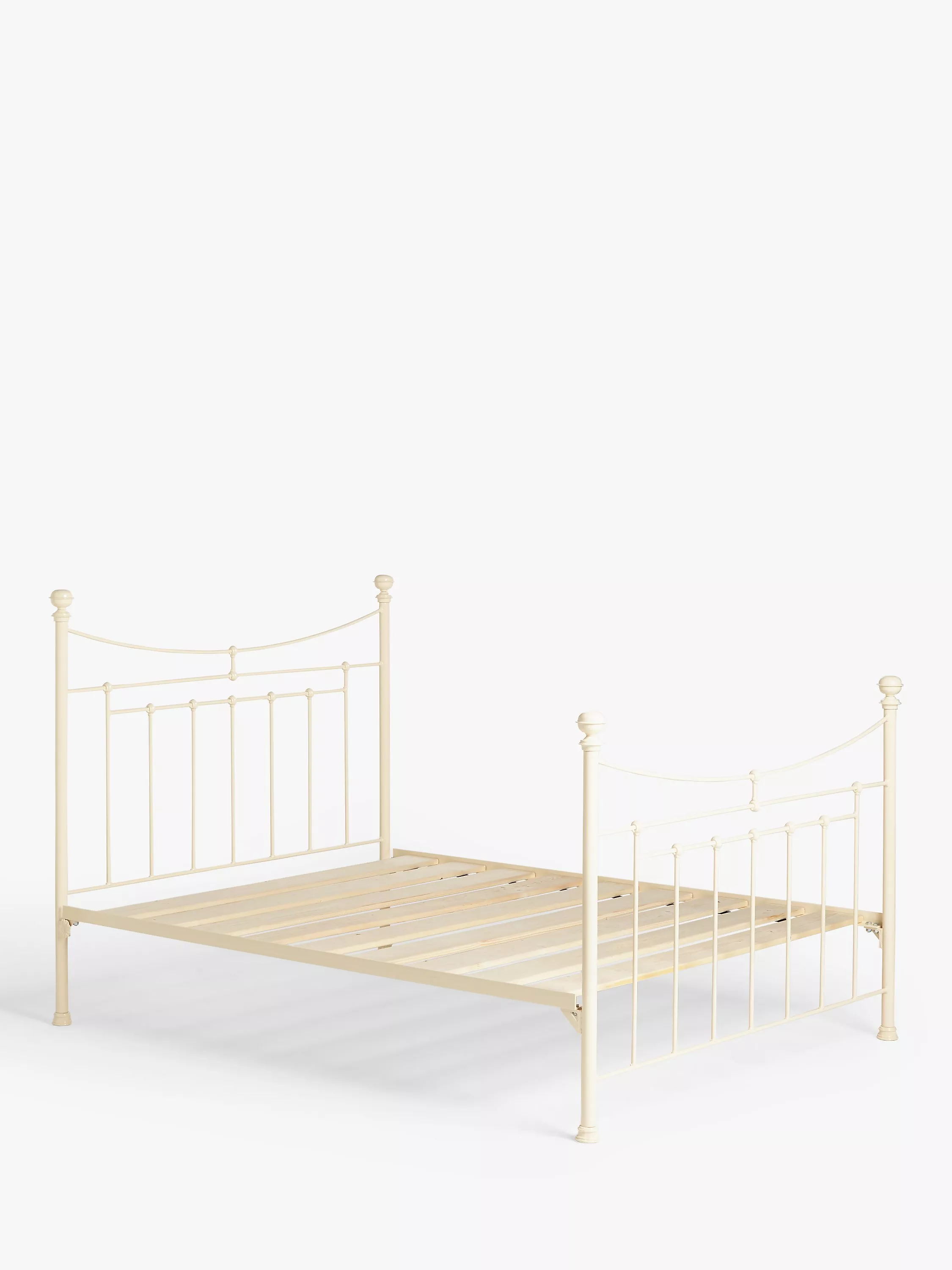 A timeless classic, the Lily bed frame from Wrought Iron And Brass Bed Co. balances the clean-lines of its slatted head and tailboard with downward, sweeping curve detailing. Made in the UK from solid wrought iron, its elegant frame references traditional Victorian design thanks to added cast iron fittings and colour-coordinating finials. It's also been coated in a high-quality powder-coated finish that acts as a protective layer. Made from Scandinavian pine wood, solid slats provide a firmer base for your mattress. This bed frame will become the centrepiece of your bedroom.