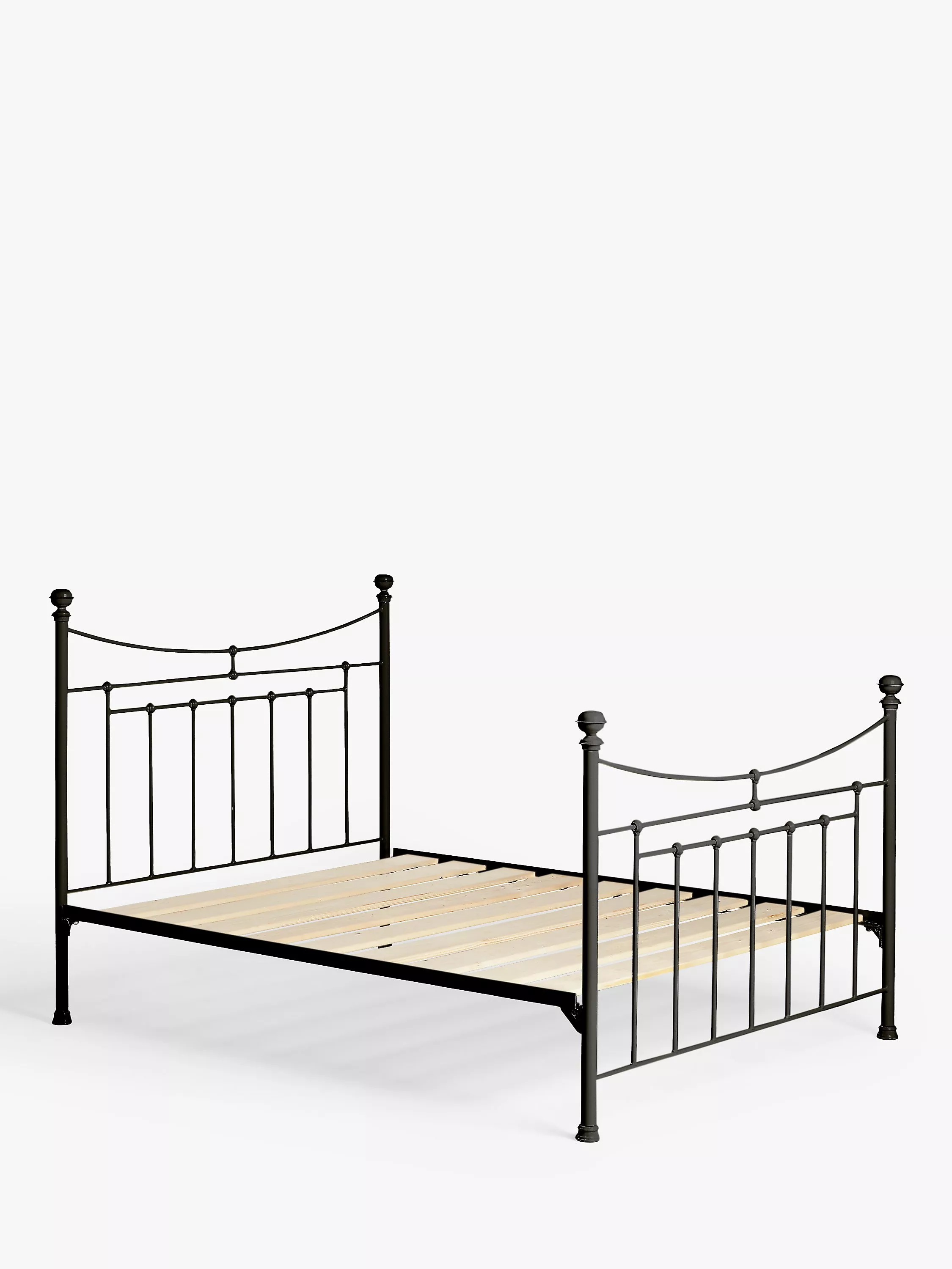 A timeless classic, the Lily bed frame from Wrought Iron And Brass Bed Co. balances the clean-lines of its slender slatted headboard and tailboard with downward, sweeping curve detailing. Made in the UK from solid wrought iron, its elegant frame references traditional Victorian design thanks to added cast iron fittings and colour-coordinating finials. It's also been coated in a high-quality powder-coated finish that acts as a protective layer. Made from Scandinavian pine wood, solid slats provide a firmer base for your mattress. This bed frame will become the centrepiece of your bedroom.