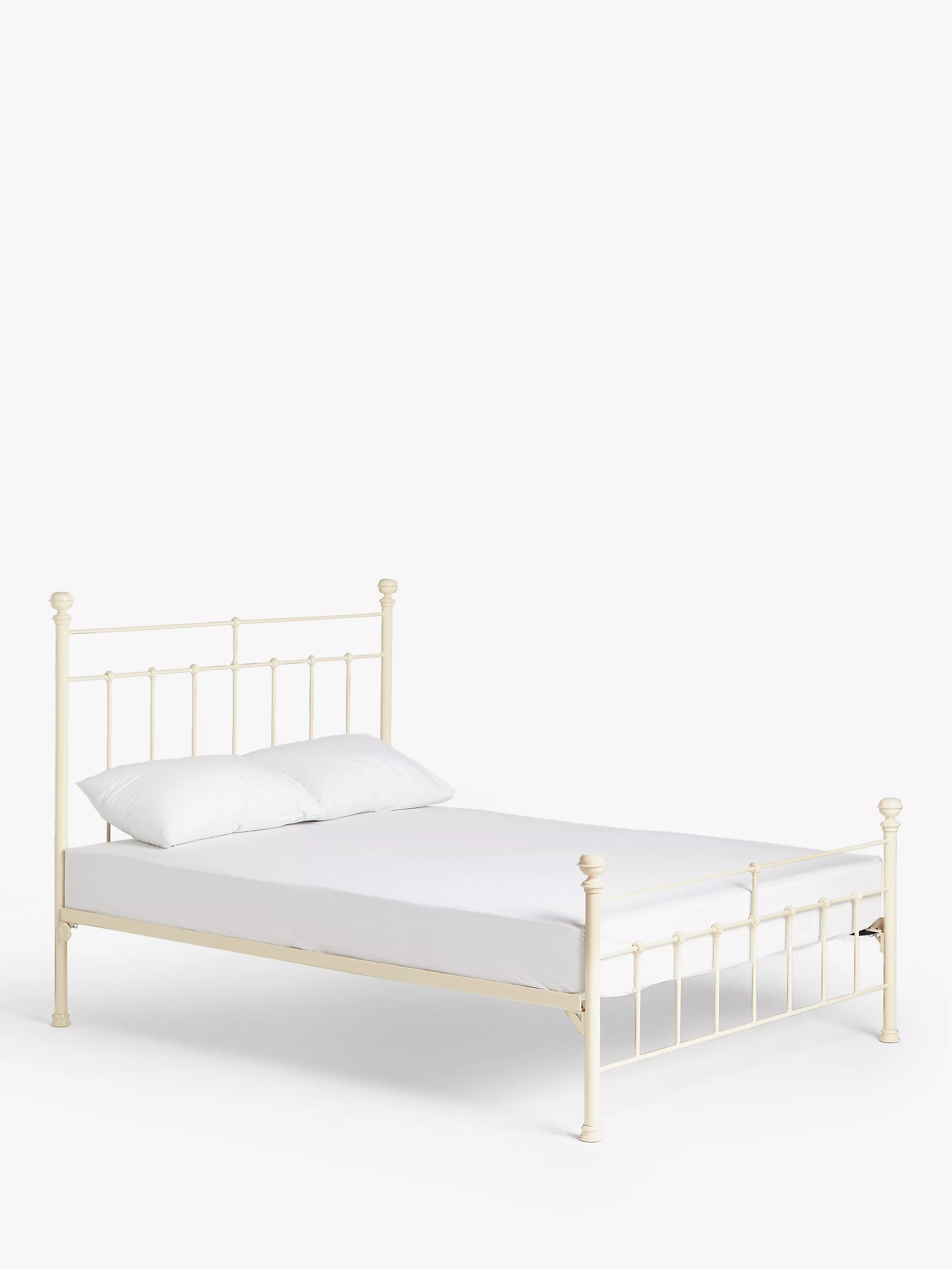 Made in the UK from solid wrought iron, the Sophie bed frame brings a more modern feel to a traditionally Victorian design. Its sleek frame incorporates a slatted headboard and a coordinating lower tailboard, both finished with cast iron feet and colour-coordinating finials. Solid slats made from Scandinavian pine wood provide a firmer base for your mattress, and the powder-coated finish acts as protective, high-quality layer.