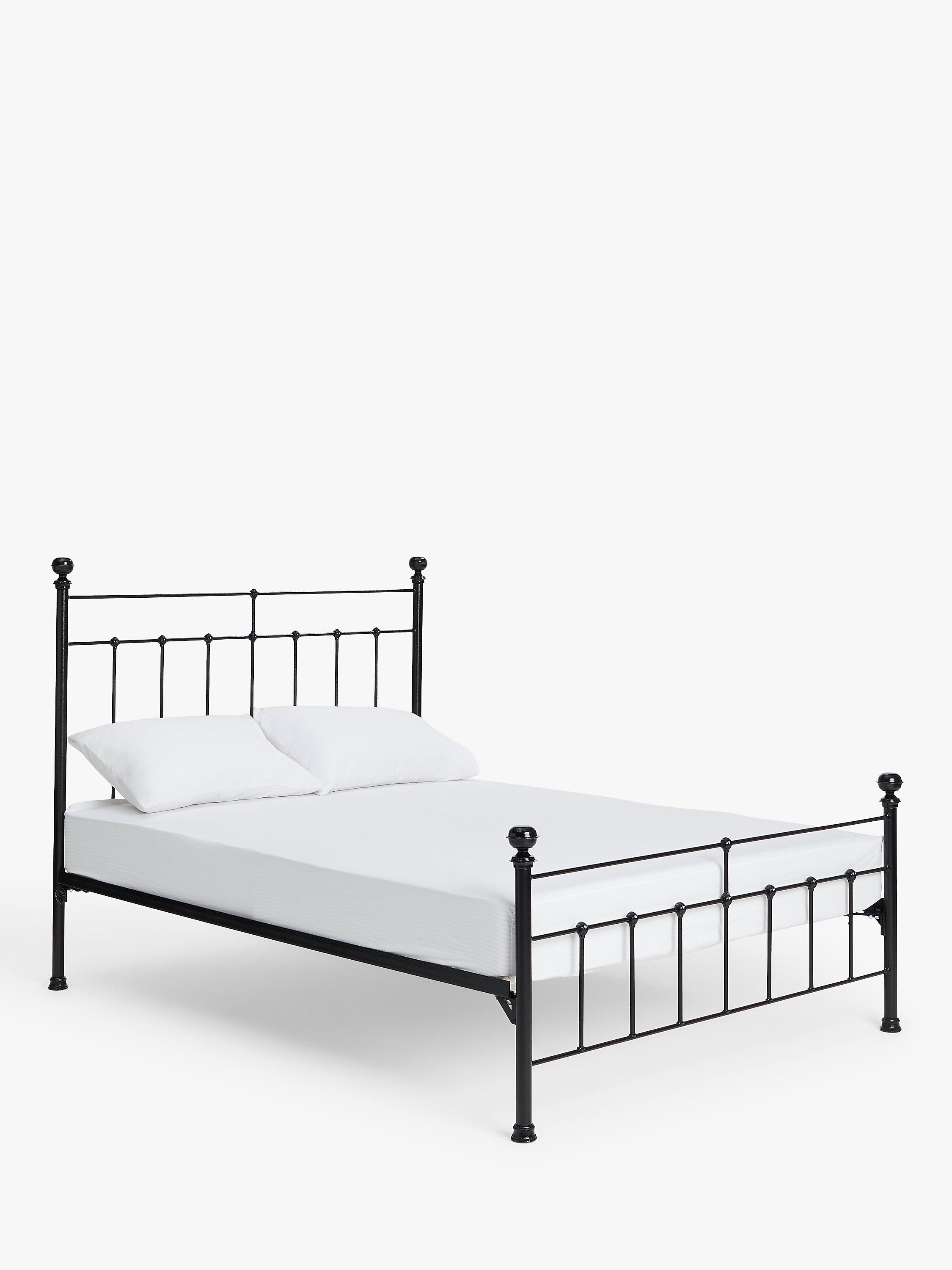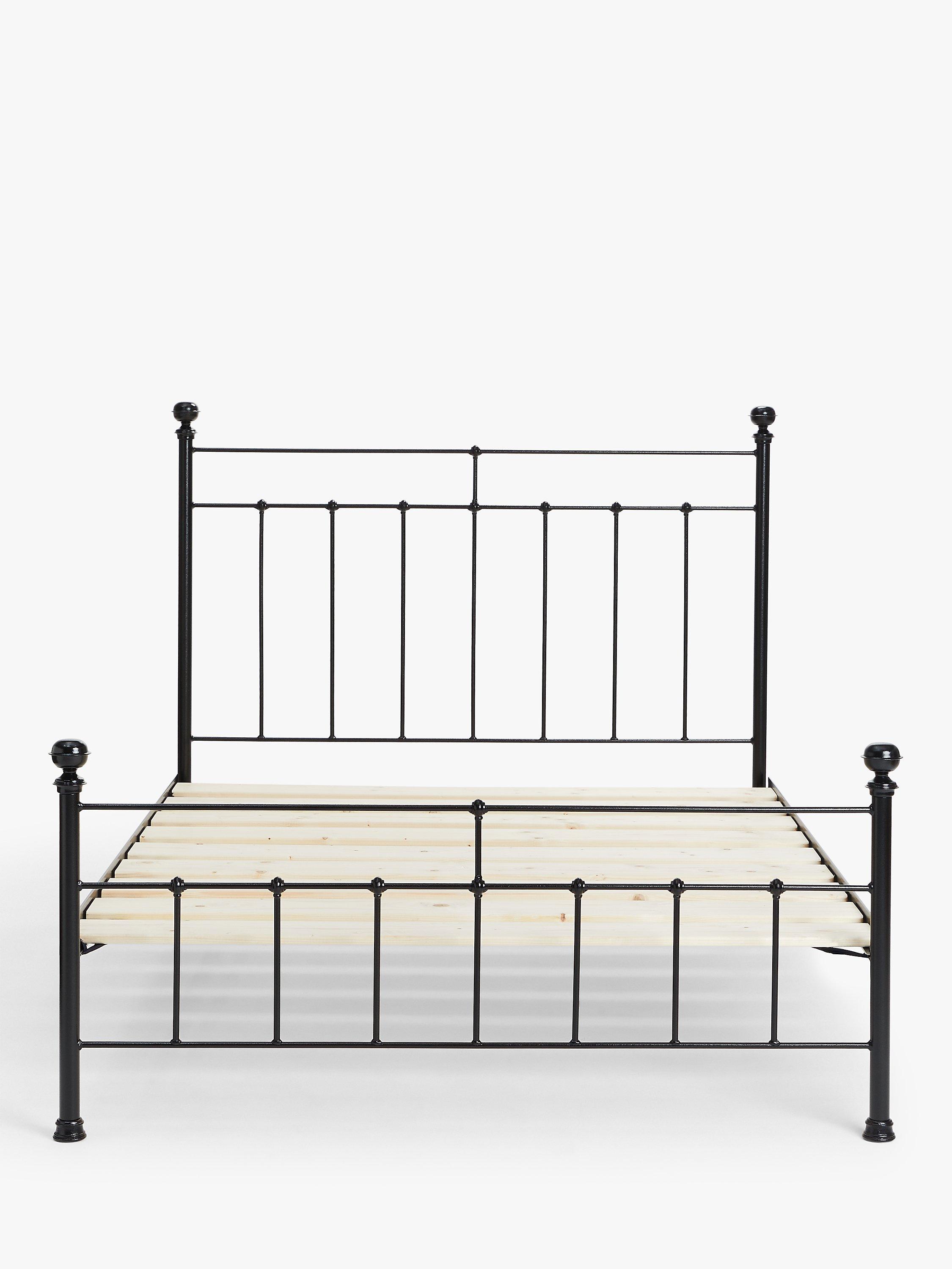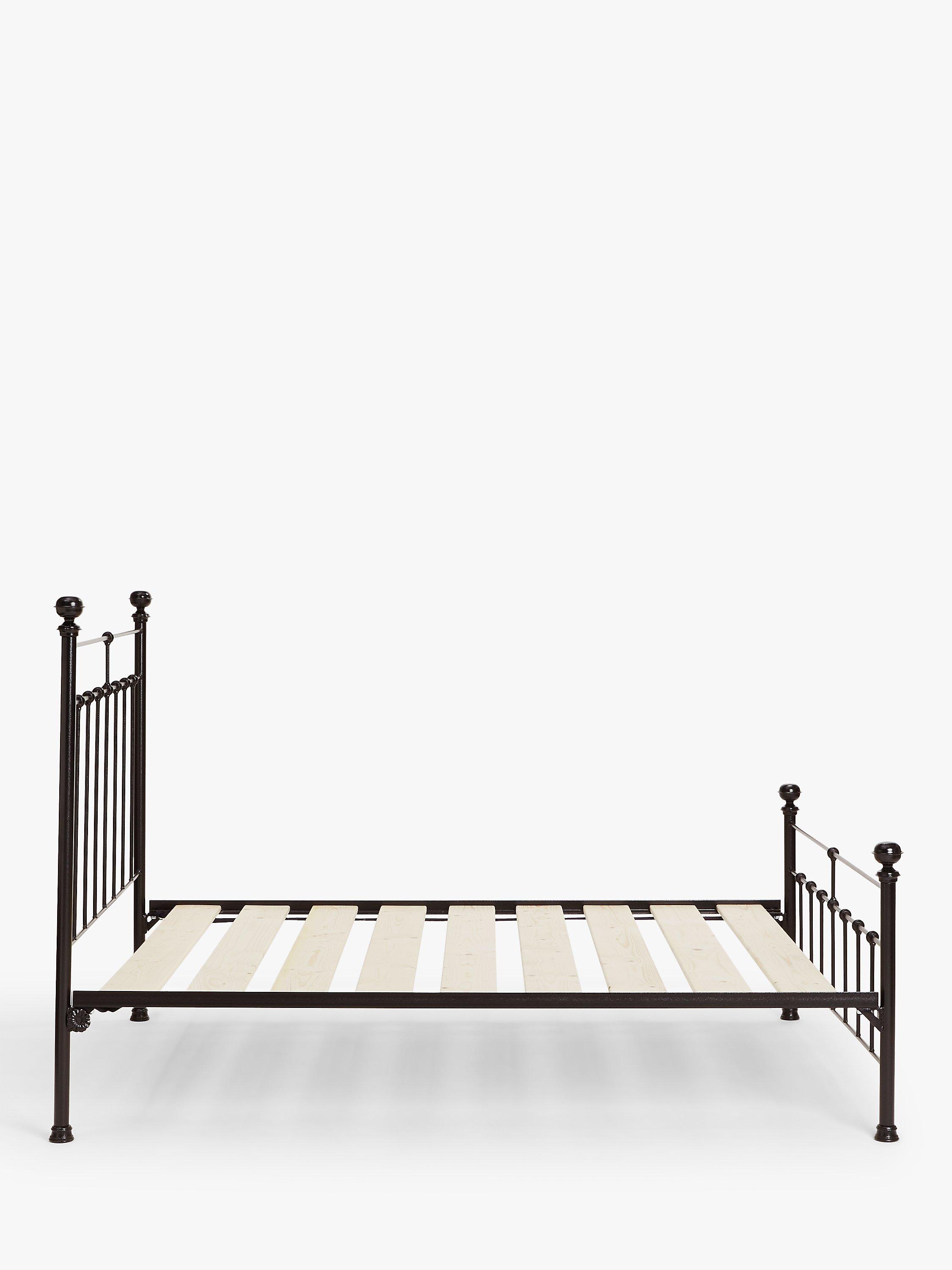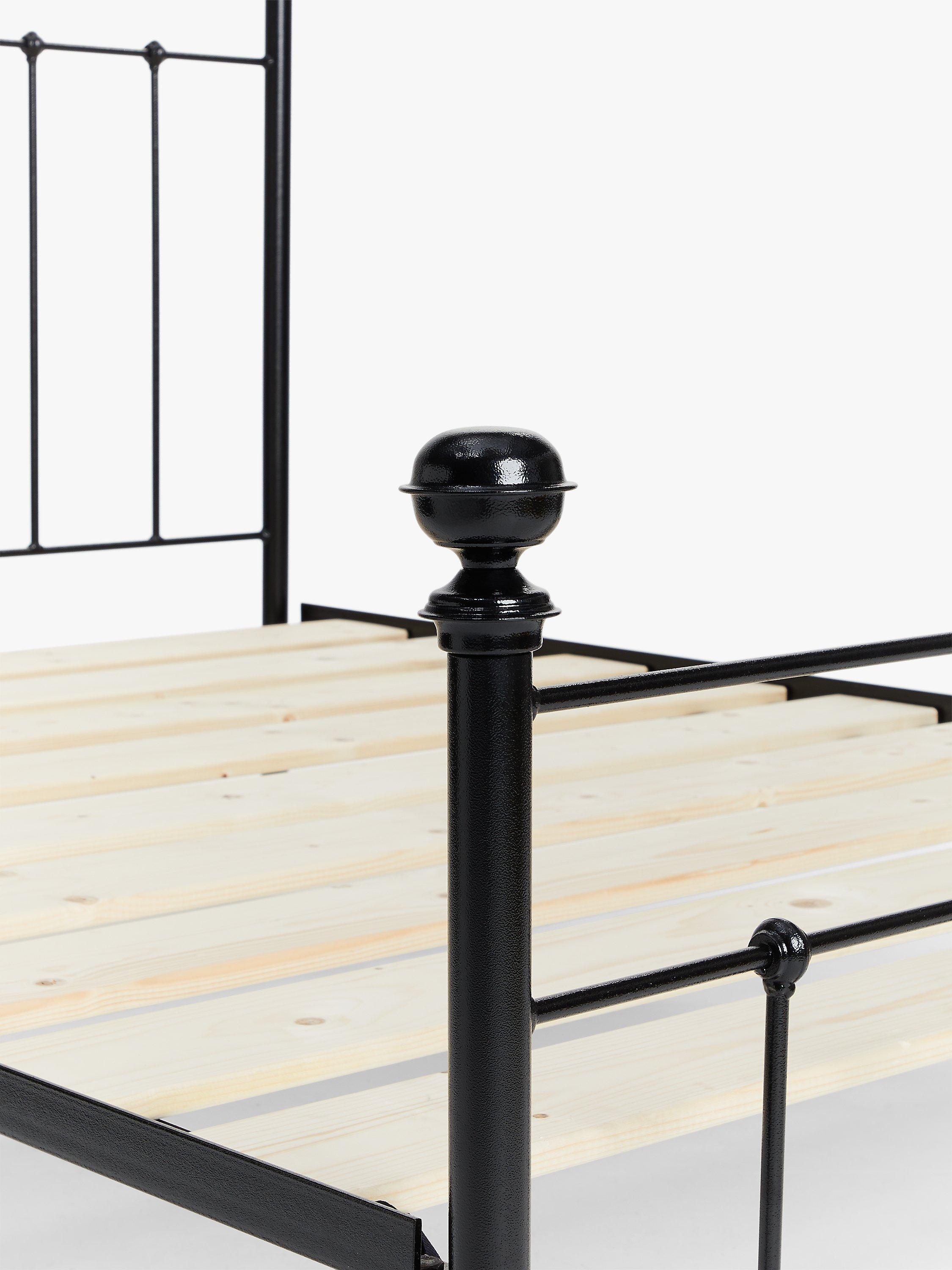 Made in the UK from solid wrought iron, the Sophie bed frame brings a more modern feel to a traditionally Victorian design. Its sleek frame incorporates a slatted headboard and a coordinating lower tailboard, both finished with cast iron feet and colour-coordinating finials. Solid slats made from Scandinavian pine wood provide a firmer base for your mattress, and the powder-coated finish acts as protective, high-quality layer.