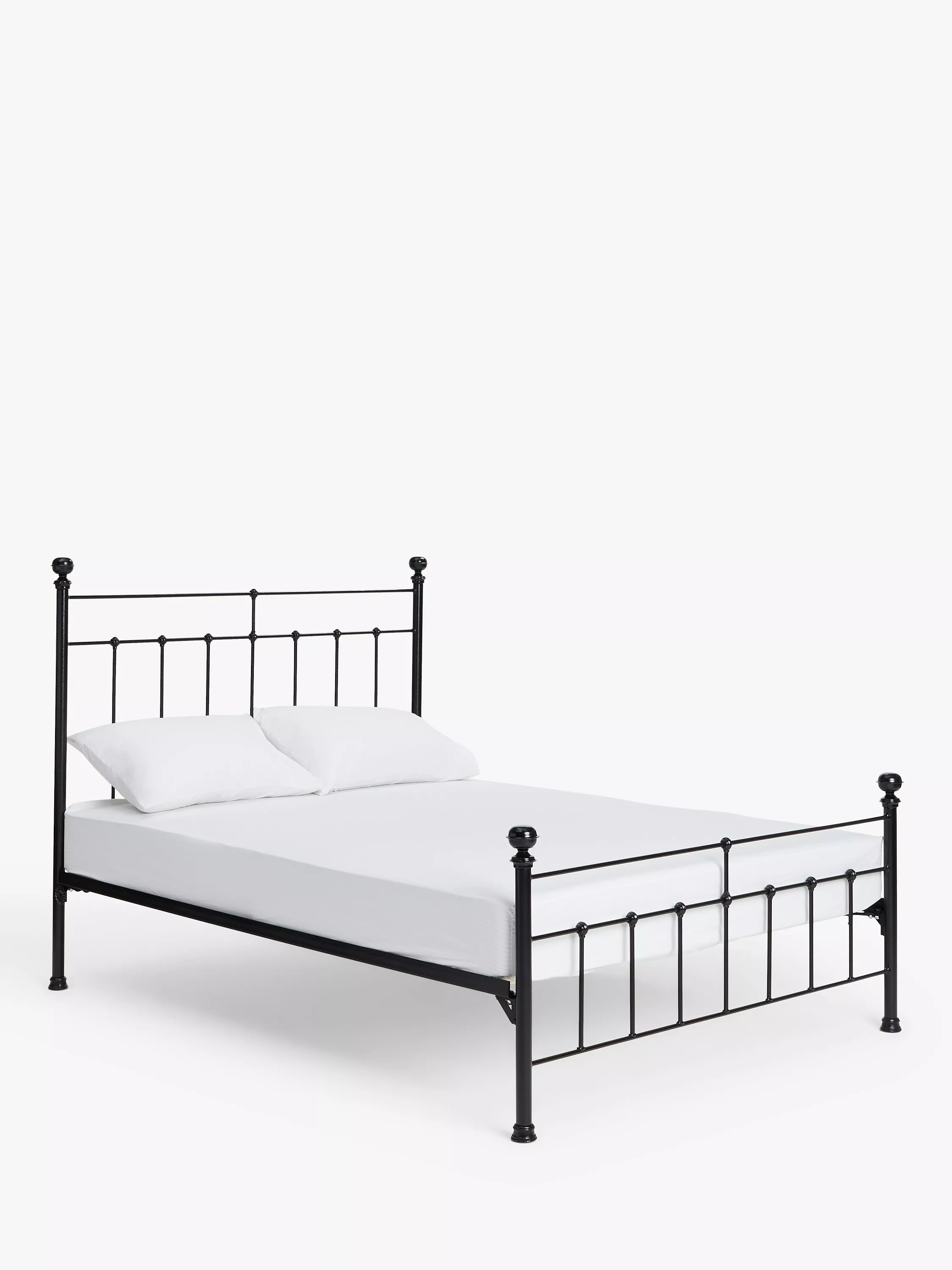 Made in the UK from solid wrought iron, the Sophie bed frame brings a more modern feel to a traditionally Victorian design. Ideal for smaller bedrooms, its sleek frame incorporates a slatted headboard and a coordinating lower tailboard, both finished with cast iron feet and colour-coordinating finials. Solid slats made from Scandinavian pine wood provide a firmer base for your mattress, and the powder-coated finish acts as protective, high-quality layer.