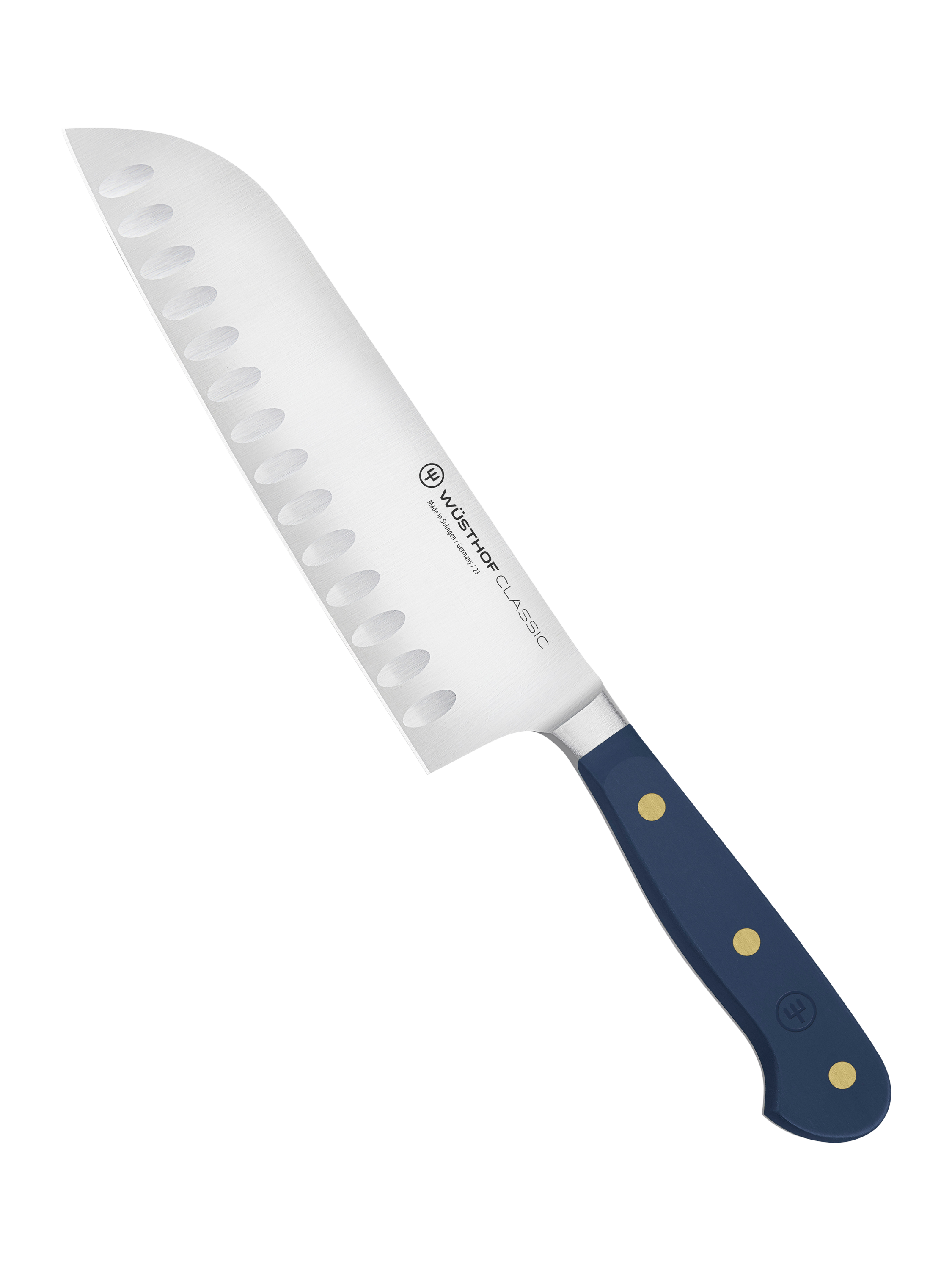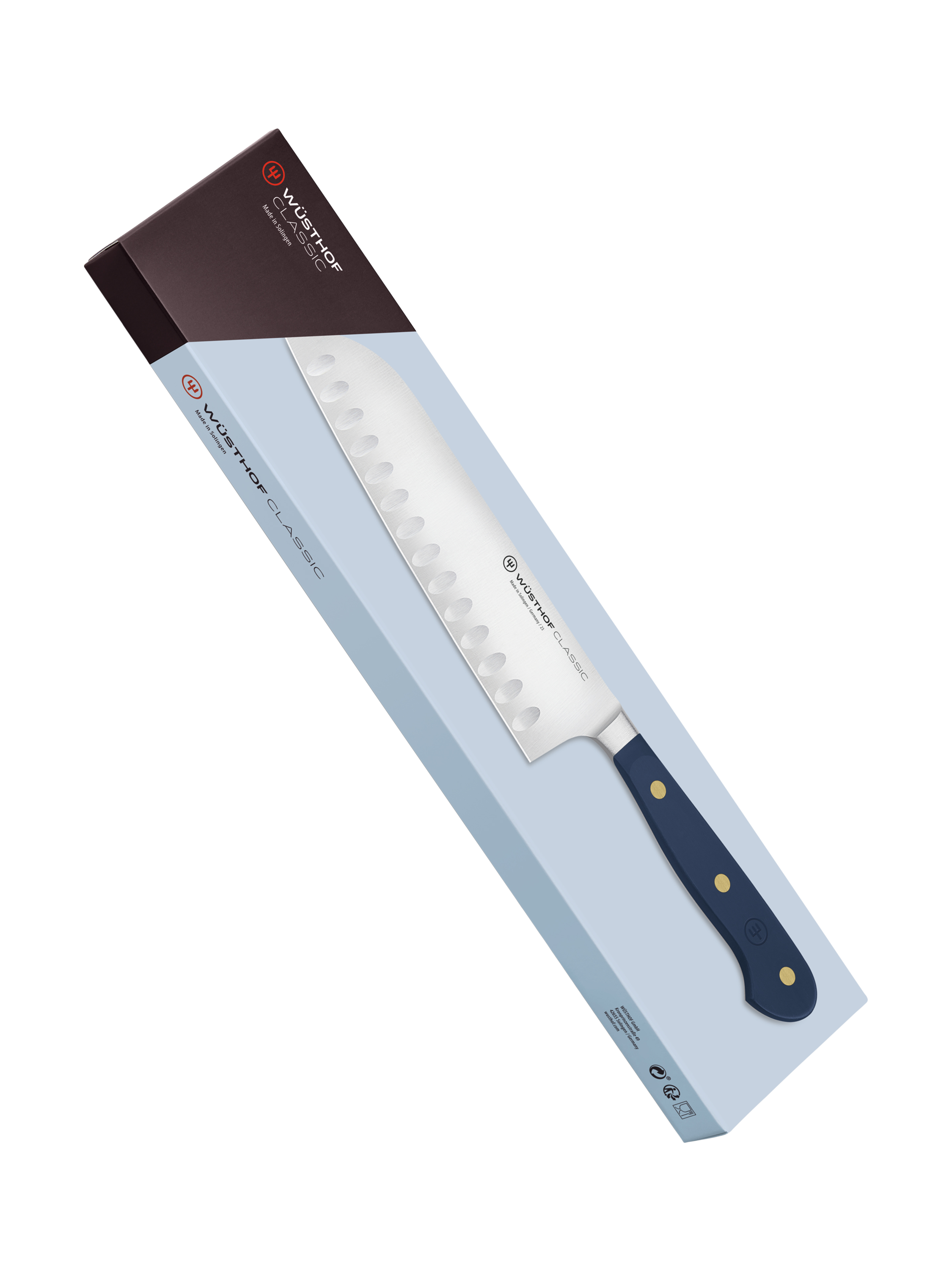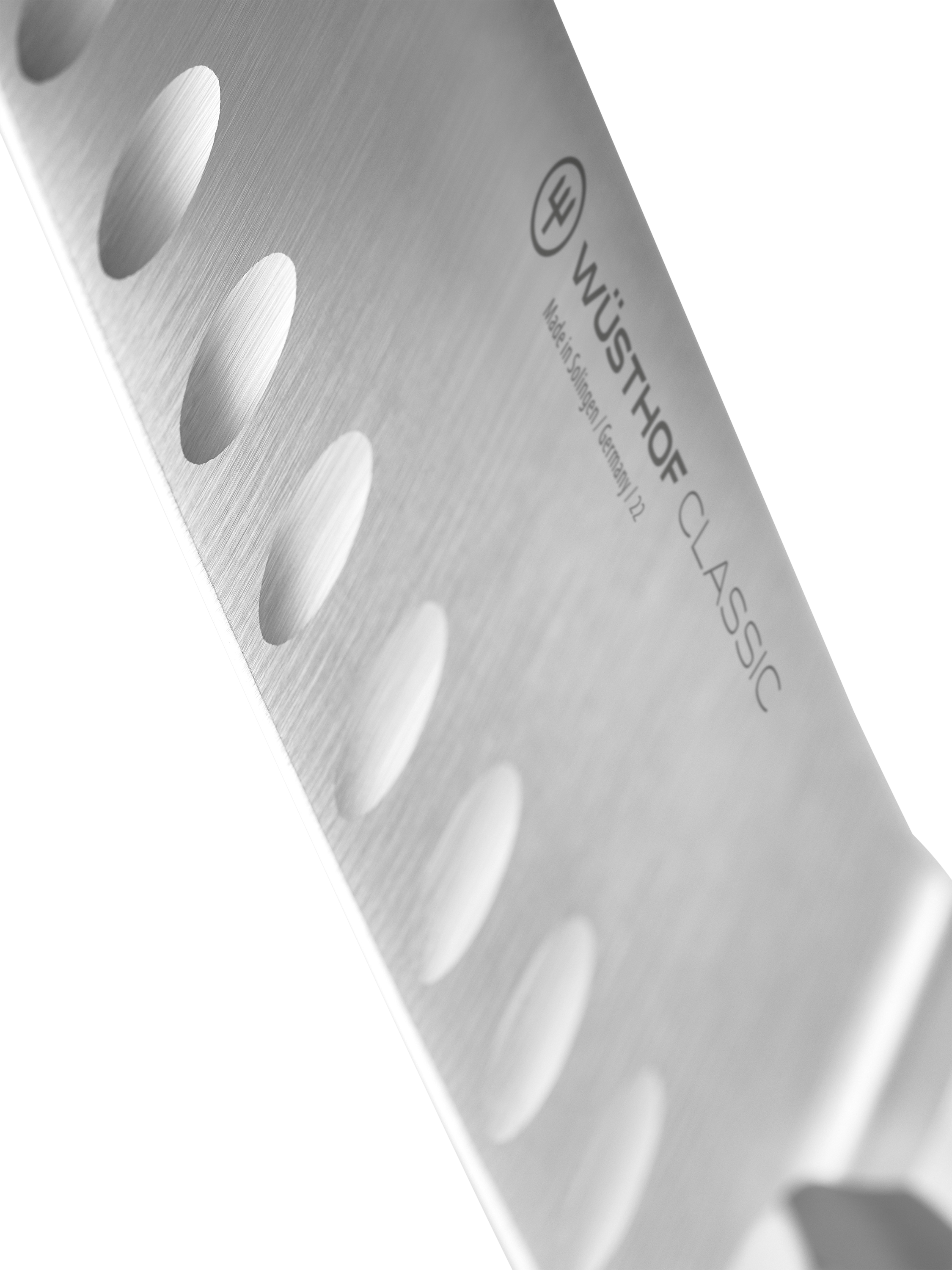 Developed in consultation with professional chefs, this Santoku from WÜSTHOF, with its traditional Asian-style knife shape, has hollows along the edge to prevent ingredients from sticking. Perfect for slicing fish and meat, chopping herbs or dicing vegetables. The sharp blade of a santoku can be used for regular or wafer-thin cuts.