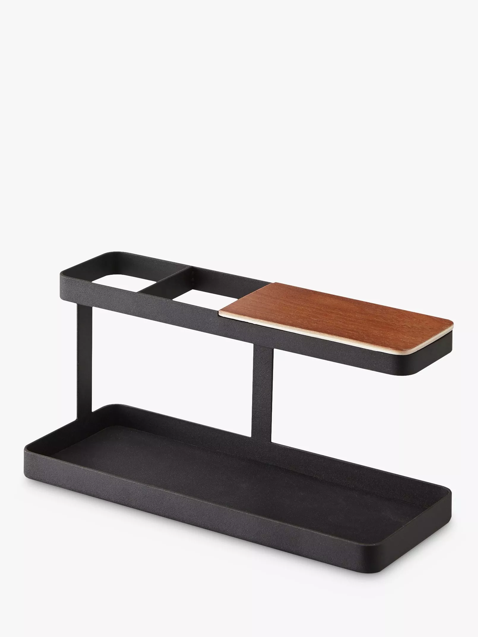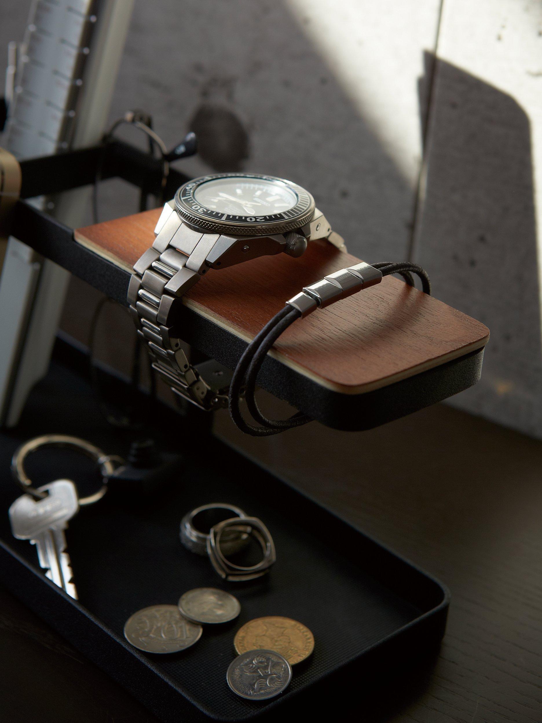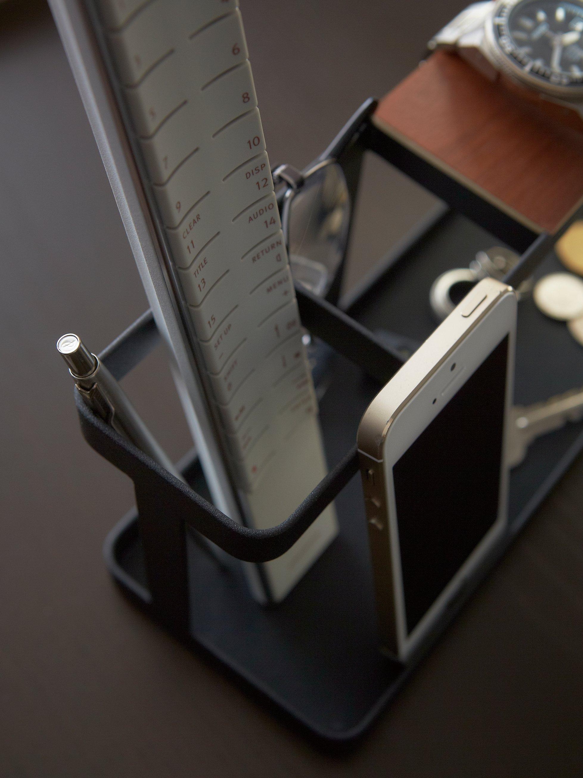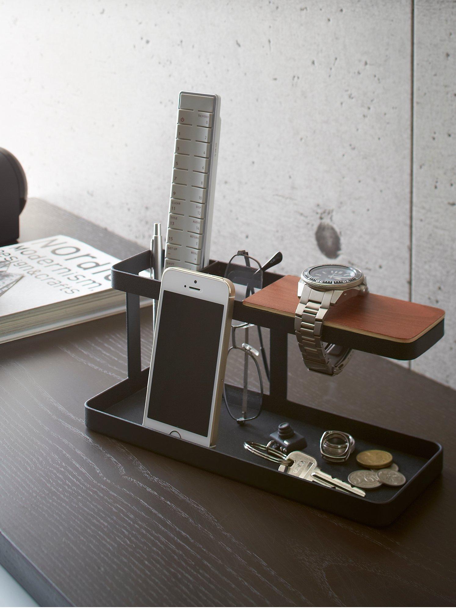 This stylish masculine storage unit for desktops will fit your smartphone, watch, change and other accessories with ease, taking up minimal space on your furniture surfaces.