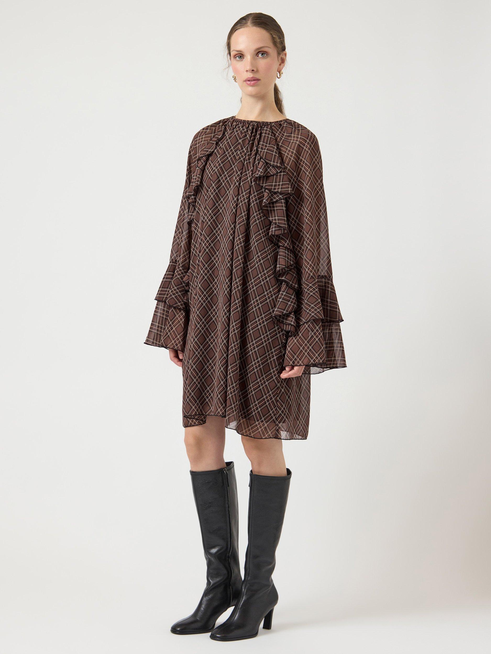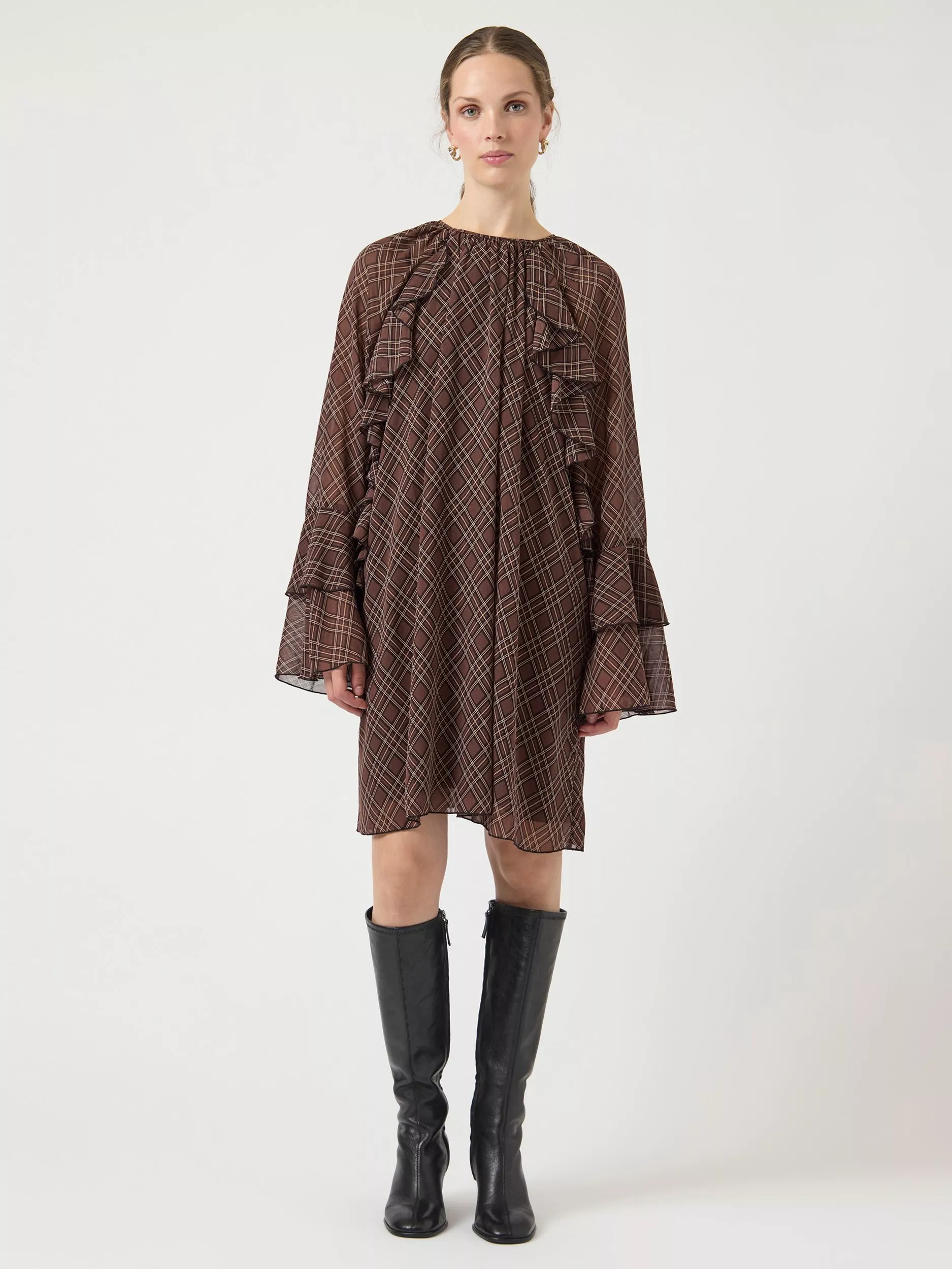 This YAS mini shift dress brings fresh energy to your routine. The clever check pattern and easy round neck suit your schedule, while ruffled accents bring movement and fun.