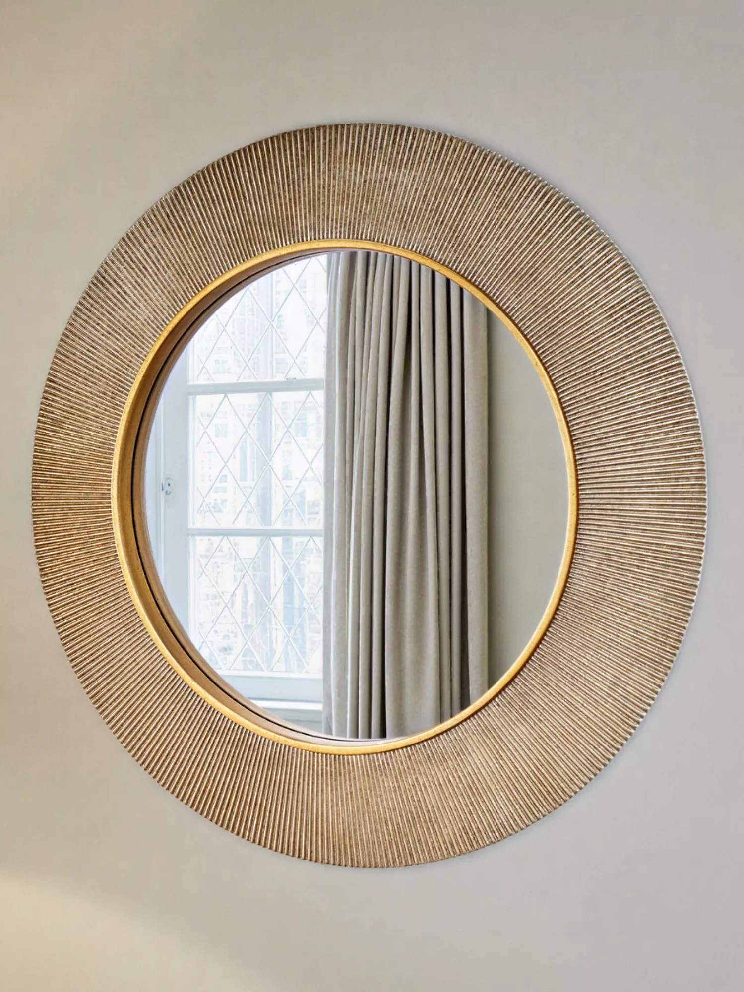 Elevate your home decor with the Aubry round mirror featuring an elegant tonal trim and textured frame. This versatile piece not only enhances the aesthetic of any room but also creates the illusion of a larger space, making it perfect for entryways, living rooms or bedrooms.
