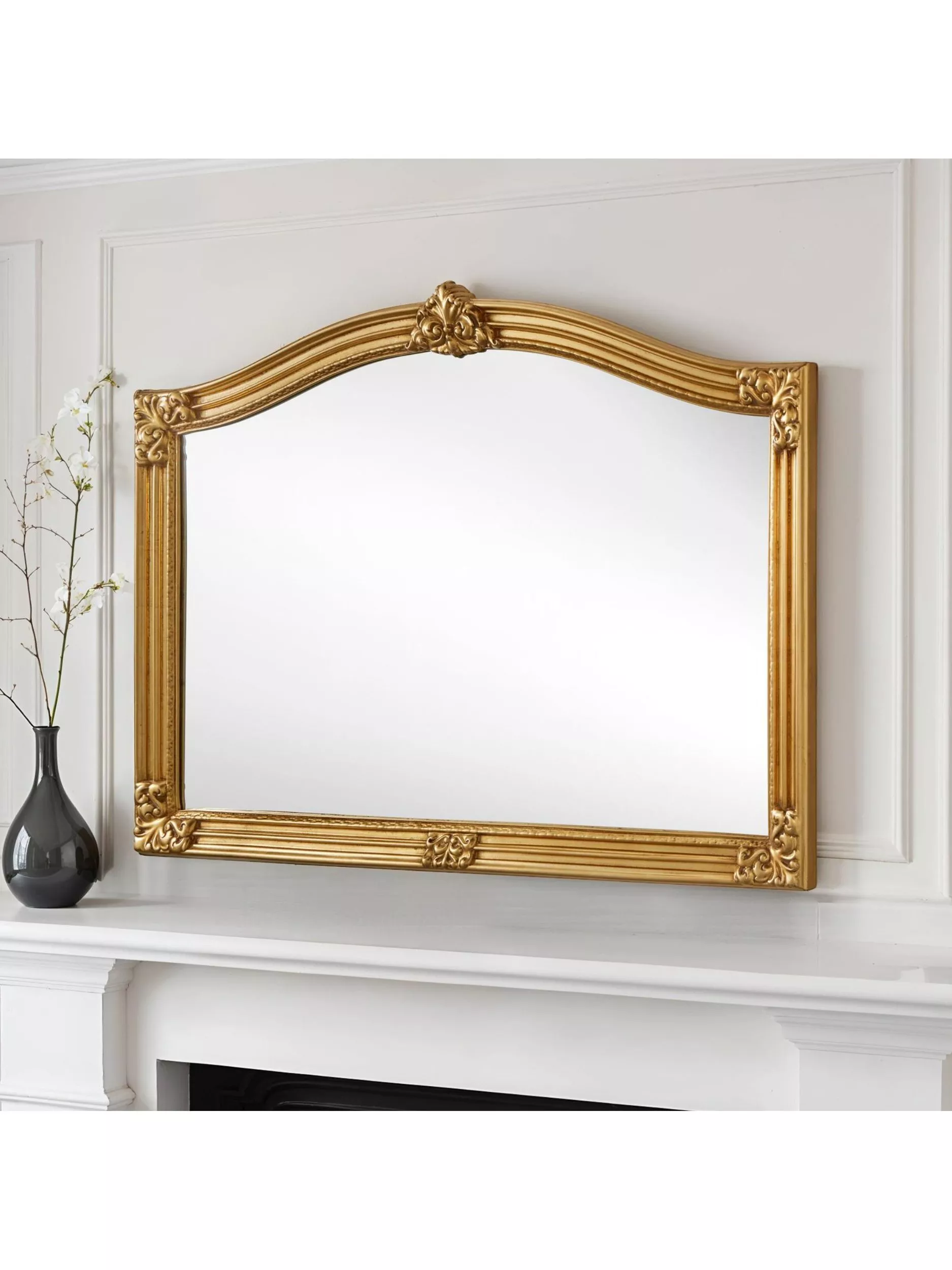 Sophisticated in a simple and classic manner, this ornate overmantel mirror makes its presence felt in a room without being too loud. It's ideal for highlighting a fireplace or nearby furniture without taking away from it. The arch in the frame features a subtle, crested detail, which adds to its charm. Handmade in London by skilled artisans.