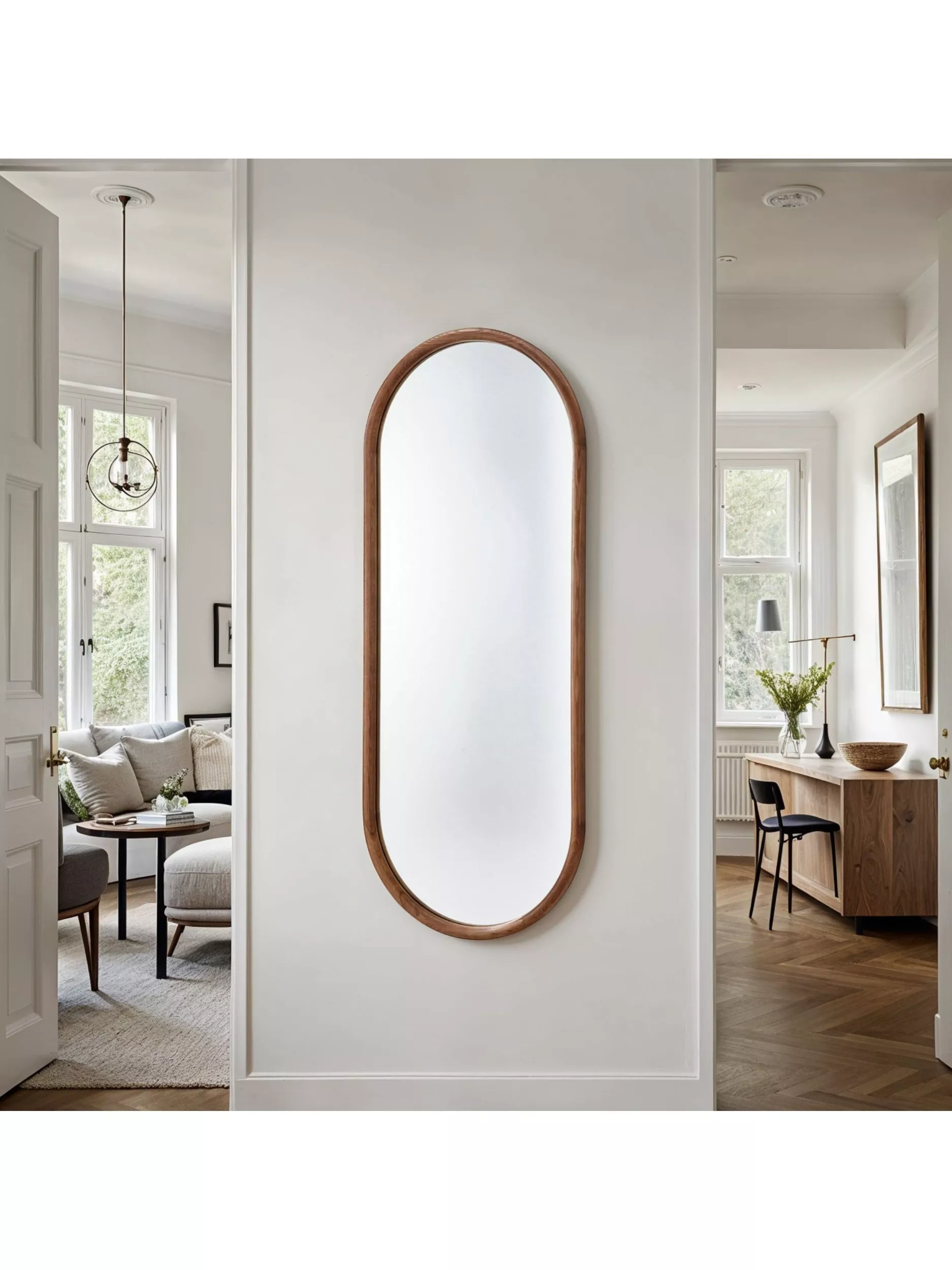 Transform a room with the stunning full-length oval wooden-framed mirror, designed to elevate your wall space. Crafted from solid oak wood, it has a smooth, curved profile. Available in a choice of natural or warm walnut finishes, with a lacquer to protect the wood yet allow the beauty of the wood grain to show.