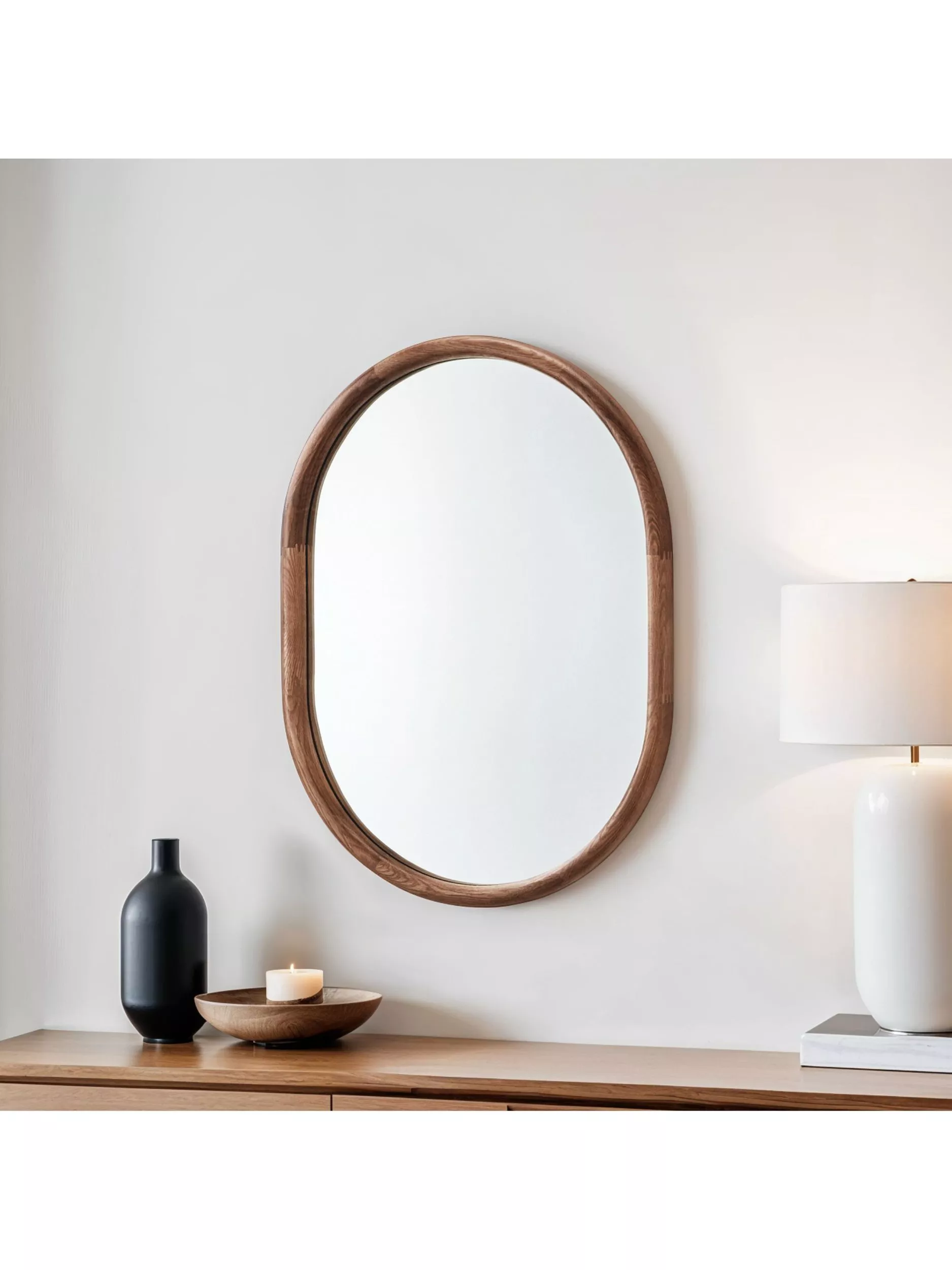 Transform a room with the stunning full-length oval wooden-framed mirror, designed to elevate your wall space. Crafted from solid oak wood, it has a smooth, curved profile. Available in a choice of natural or warm walnut finishes, this piece features a lacquer that protects the wood while allowing the beauty of the wood grain to shine through.