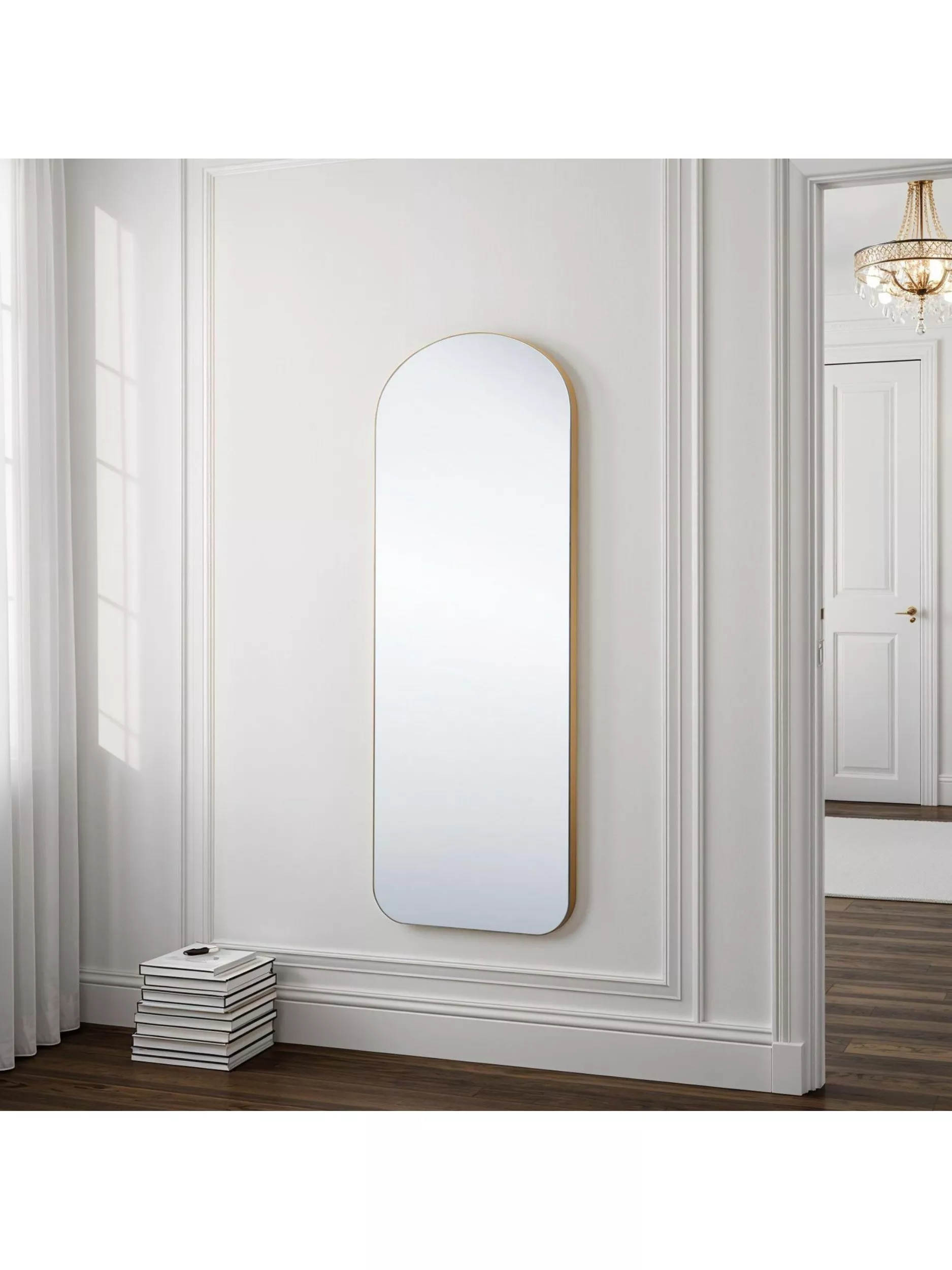 Contemporary and minimalist, this tall, arched wall mirror has curved corners for a seamless feel. The frame is constructed from wood, and the mirror glass is of high quality with a crystal-clear reflection. Two hanging hooks are attached to the back of the mirror, one at each side, to enable vertical wall mounting. Handmade in the UK by skilled artisans.