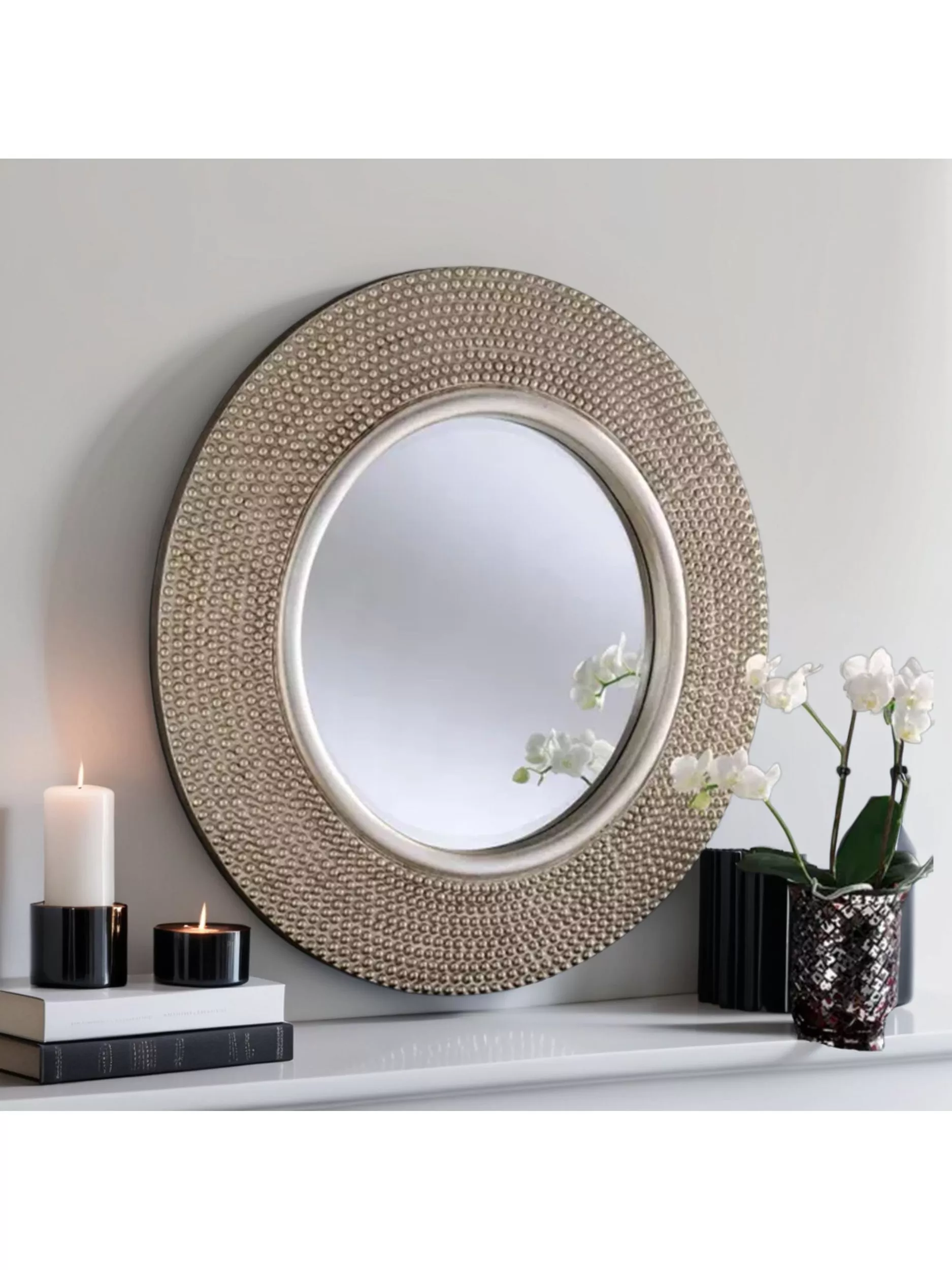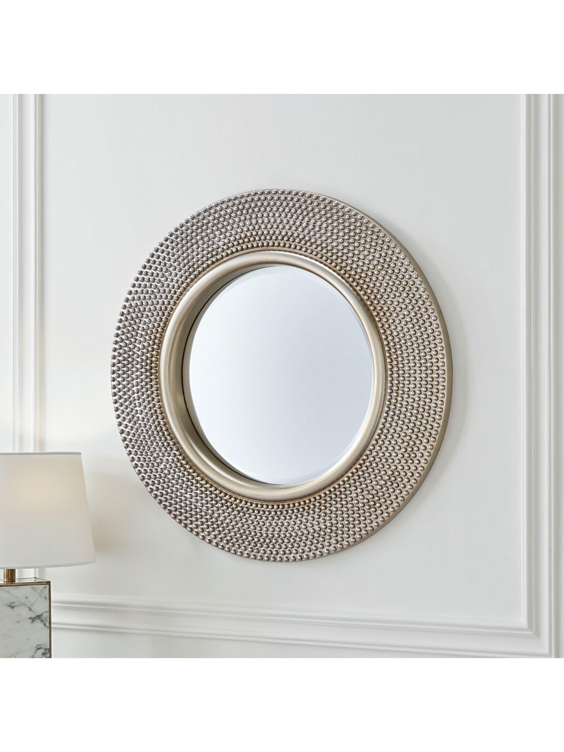 Captivating round wall mirror with a large, eye-catching frame in a beautifully textured, studded design. This versatile piece has been made to the highest quality to suit a wide range of interior design schemes.
