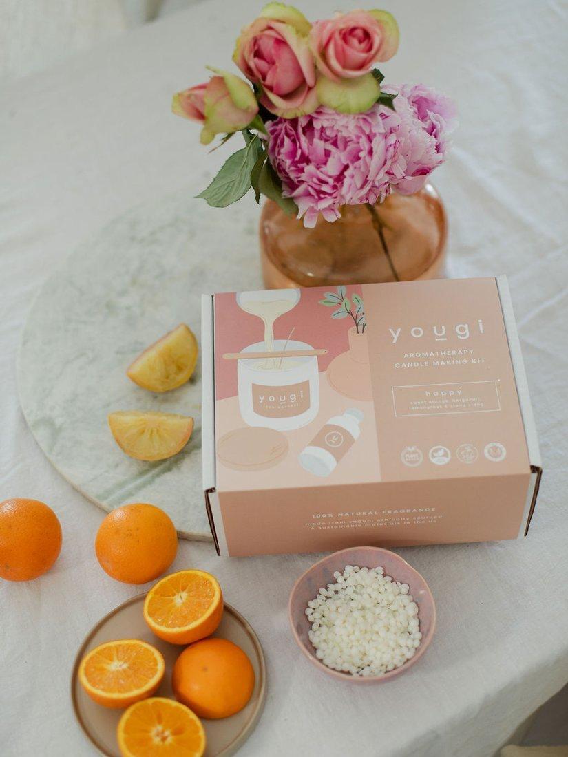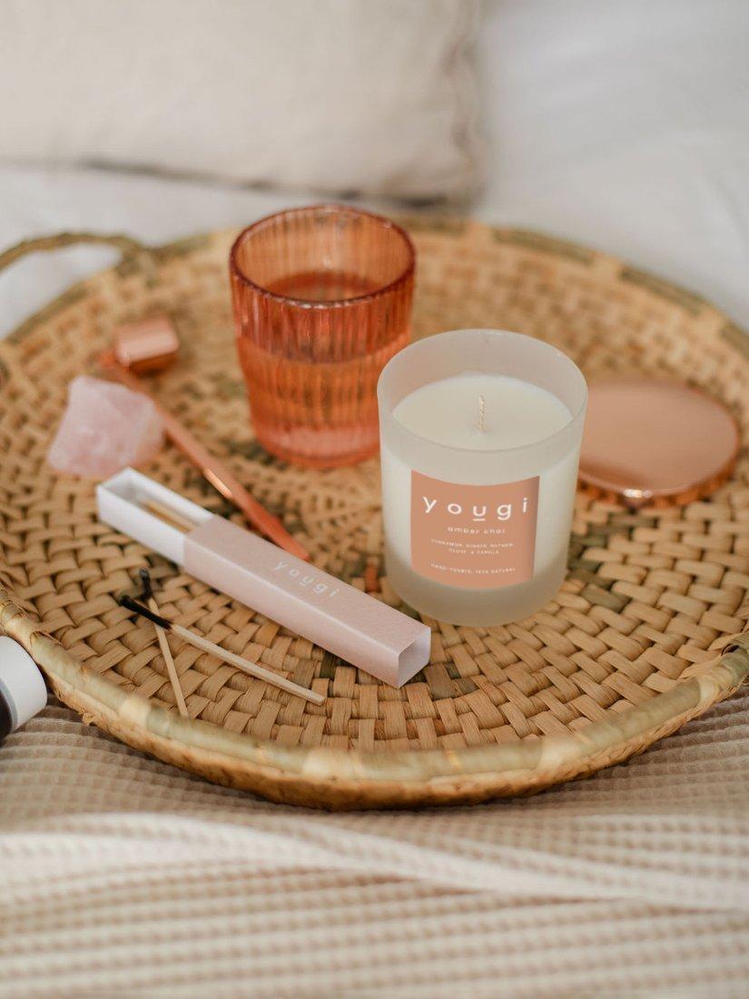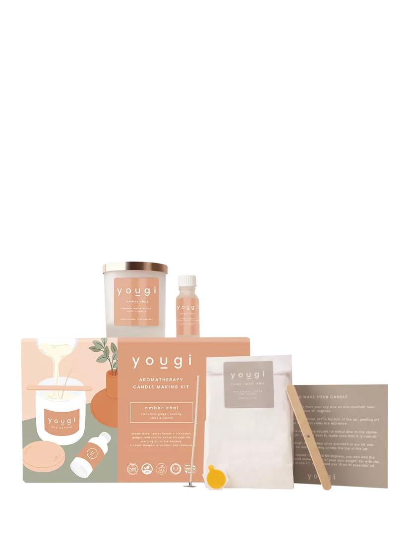 The Yougi Amber Chai candle kit contains everything you'll need to make 100% natural candles at home. Start by heating the wax, blending the oil, setting up the wick, and finish by pouring your 165ml candle.