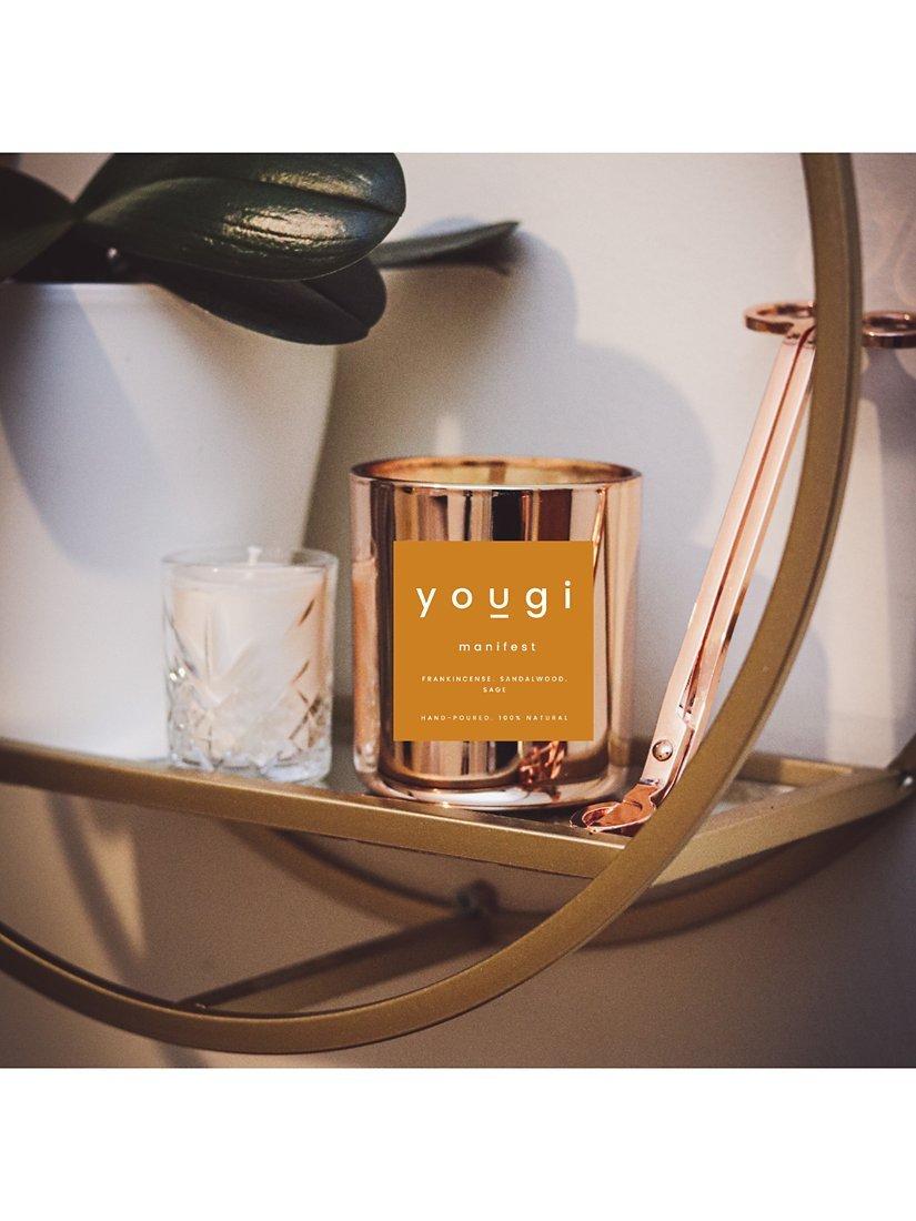 The Yougi candle kit contains everything you'll need to make 100% natural candles at home including essential oils, eco-soy wax, a wick and a copper-plated glass container.