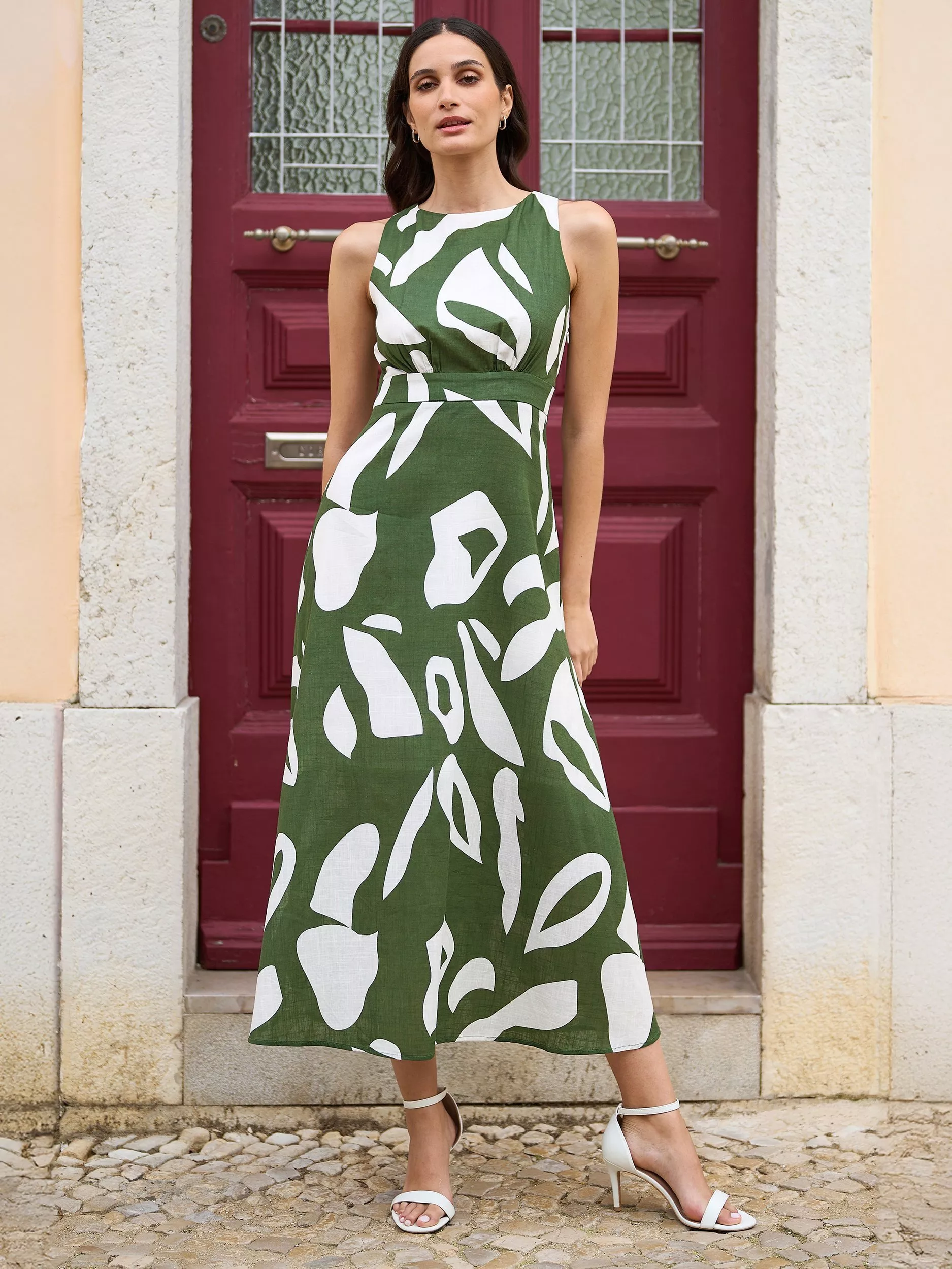 Made from lightweight cotton for a summer feel this maxi dress from Yumi is the ultimate holiday dress. In a simple and elegant midi shape, with all over abstract print and that gorgeous tie in the back for extra details. Wear with sandals and a wicker bag to complete the look.