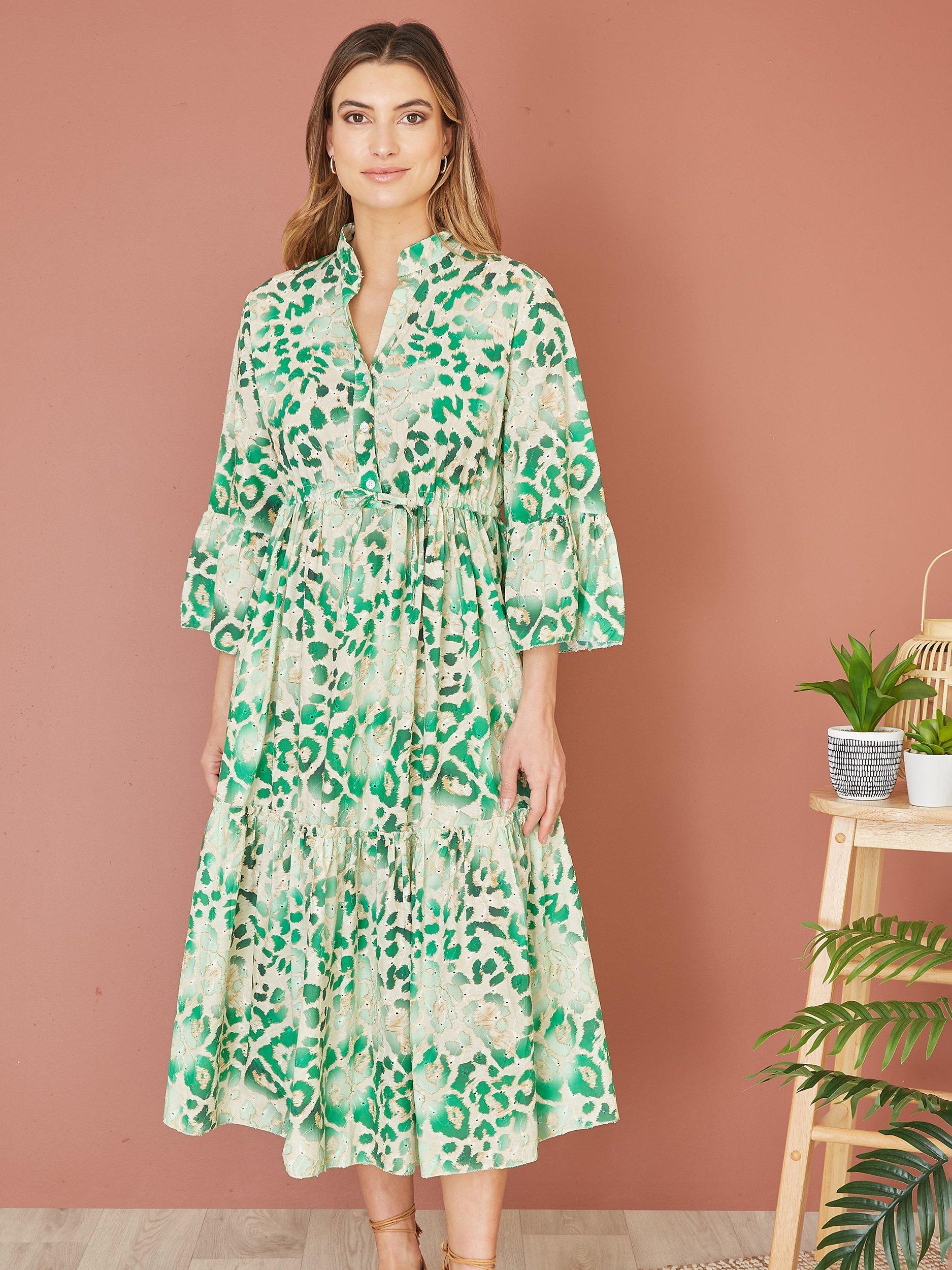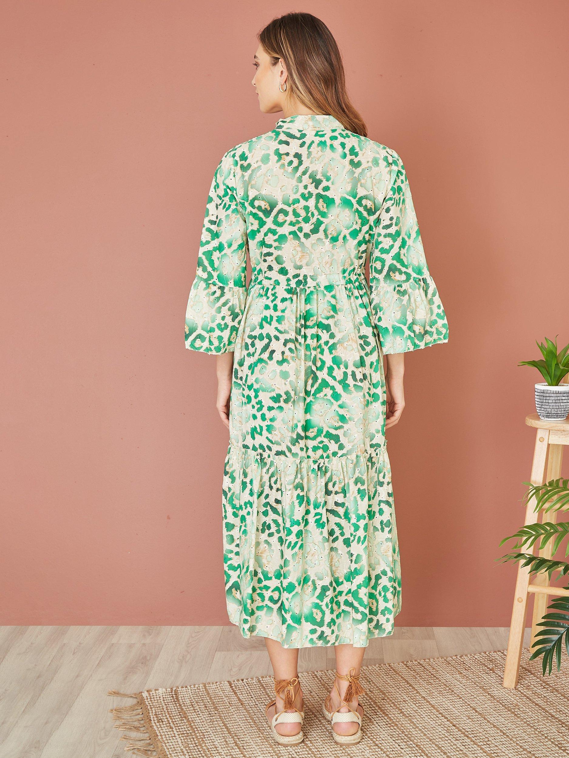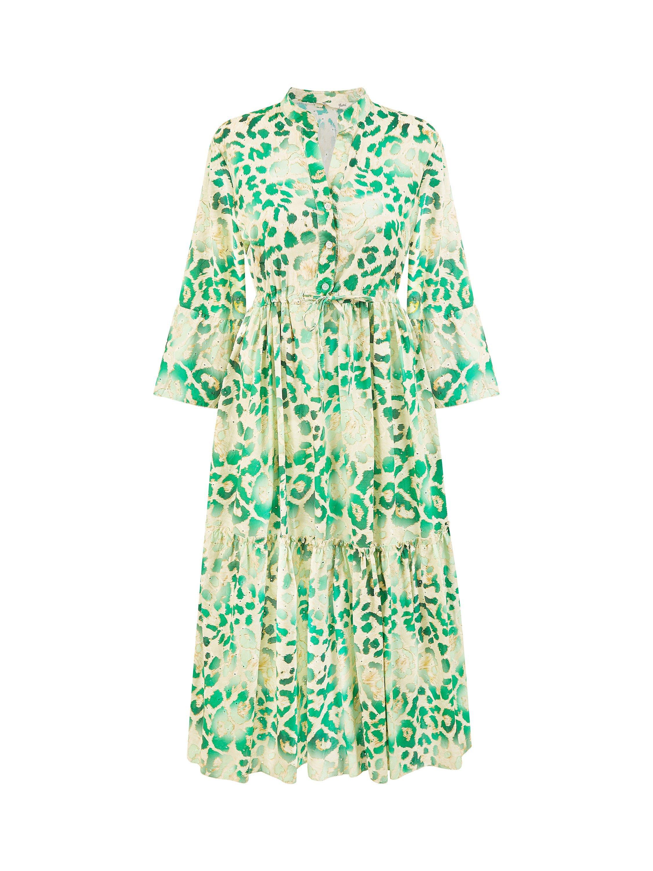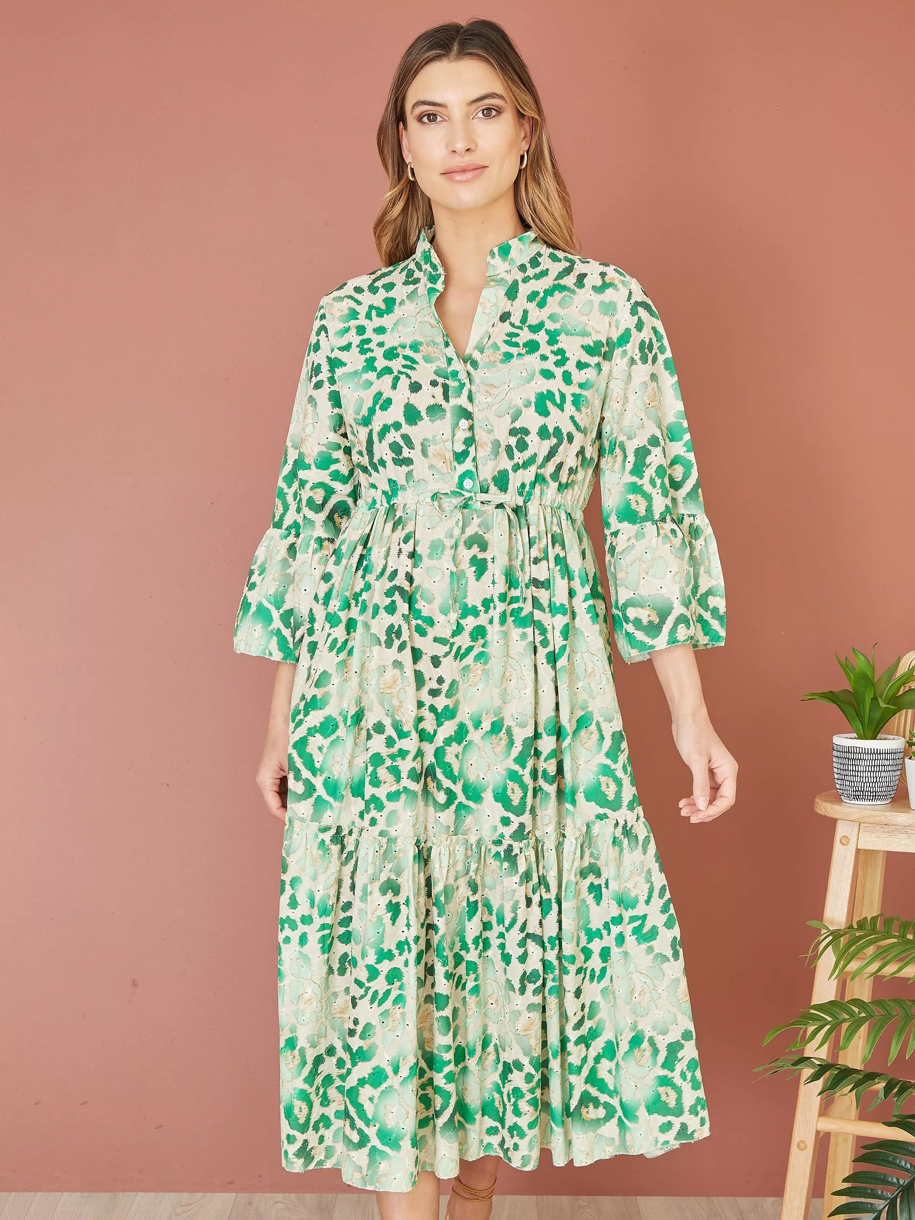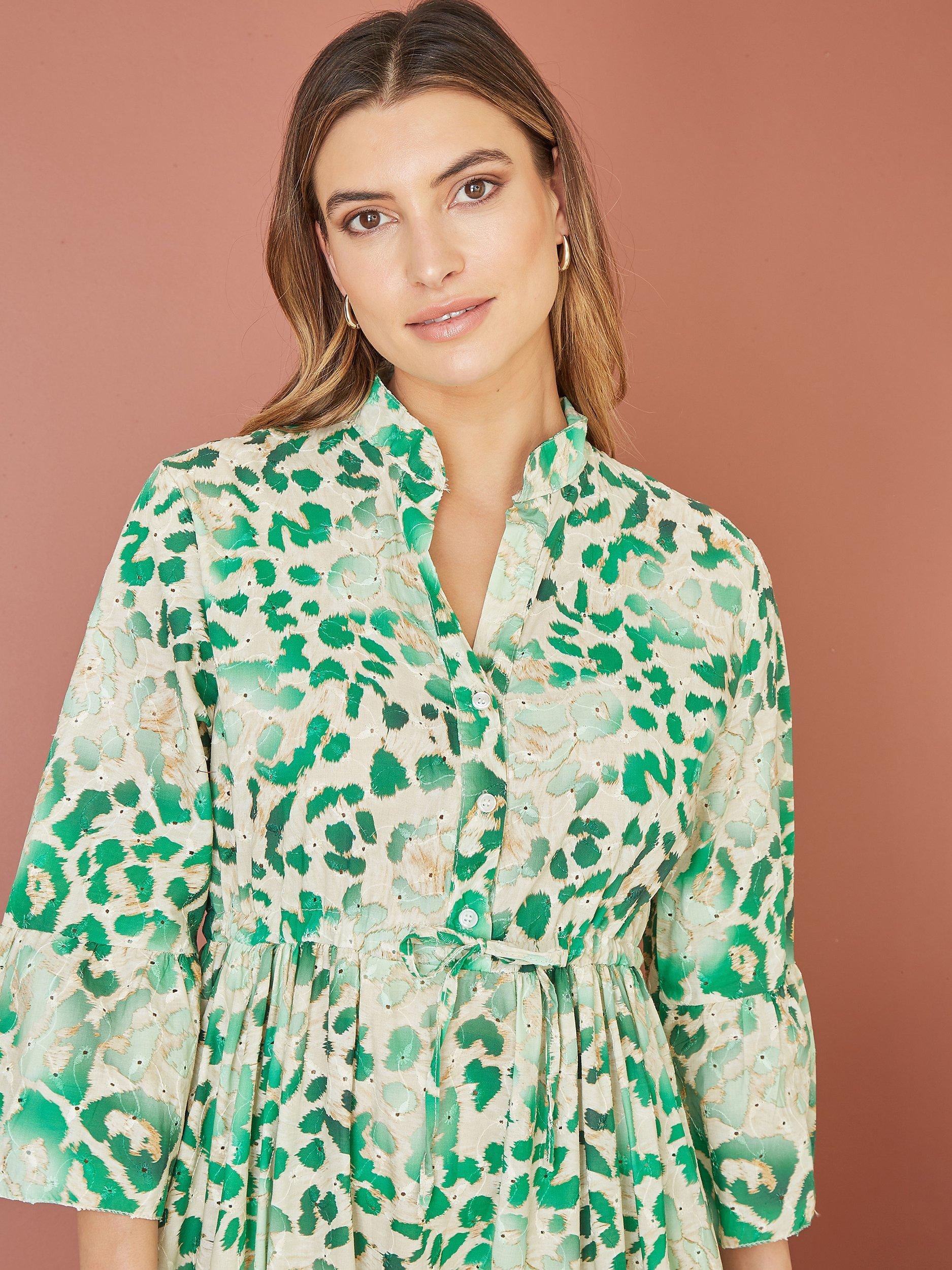 With a tiered design for added movement, this midi dress from Yumi comes in featherlight cotton. Confidently cut with a collar and three quarter length sleeves, this style takes animal print up a notch.