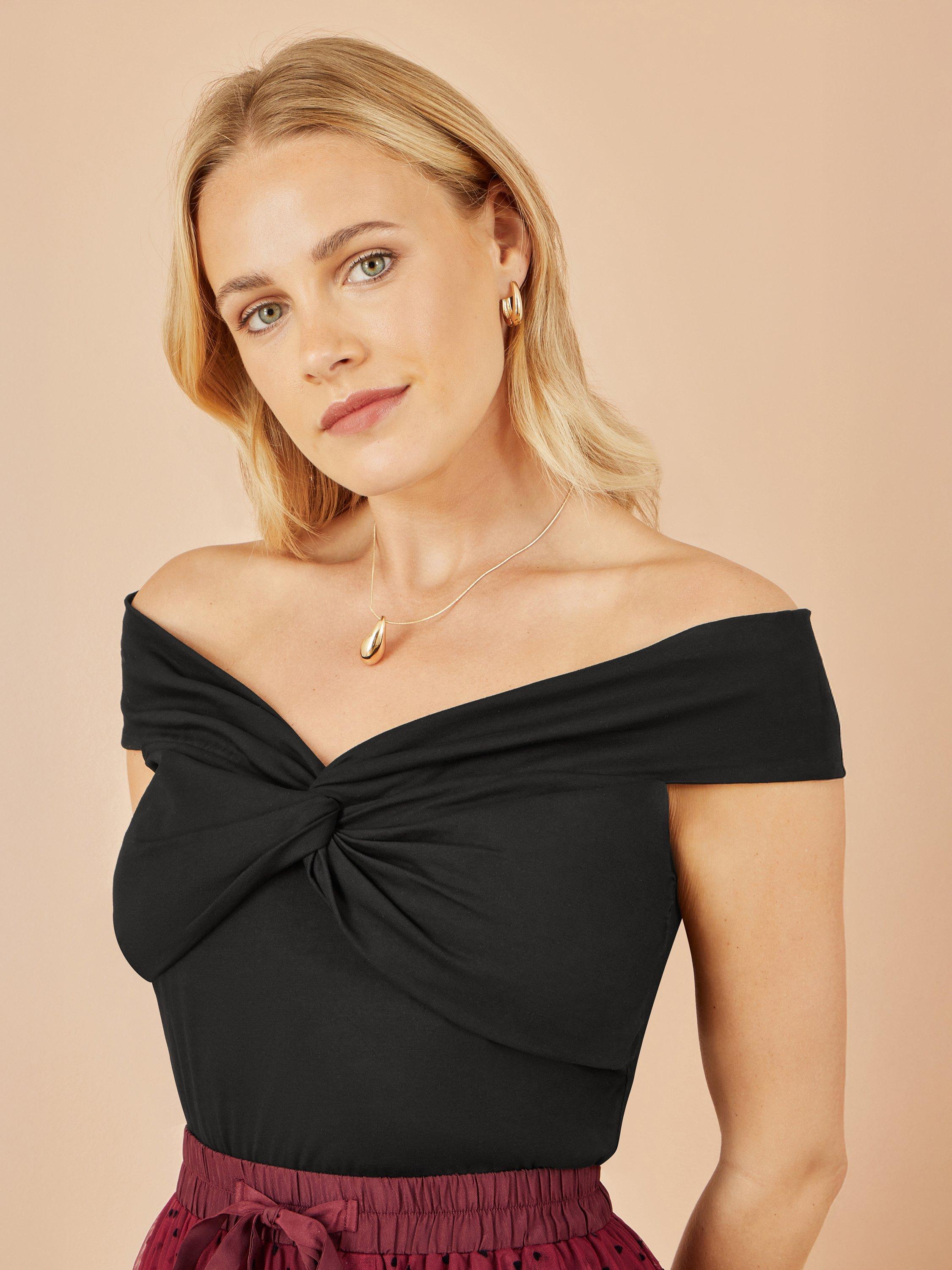 This super cute twist front top looks gorgeous paired with a soft and feminine floaty skirt this season. The off-the-shoulder Bardot style is super flattering and easy to wear, paired with the soft jersey fabric, this little top is a winner for the summer months.