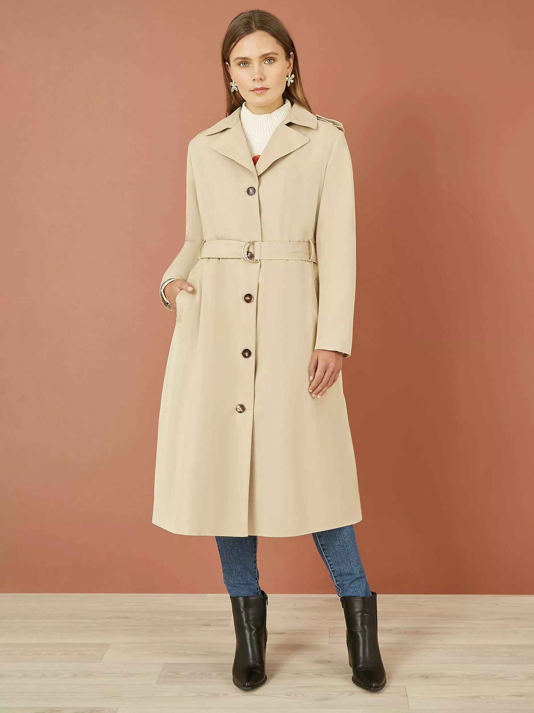 Trench coats are a timeless classic for a reason - Oozing elegance whilst being a practical option for everyday wear. This design from Yumi is a fantastic version, with all the features you expect from the wardrobe staple. Pretty lapels, button down, matching neat belt at the waist in a midi length. We love this over a relaxed fit of jeans and T-shirt for everyday, or add it over any work outfit to mean business.